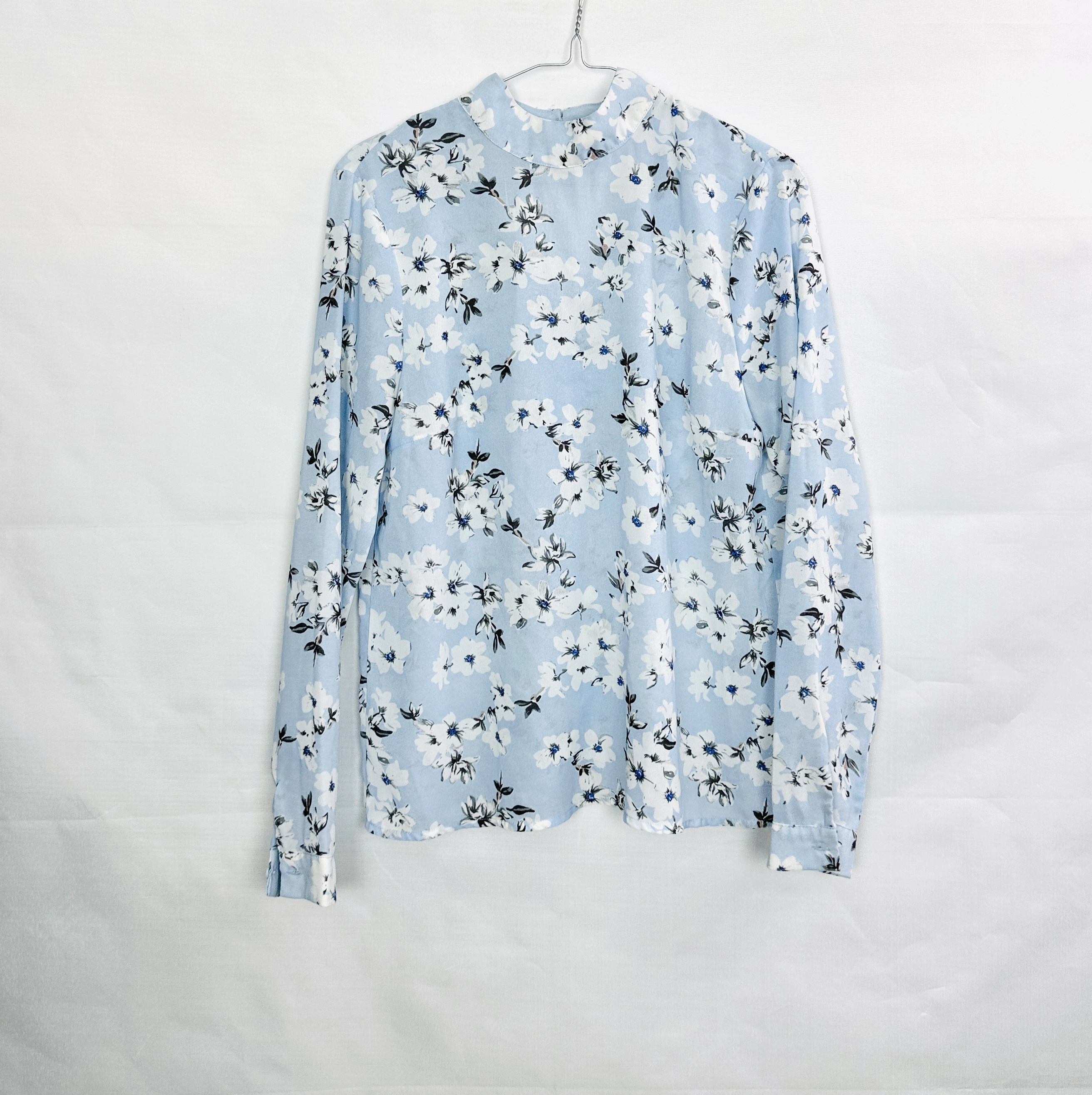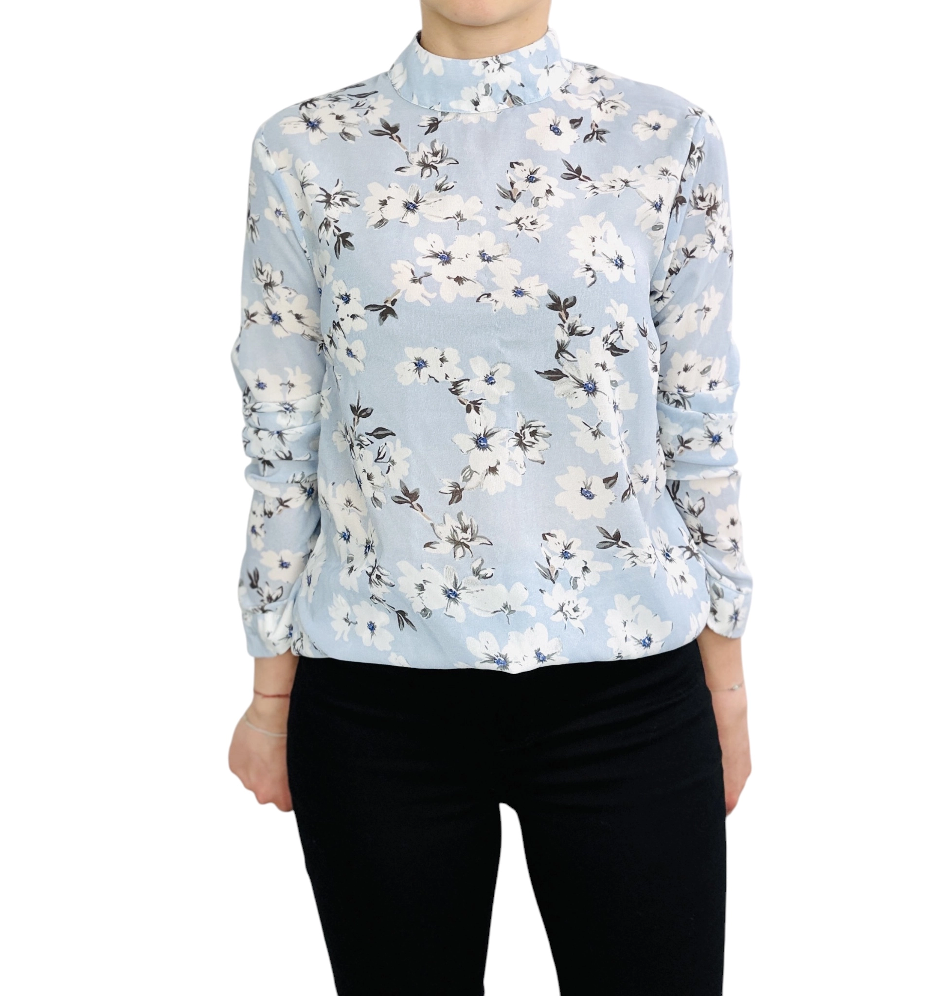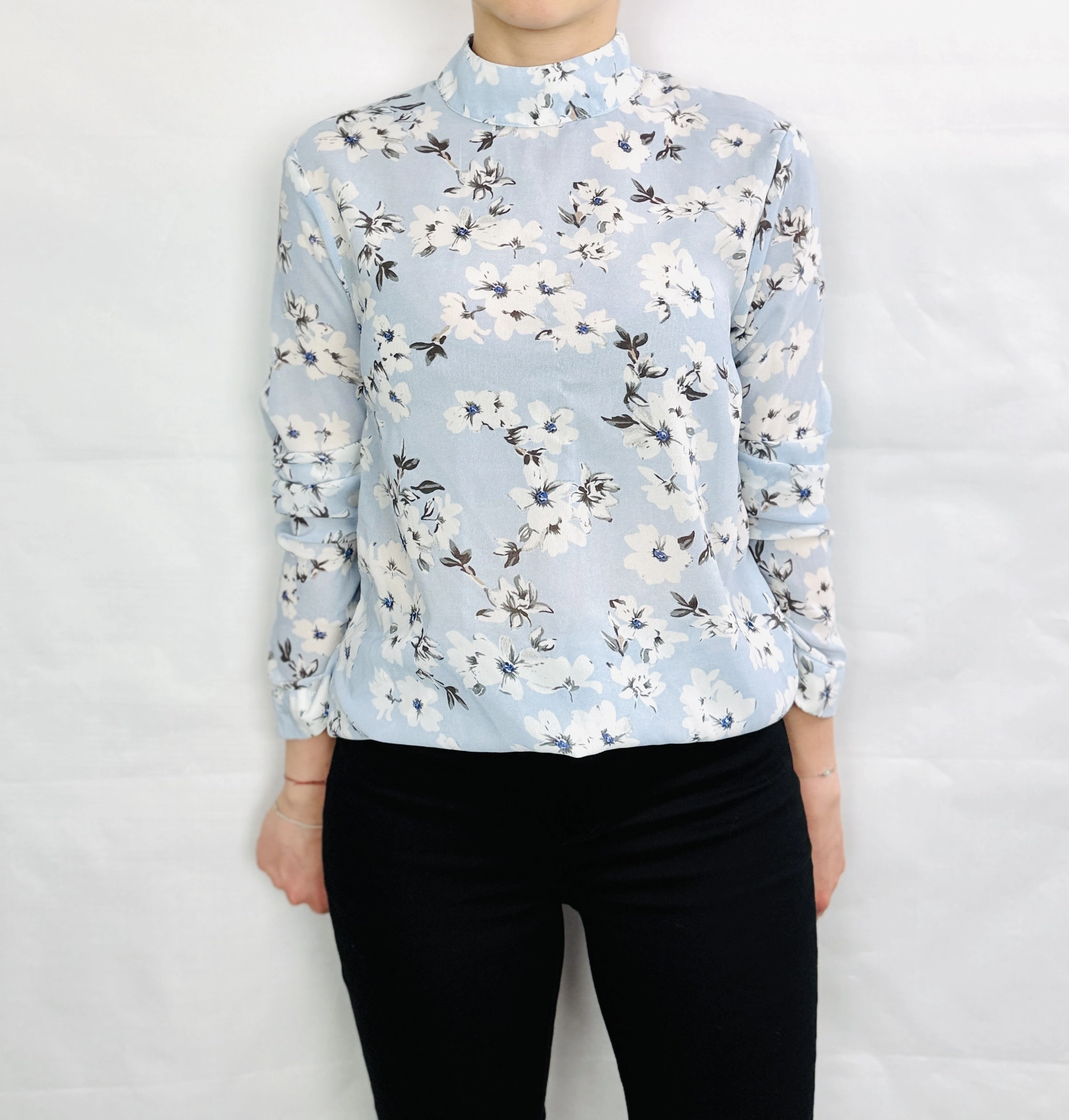 Błękitna bluzka w kwiaty z wysoką stójką S 36