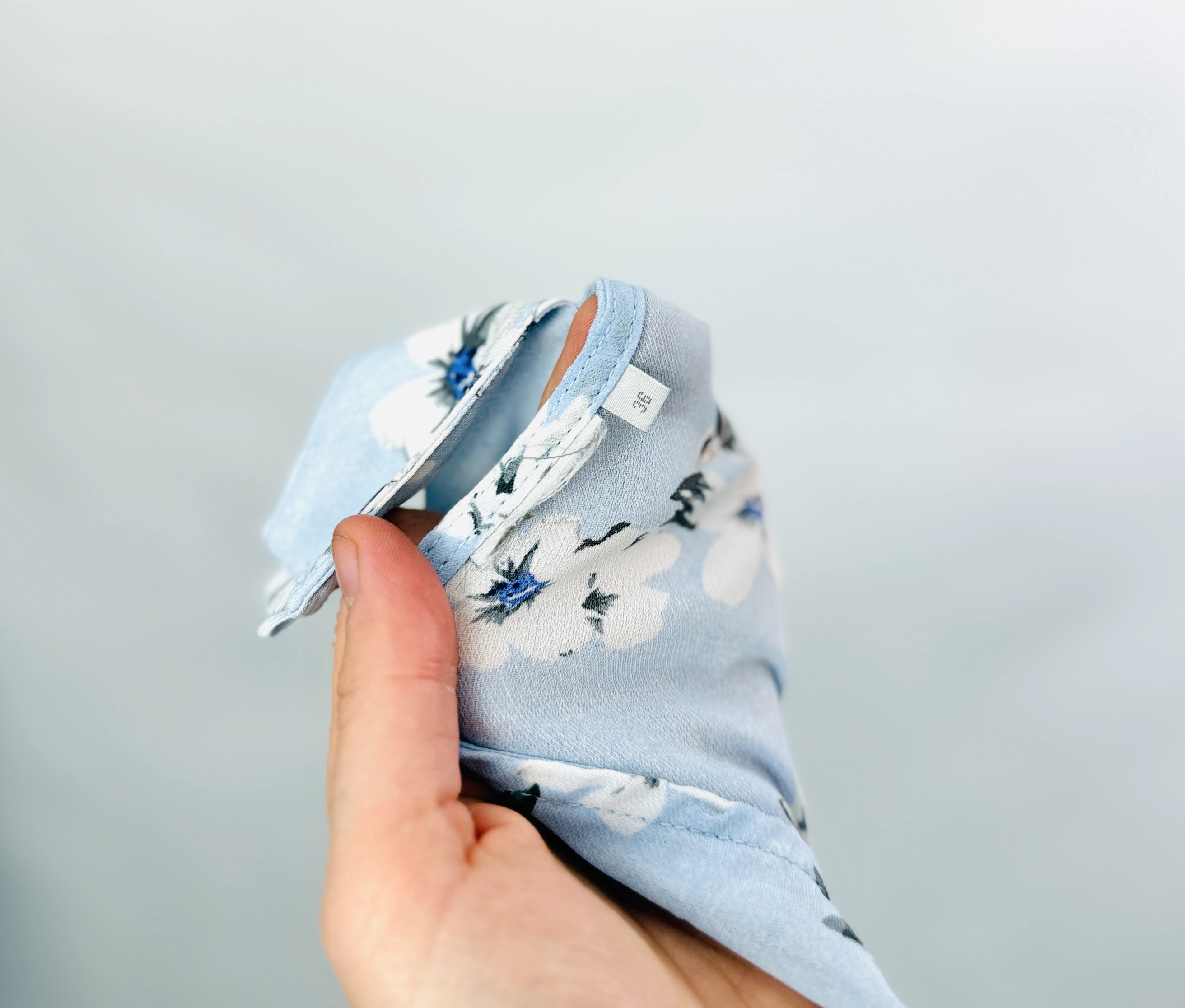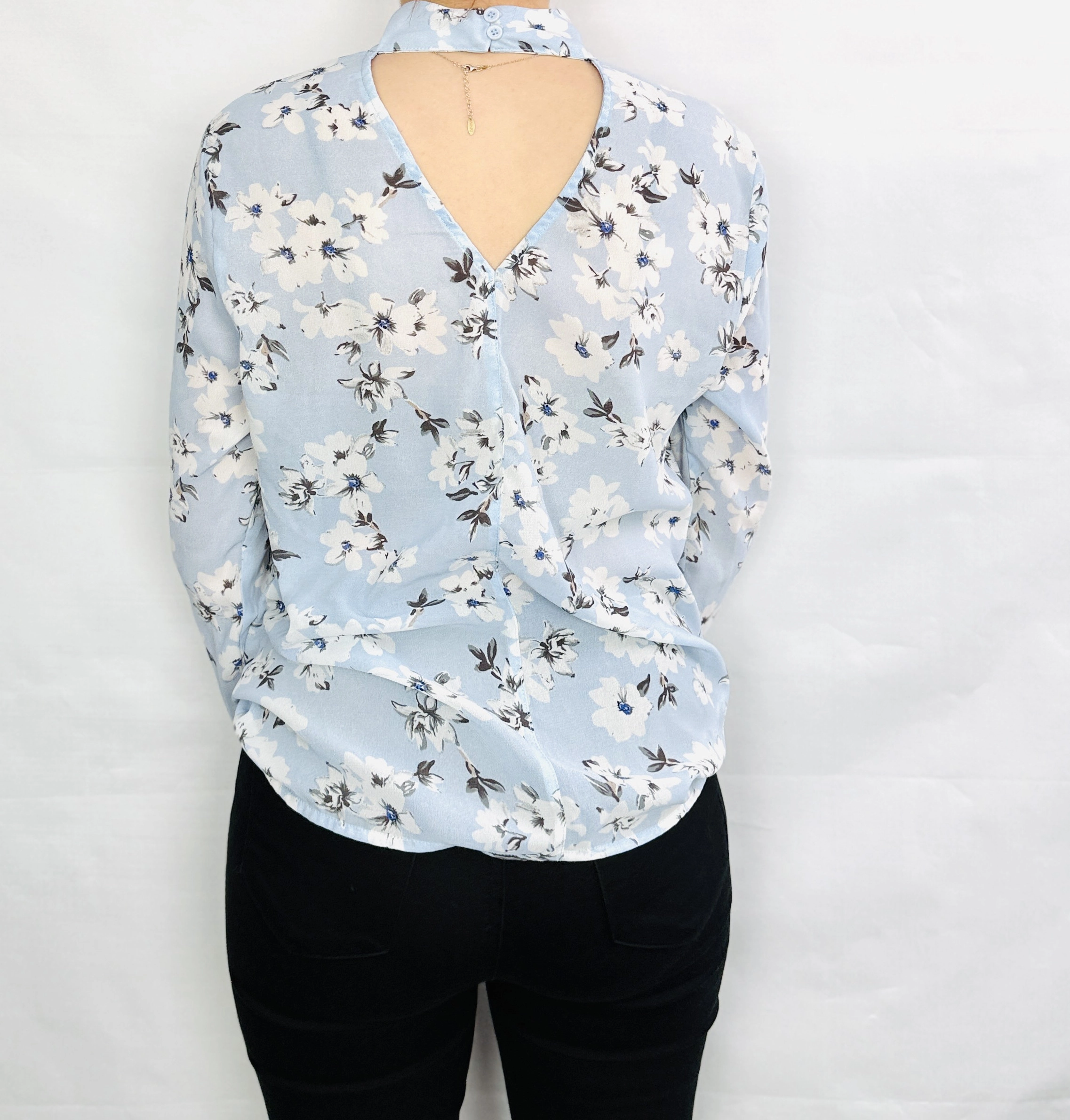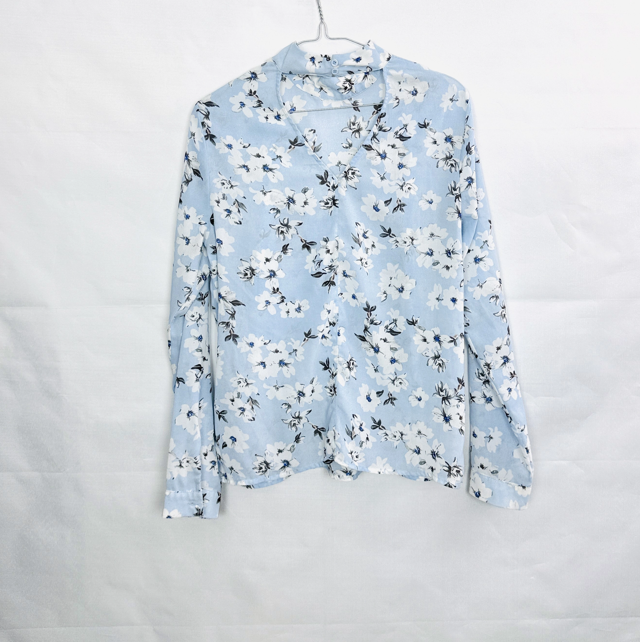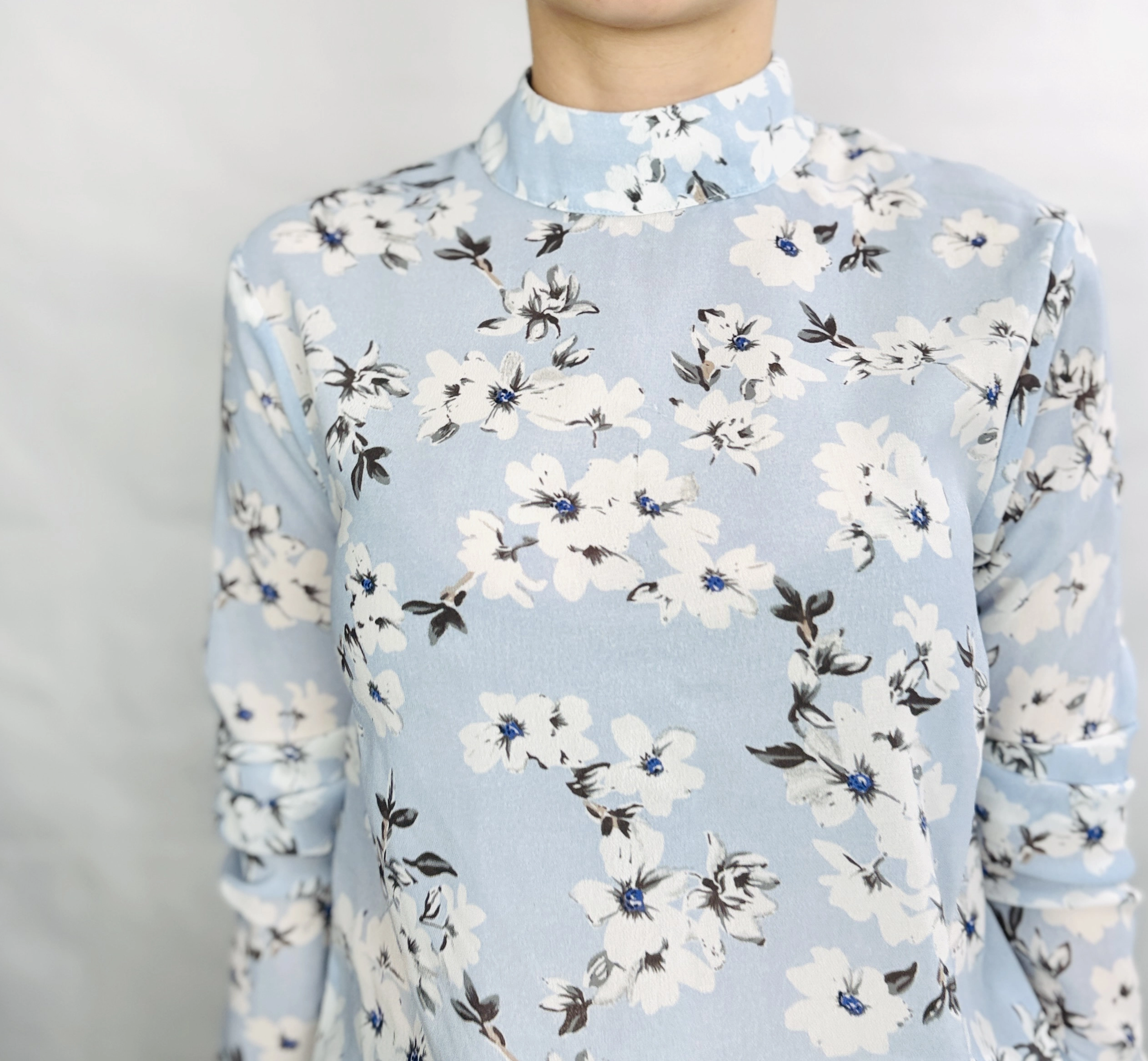 Błękitna bluzka w kwiaty z wysoką stójką S 36