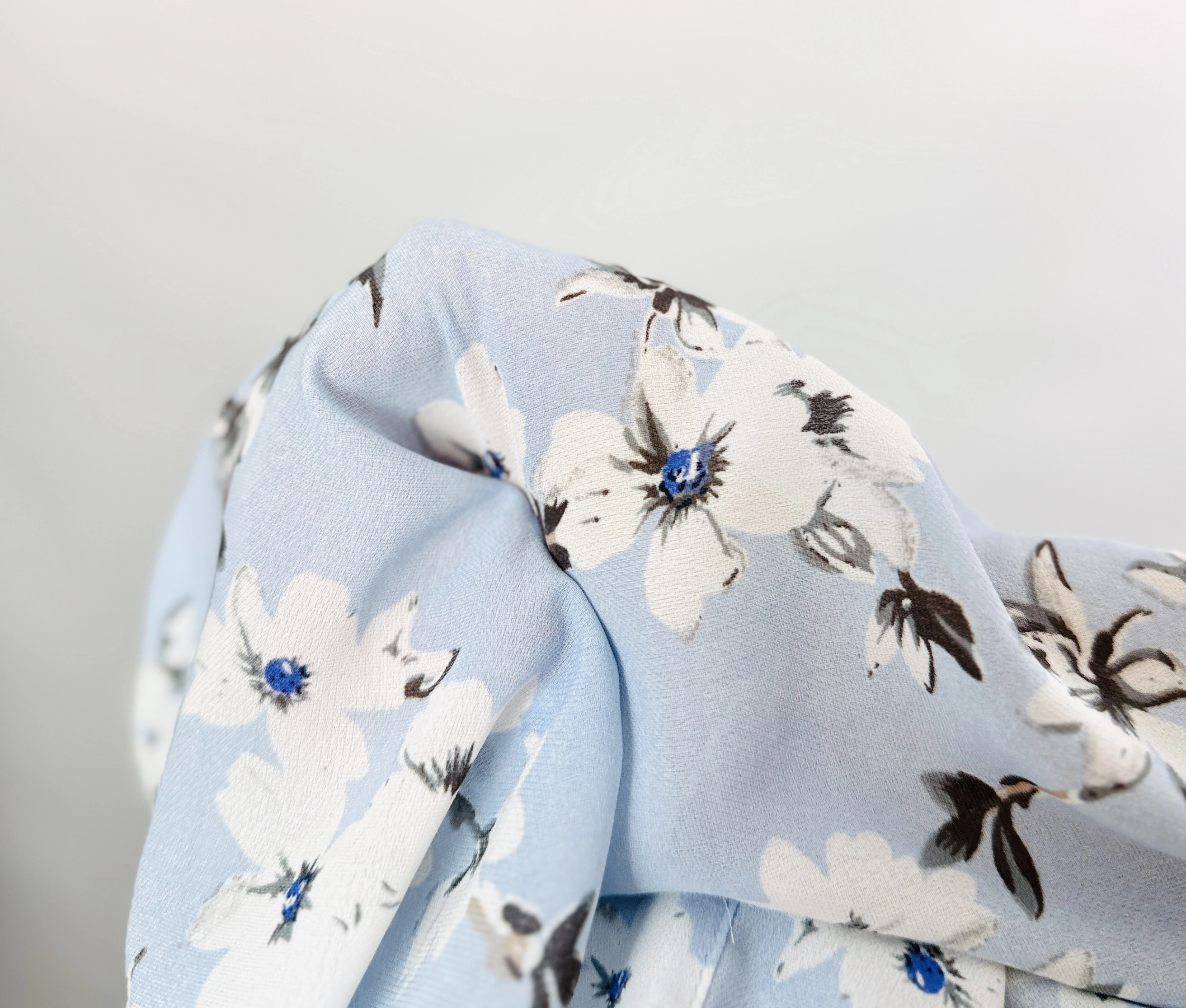 Ta błękitna bluzka to kwintesencja subtelnej elegancji i romantycznego uroku, które doskonale wpisują się w kobiece, wiosenno-letnie stylizacje. Delikatny, pastelowy odcień błękitu tworzy świeżą i lekką bazę, na której rozkwitają białe kwiaty z ciemniejszymi akcentami, nadając całości naturalnego, malarskiego charakteru. To ubranie, które emanuje spokojem i delikatnością, idealne dla kobiet ceniących sobie modę z klasą i wyrafinowany styl.