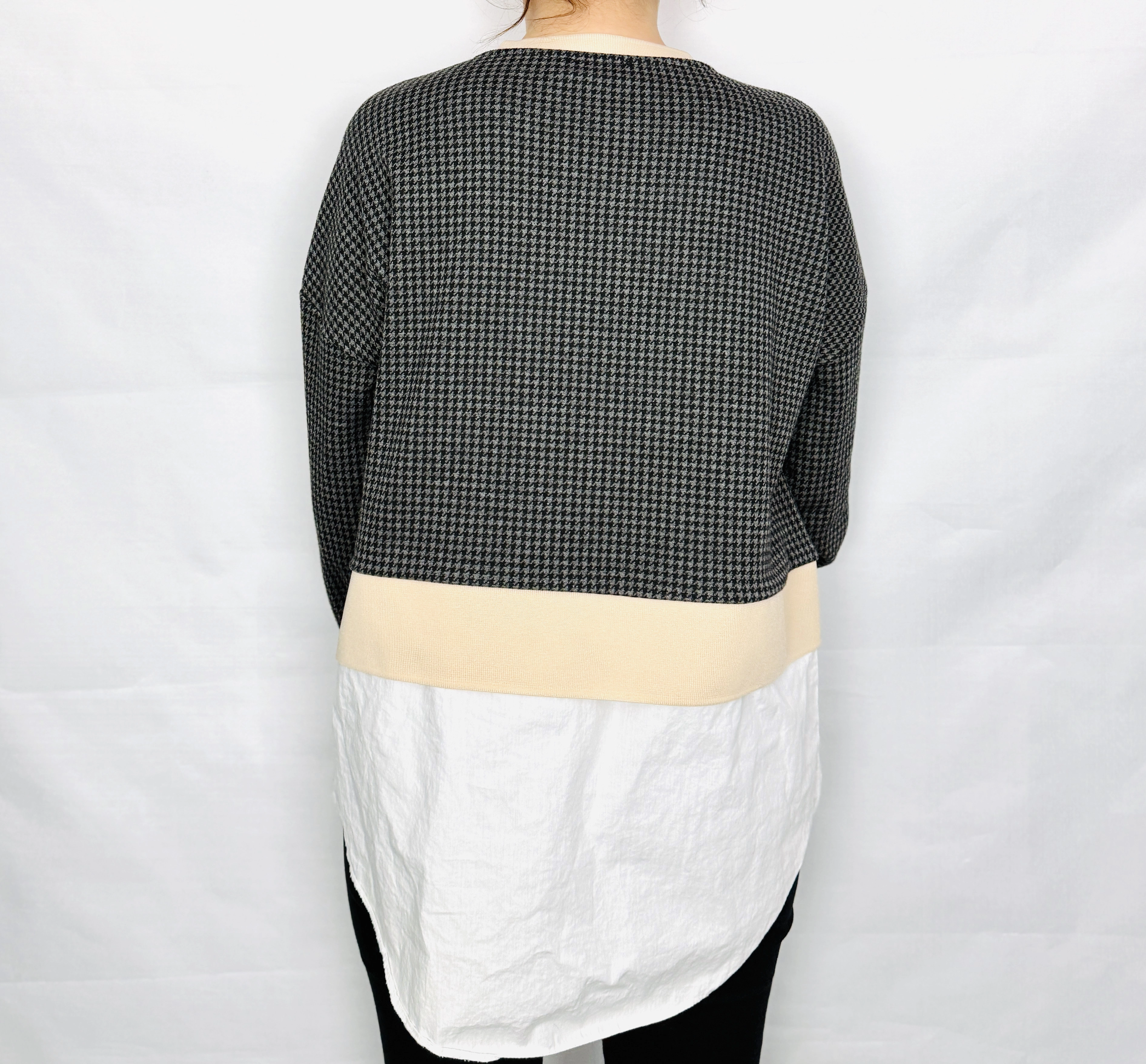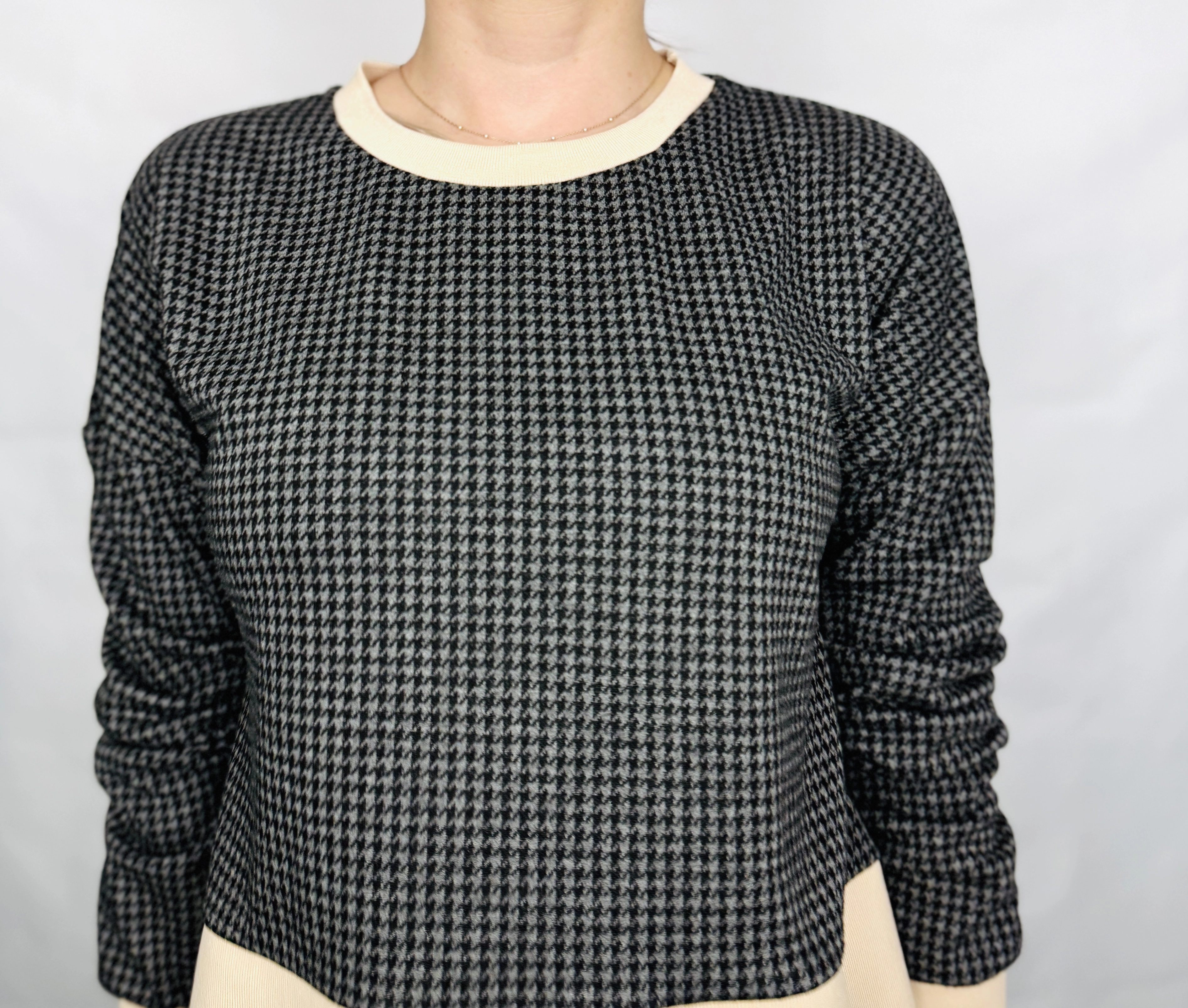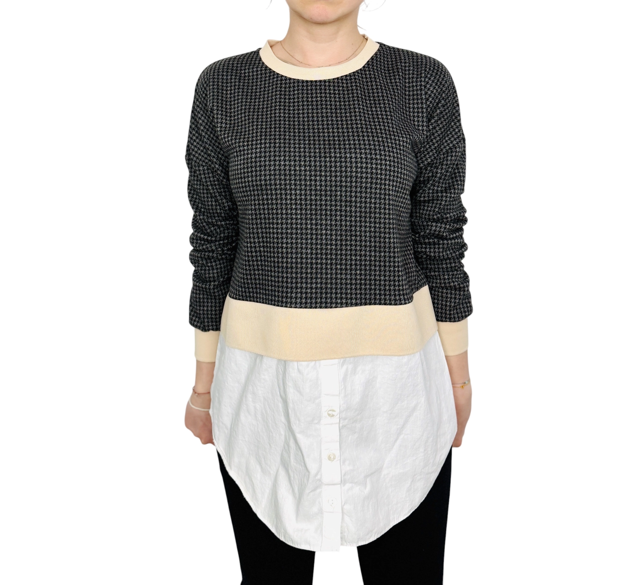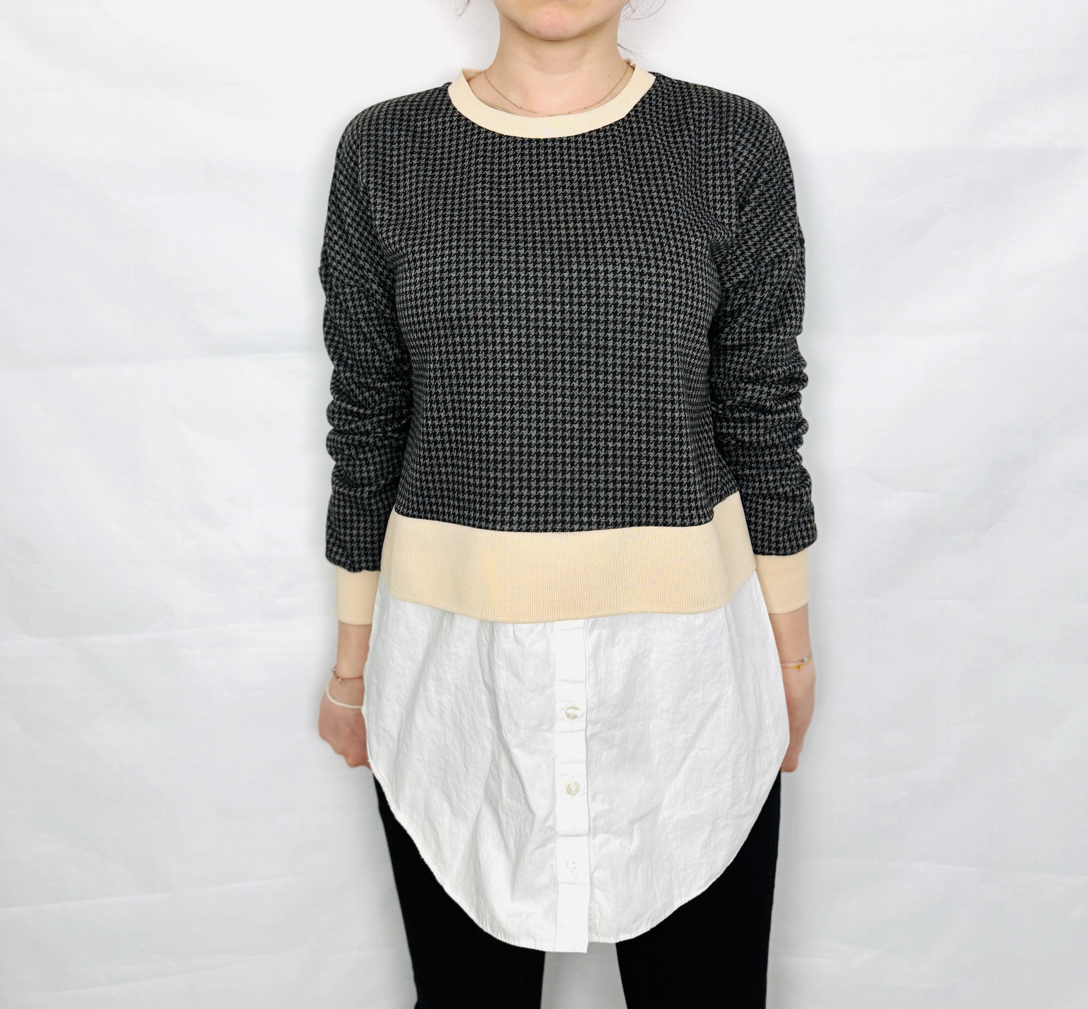 Fason bluzy jest prosty i lekko luźny, dzięki czemu komfortowo układa się na sylwetce. Górna część wykonana jest z miękkiej, nieco grubszej dzianiny o wyraźnej strukturze pepitki, która nadaje jej charakteru i sprawia, że całość wygląda bardziej wyrafinowanie niż klasyczna bluza. Okrągły dekolt wykończony jest gładkim, jasnym ściągaczem, który harmonizuje z dolną częścią stylizacji. Długie rękawy mają swobodny krój i zakończone są dopasowanymi mankietami, co podkreśla casualowy charakter modelu. Najbardziej wyróżniającym elementem jest koszulowa wstawka u dołu – lekka, delikatnie odstająca, z widocznym zapięciem na guziki, która nadaje całości efekt warstwowego zestawu.