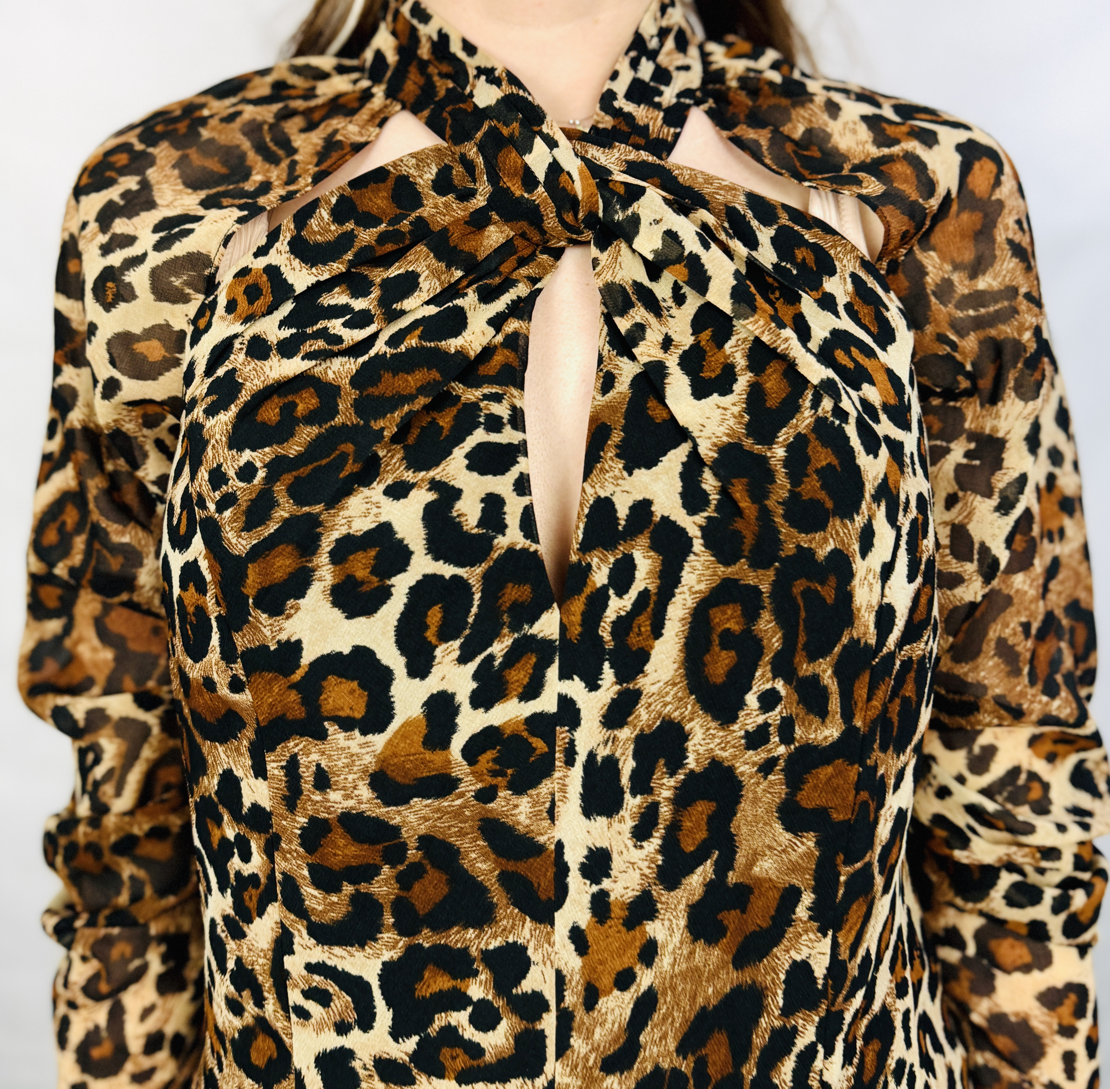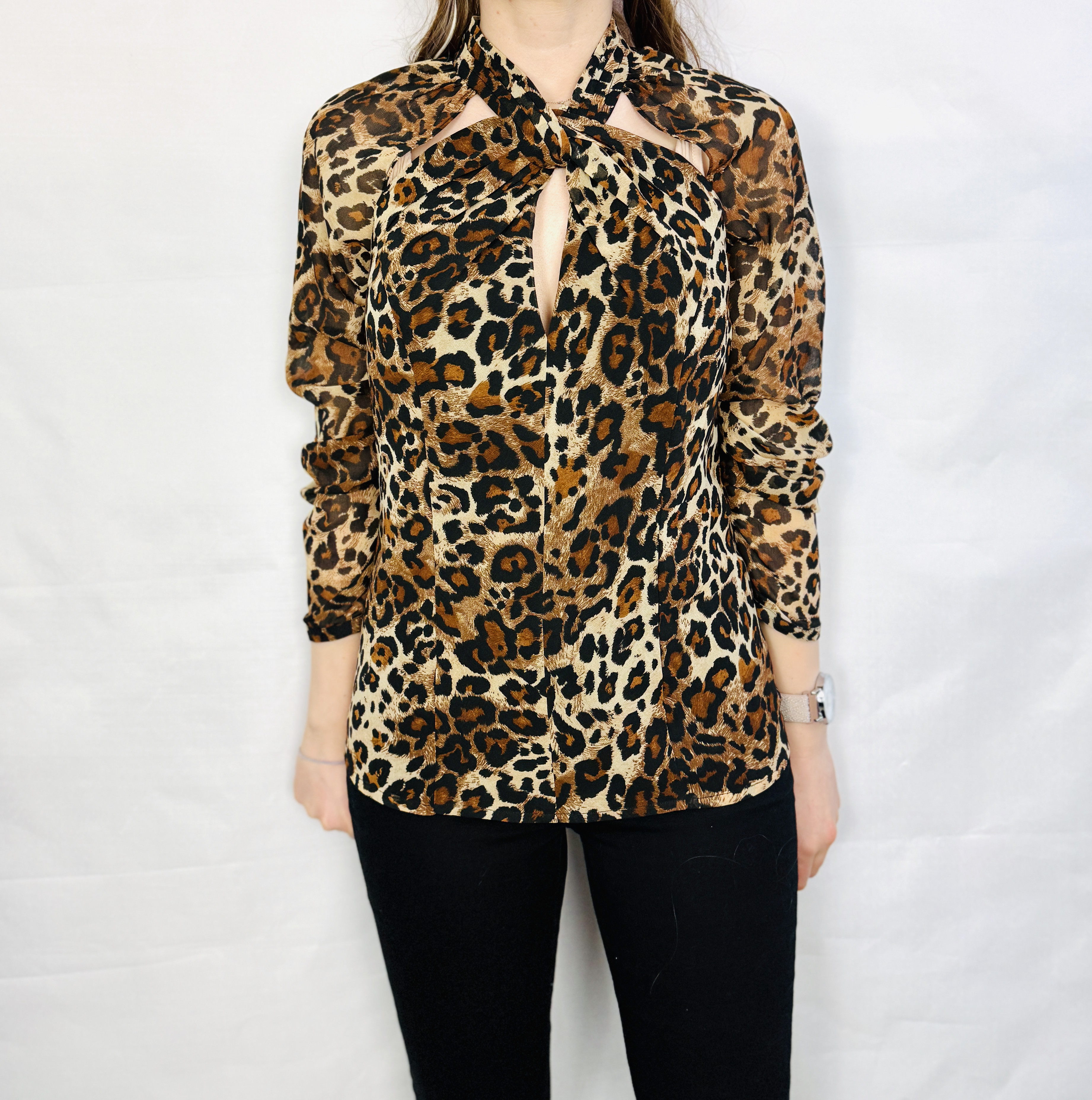 Ta bluzka emanuje zmysłową pewnością siebie i wyrafinowaną odwagą. Cętkowany wzór w ciepłych odcieniach brązu, czerni i kremu nadaje jej dziki, a jednocześnie elegancki charakter, który przyciąga wzrok, nie będąc krzykliwym. Projekt łączy w sobie kobiecą subtelność z modowym temperamentem, tworząc ubranie, które świetnie wpisze się w stroje zarówno na wieczorne wyjście, jak i bardziej stylowe, codzienne zestawienia. To propozycja dla osób, które lubią wyraziste wzory, ale cenią sobie proporcje i klasę.