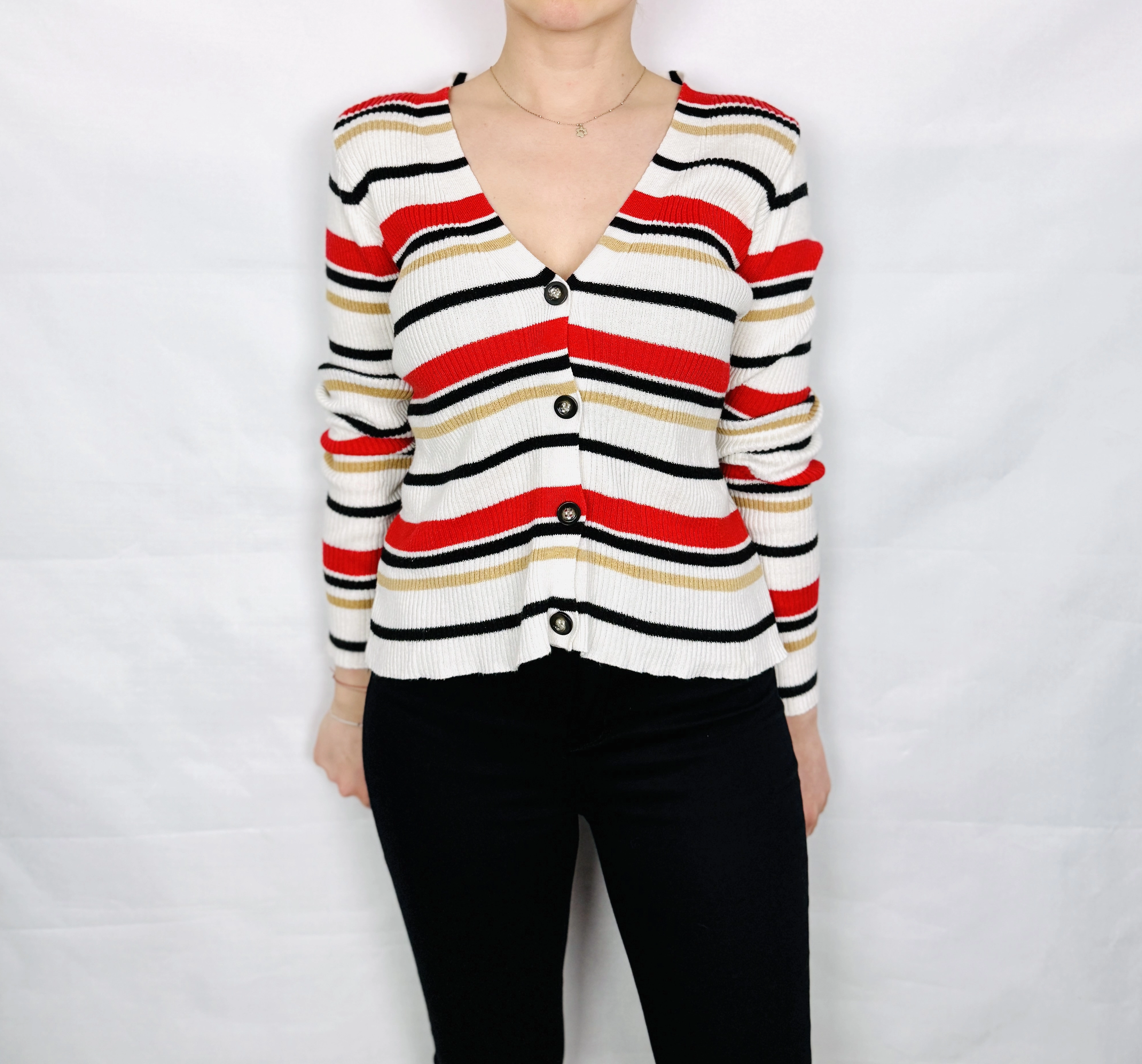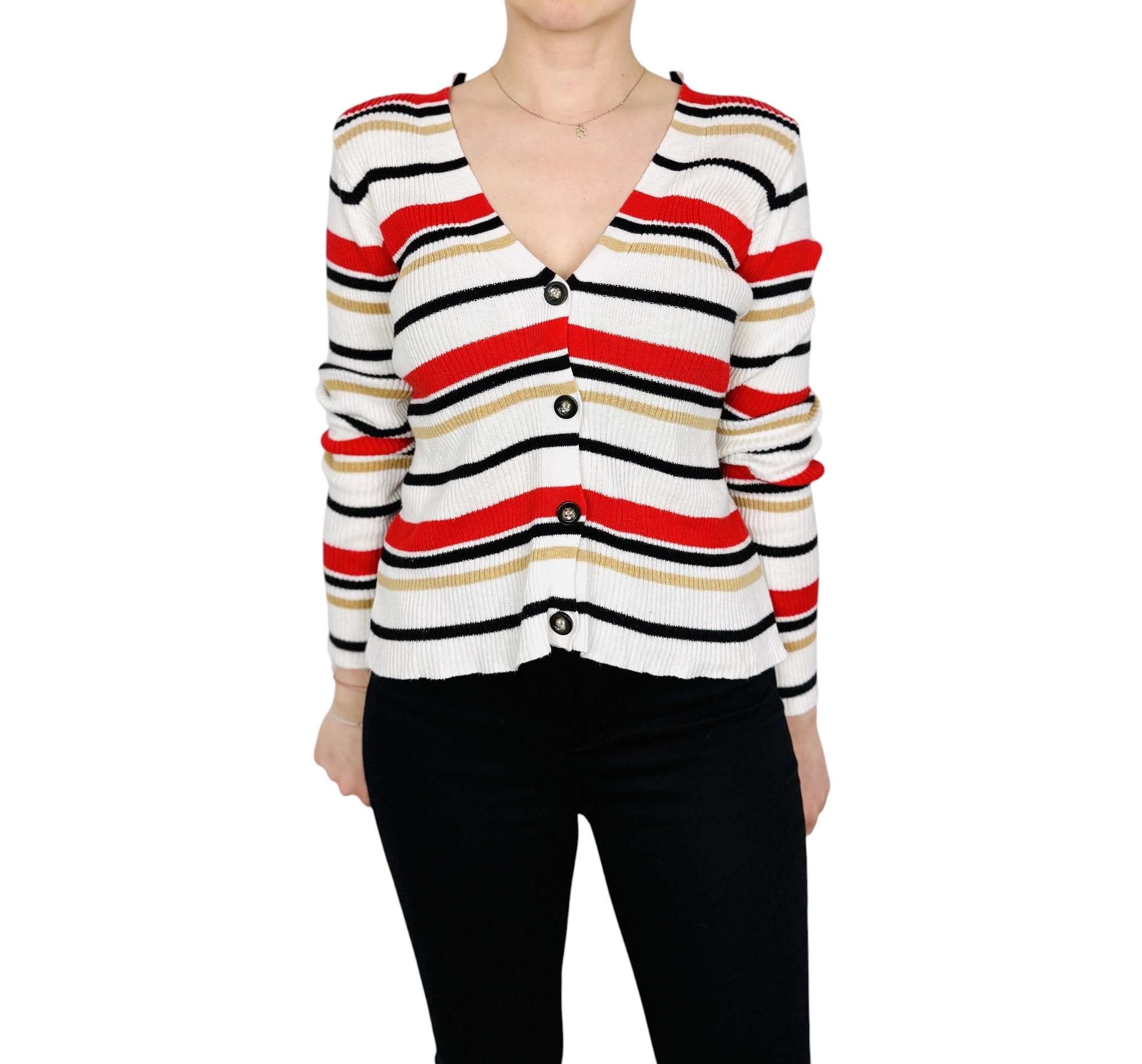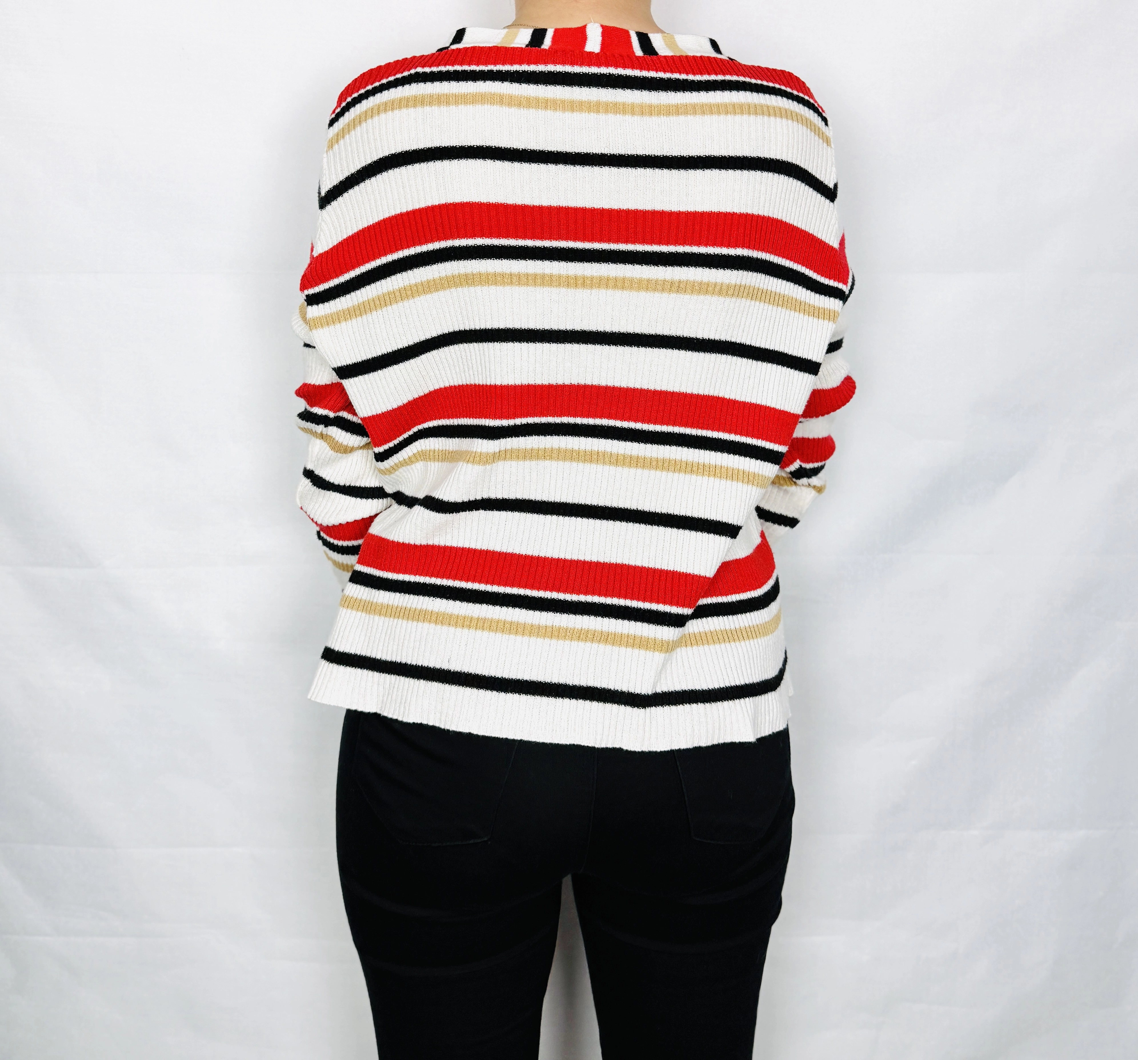 Ta dzianinowa bluzka to radosna i nastrojowa propozycja, która wnosi do garderoby powiew świeżości i nowoczesnej klasyki. Harmonijne połączenie bieli, intensywnej czerwieni, głębokiej czerni oraz subtelnego złota tworzy wielobarwny wzór w poziome pasy, który od razu przyciąga wzrok i dodaje każdej stylizacji energii. To ubranie, które idealnie balansuje między stylem marynarskim a eleganckim retro, oferując wygląd pełen lekkości i kobiecego wdzięku. Dzięki przemyślanej palecie barw bluzka jest niezwykle uniwersalna, pozwalając na tworzenie zestawów, które są jednocześnie wyraziste i pełne klasy.