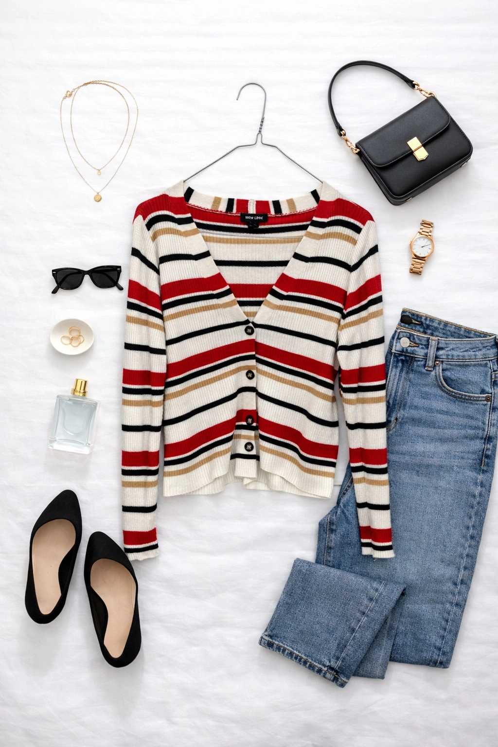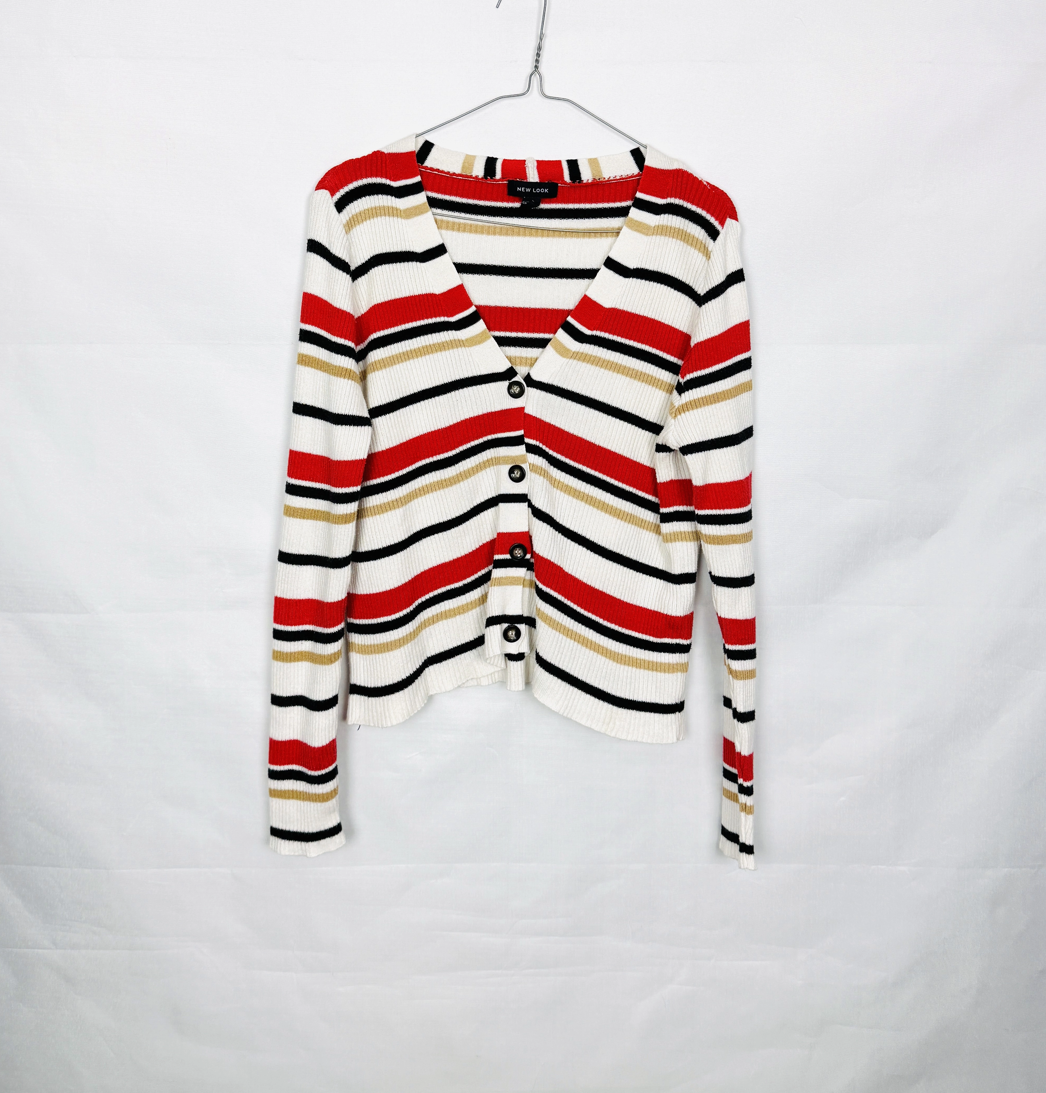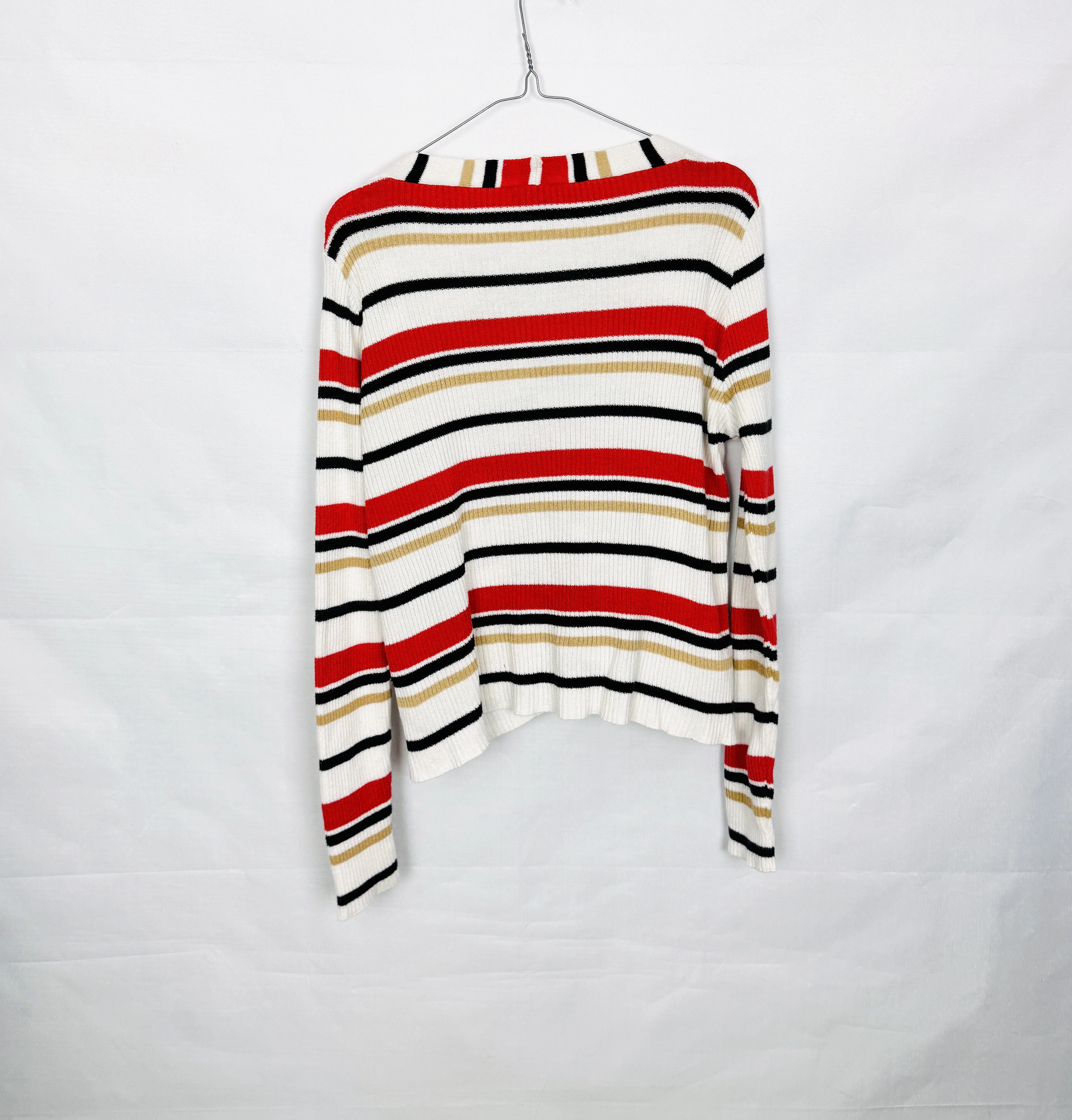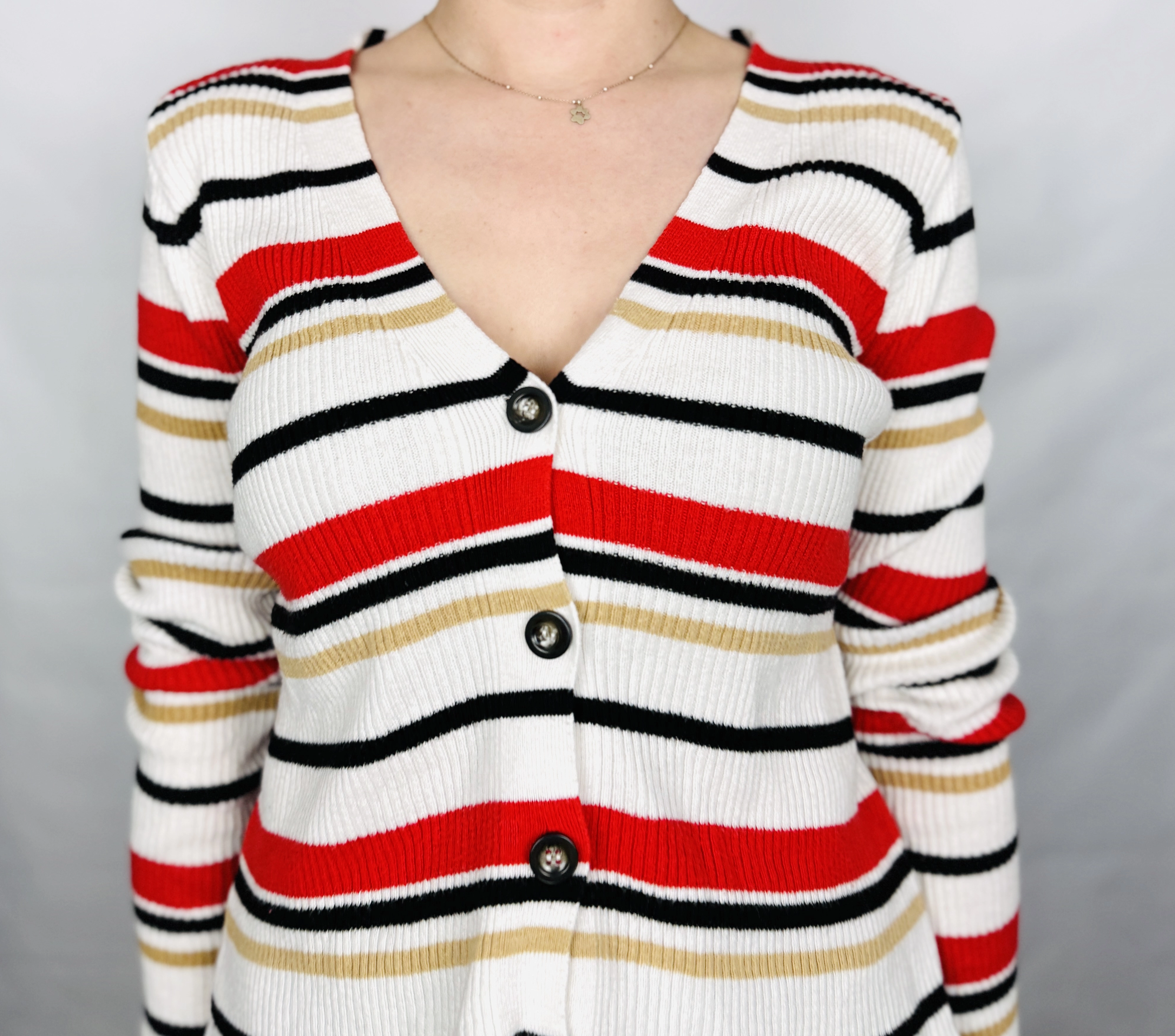 Ta dzianinowa bluzka to radosna i nastrojowa propozycja, która wnosi do garderoby powiew świeżości i nowoczesnej klasyki. Harmonijne połączenie bieli, intensywnej czerwieni, głębokiej czerni oraz subtelnego złota tworzy wielobarwny wzór w poziome pasy, który od razu przyciąga wzrok i dodaje każdej stylizacji energii. To ubranie, które idealnie balansuje między stylem marynarskim a eleganckim retro, oferując wygląd pełen lekkości i kobiecego wdzięku. Dzięki przemyślanej palecie barw bluzka jest niezwykle uniwersalna, pozwalając na tworzenie zestawów, które są jednocześnie wyraziste i pełne klasy.