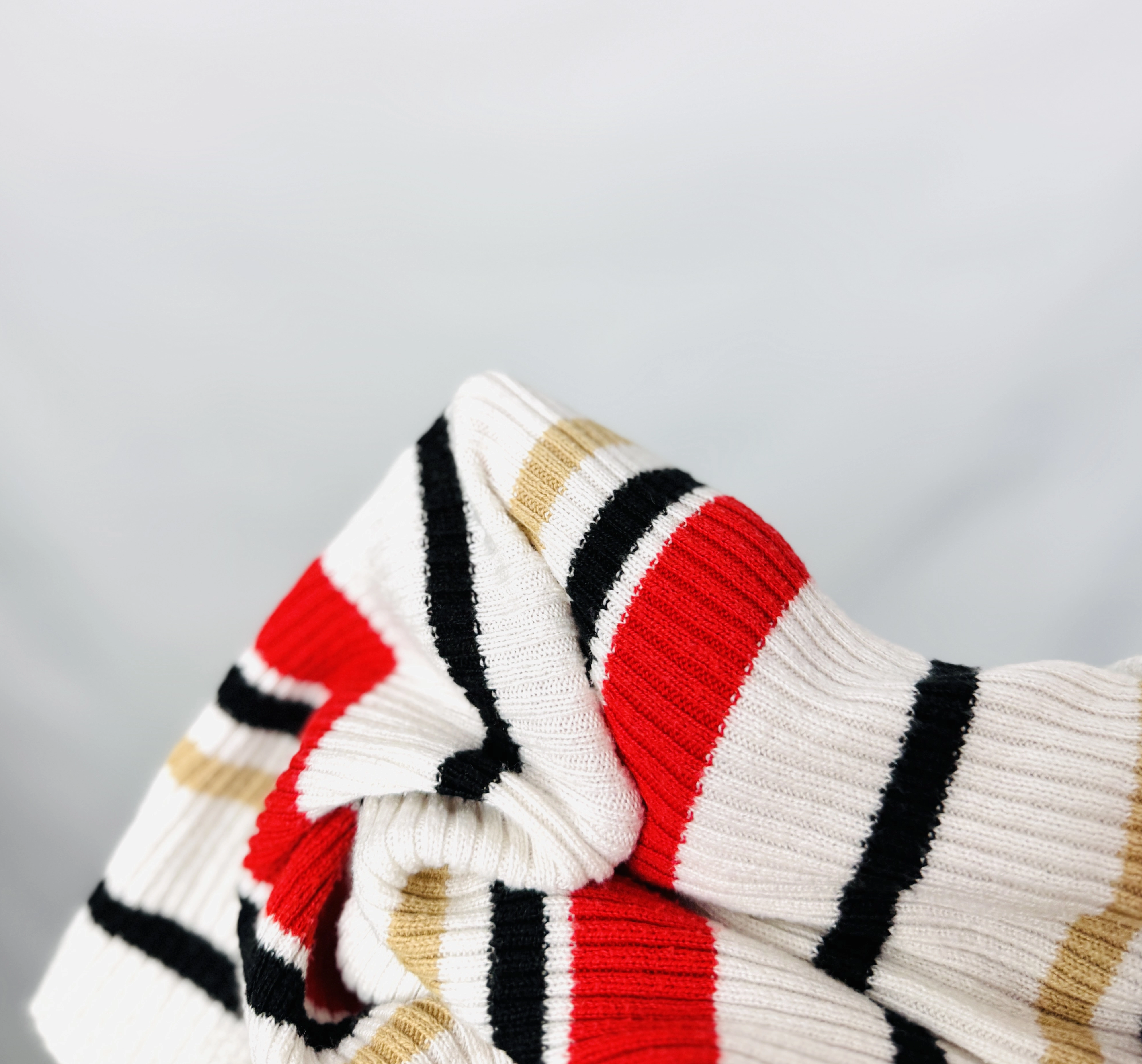 Materiał, z którego wykonano ten model, to gęsta i miękka dzianina o wyraźnej, prążkowanej strukturze. Tkanina sprawia wrażenie elastycznej i nieco grubszej, co gwarantuje świetne dopasowanie do ciała oraz komfort noszenia w ciągu dnia. Pionowe prążki materiału subtelnie kontrastują z poziomym wzorem pasów, nadając ubraniu trójwymiarowości i szlachetnego wyglądu. Splot jest matowy i przyjemny dla skóry, a wysoka jakość materiału powoduje, że kolory pozostają nasycone i czyste, co podkreśla dopracowany charakter produktu.