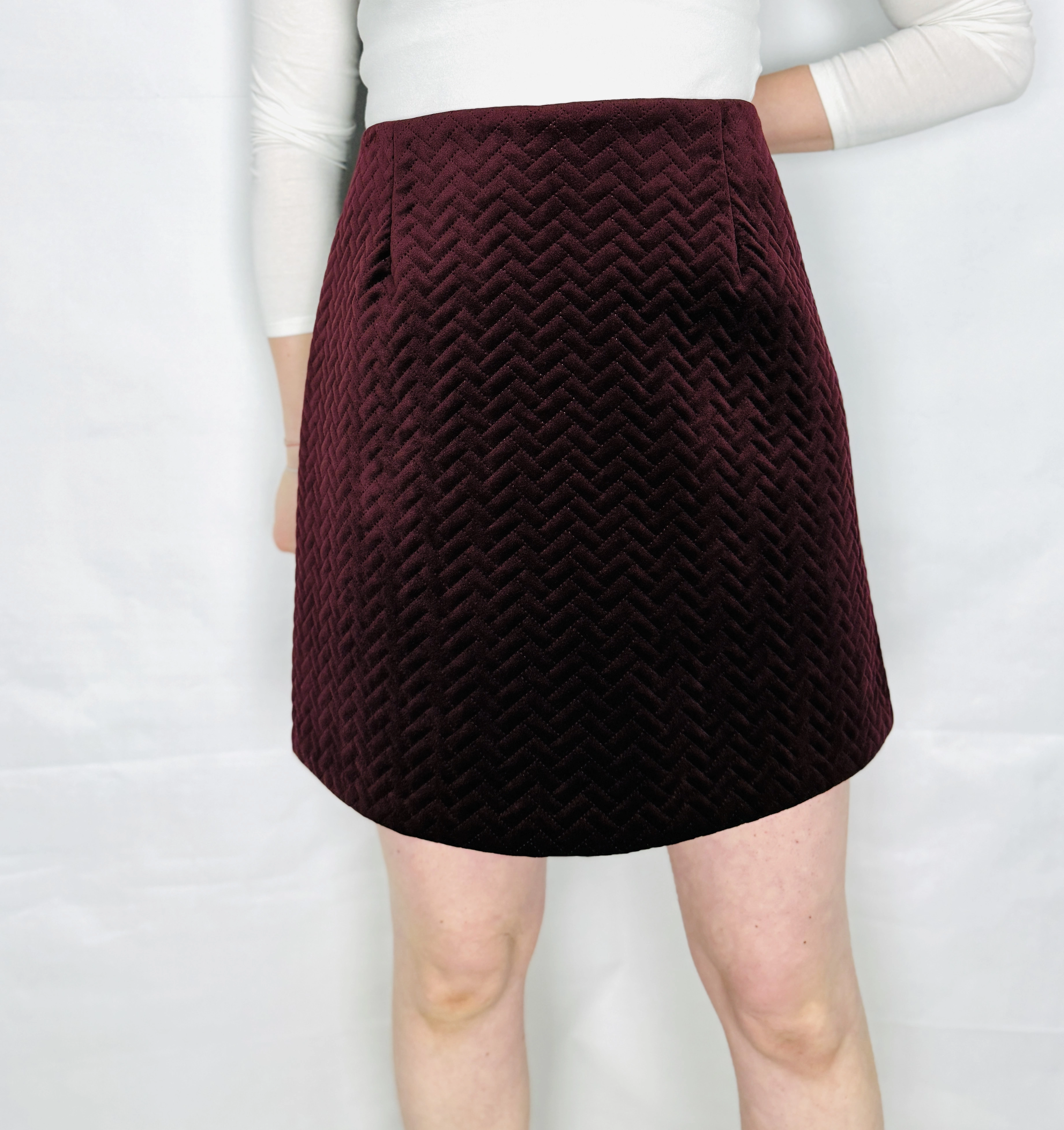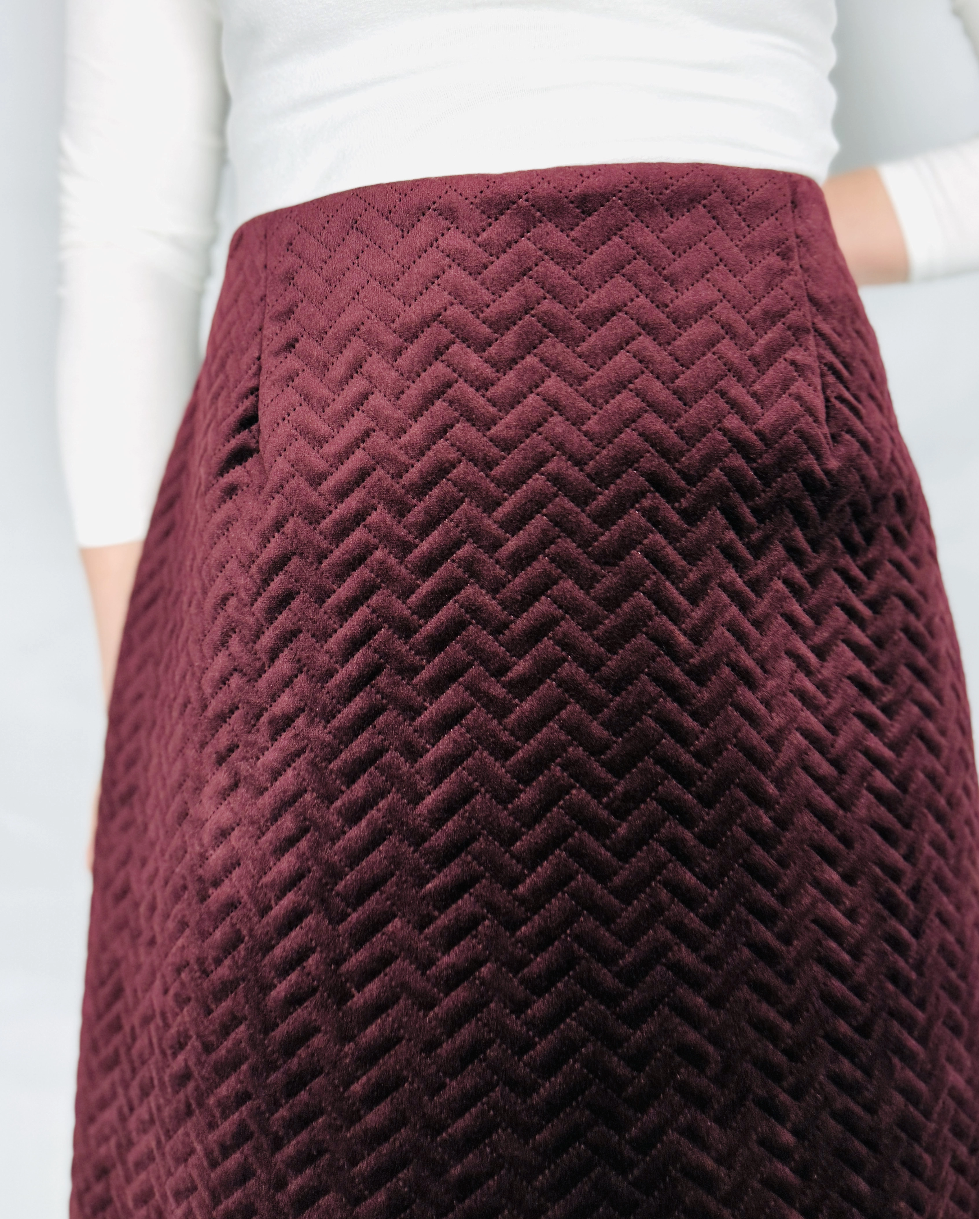 Materiał sprawia wrażenie miękkiego, przyjemnie otulającego i delikatnie puszystego. Strukturalny wzór układający się w regularne, geometryczne linie dodaje głębi i elegancji, a jednocześnie podkreśla wyjątkowy charakter spódnicy. Tkanina wygląda na nieco grubszą, dzięki czemu dobrze trzyma formę i prezentuje się bardzo estetycznie.