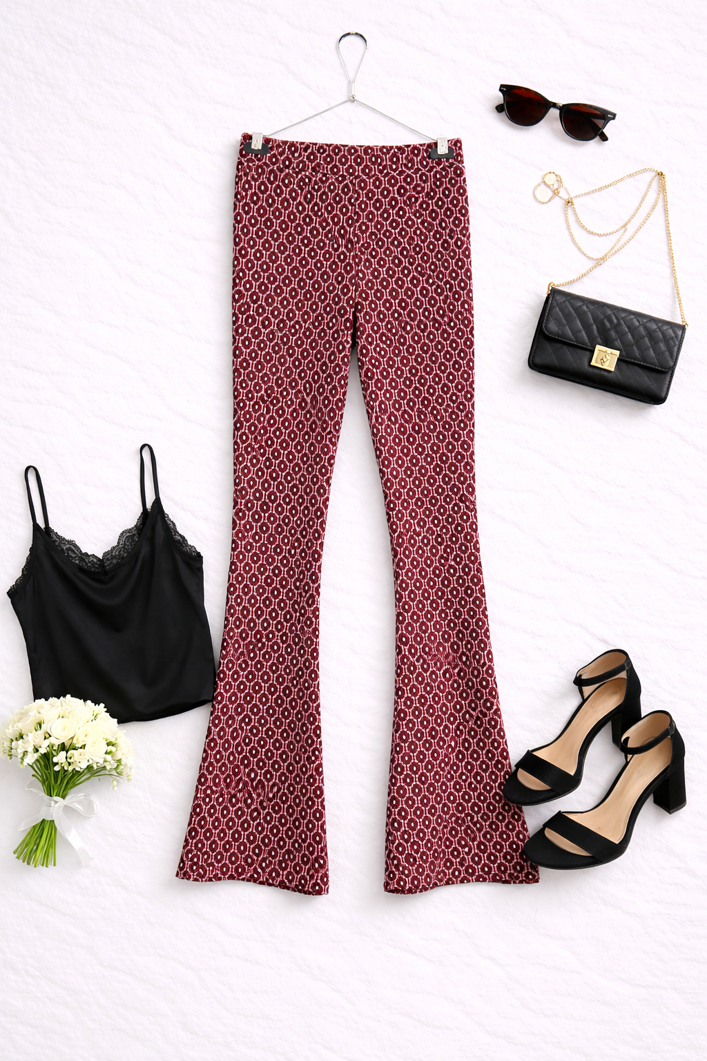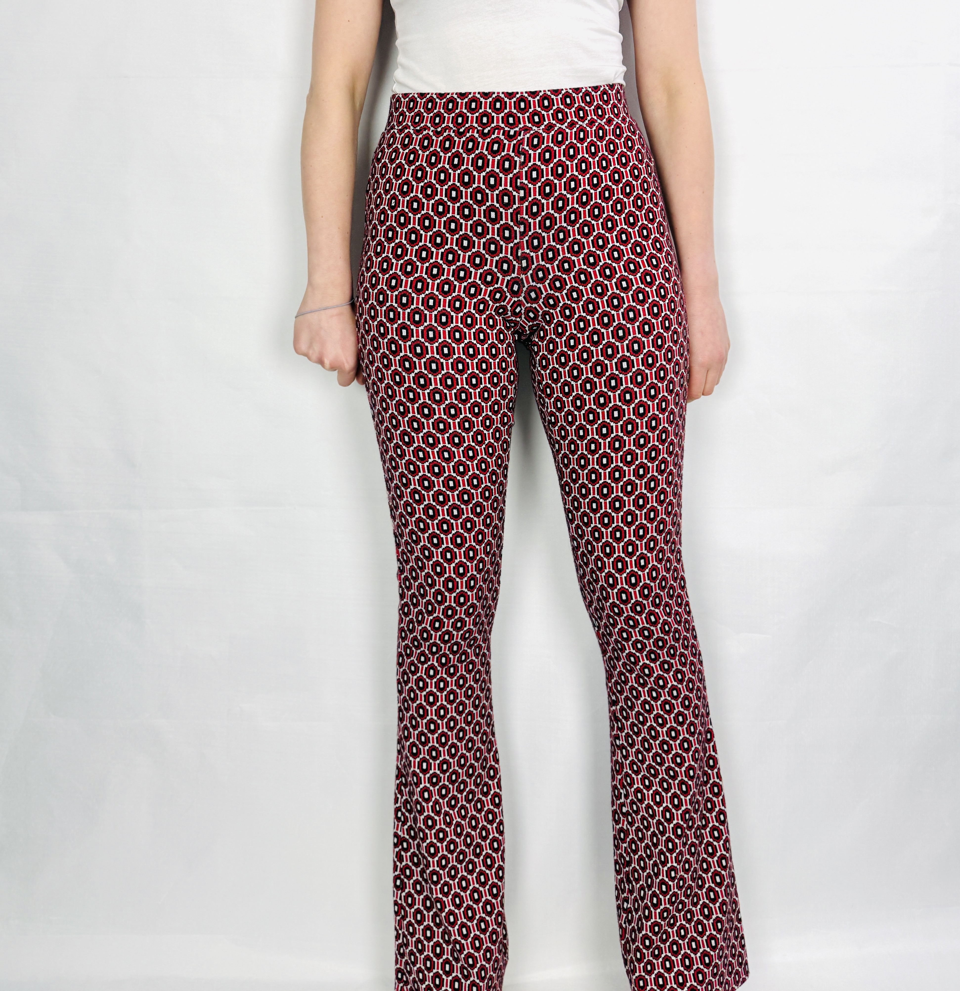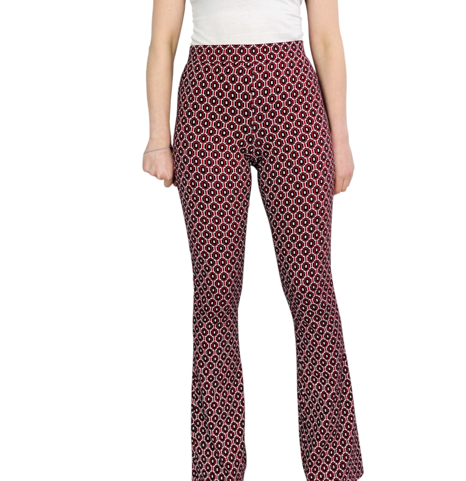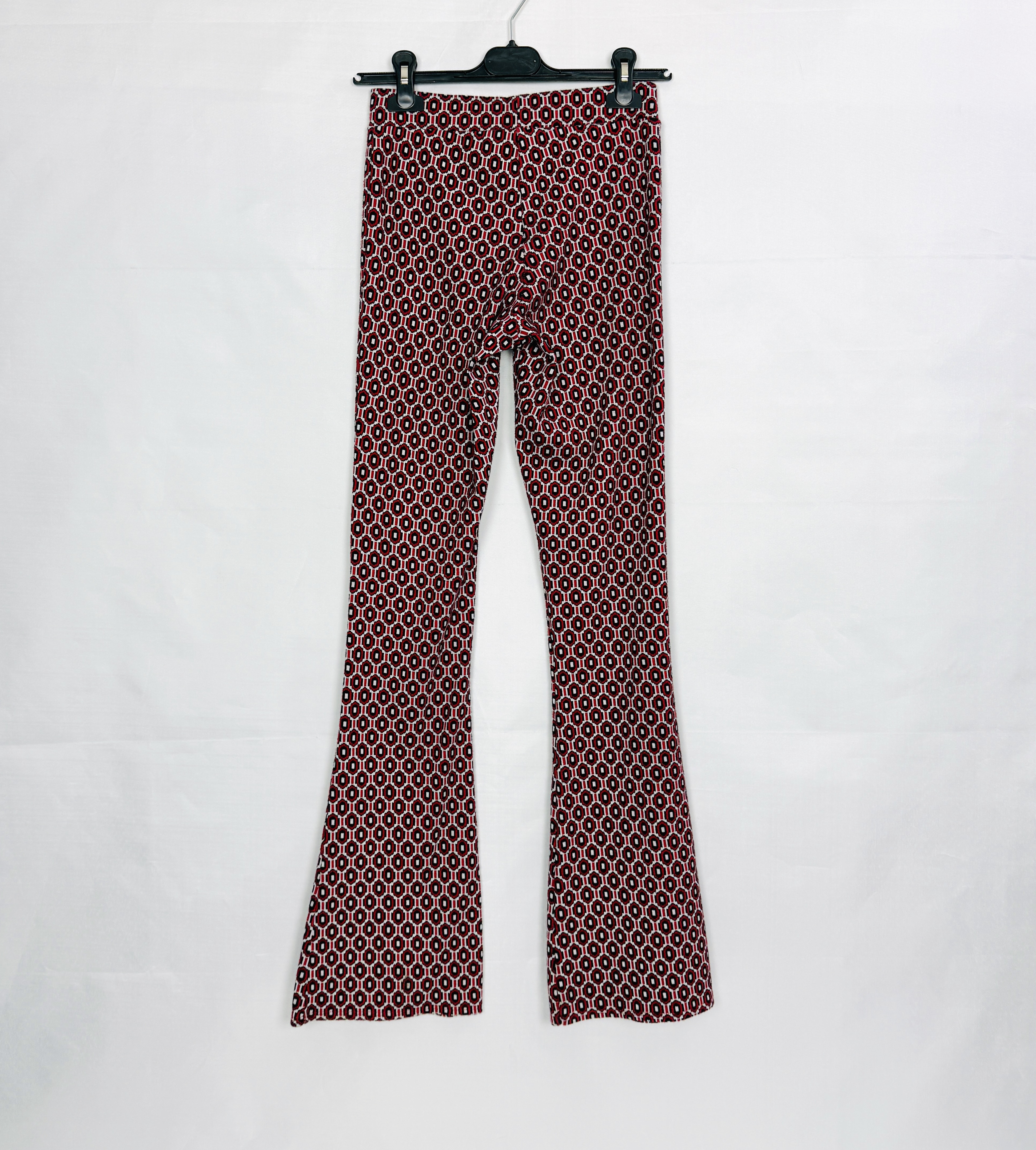To para o wyraźnym, retro charakterze — drobny geometryczny motyw w odcieniach bordo, kremu i czerni tworzy rytmiczną, niemal hipnotyczną powierzchnię, która przyciąga wzrok i nadaje stylizacji wyrafinowanego charakteru. Wzór sprawia, że spodnie stają się samodzielnym elementem garderoby: jednocześnie dekoracyjne i uporządkowane, idealne dla osób, które lubią łączyć klasyczną formę z oryginalnym akcentem. Całość emanuje kobiecą pewnością siebie i subtelną elegancją, będąc propozycją zarówno do codziennych, jak i bardziej przemyślanych zestawów.
