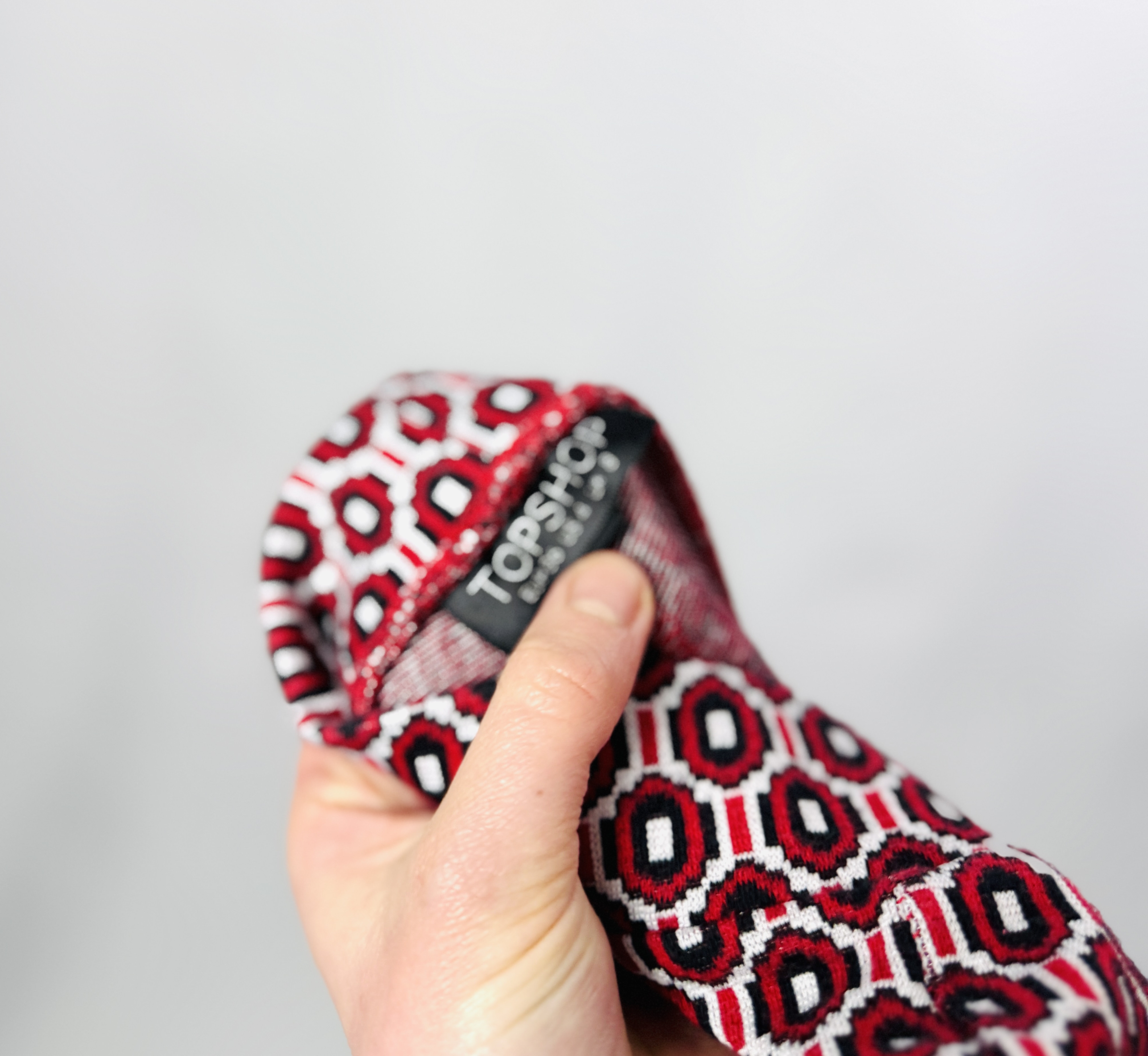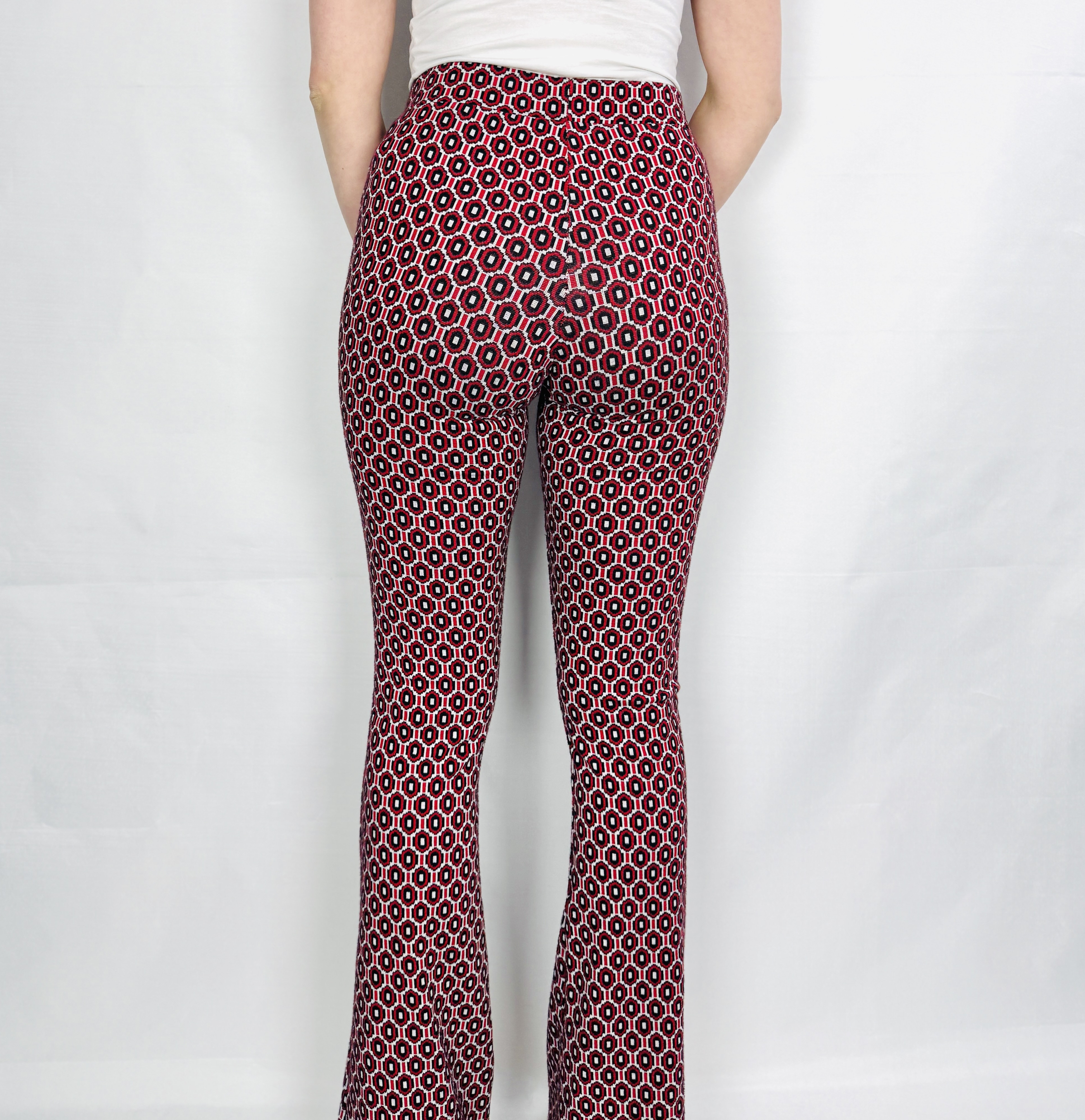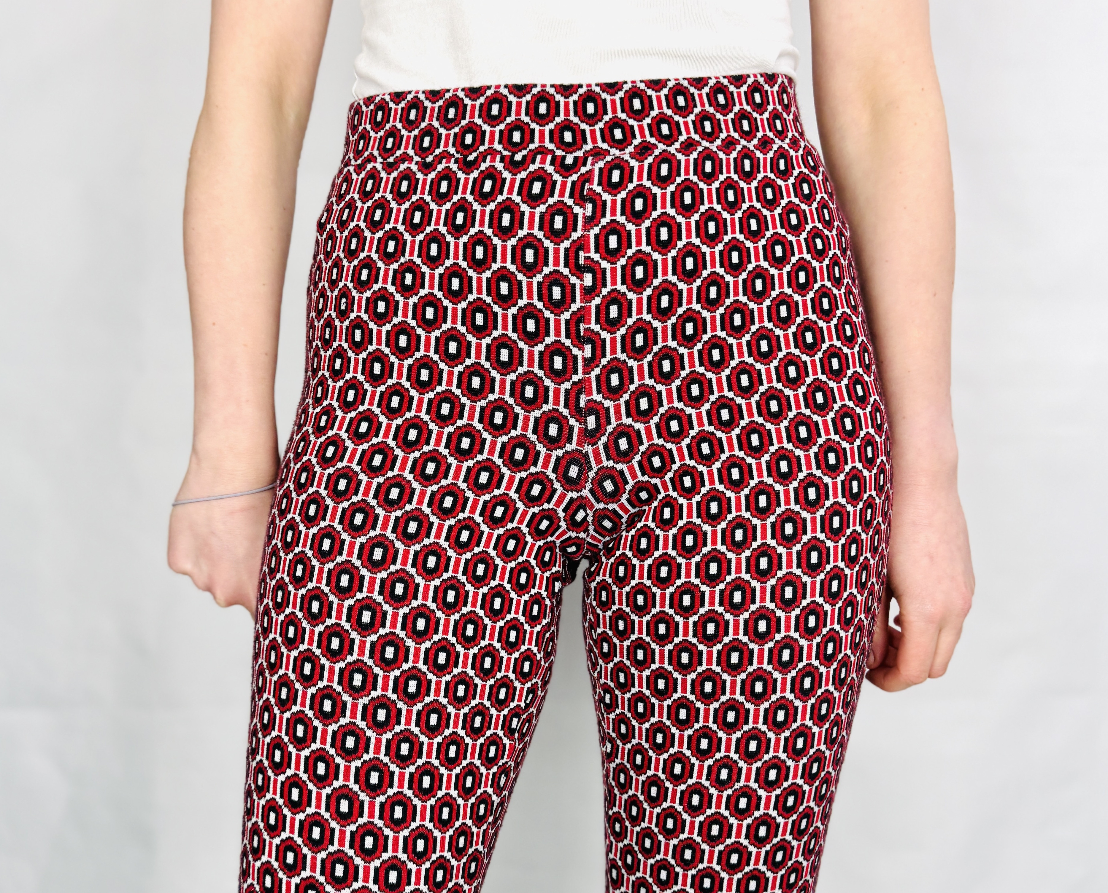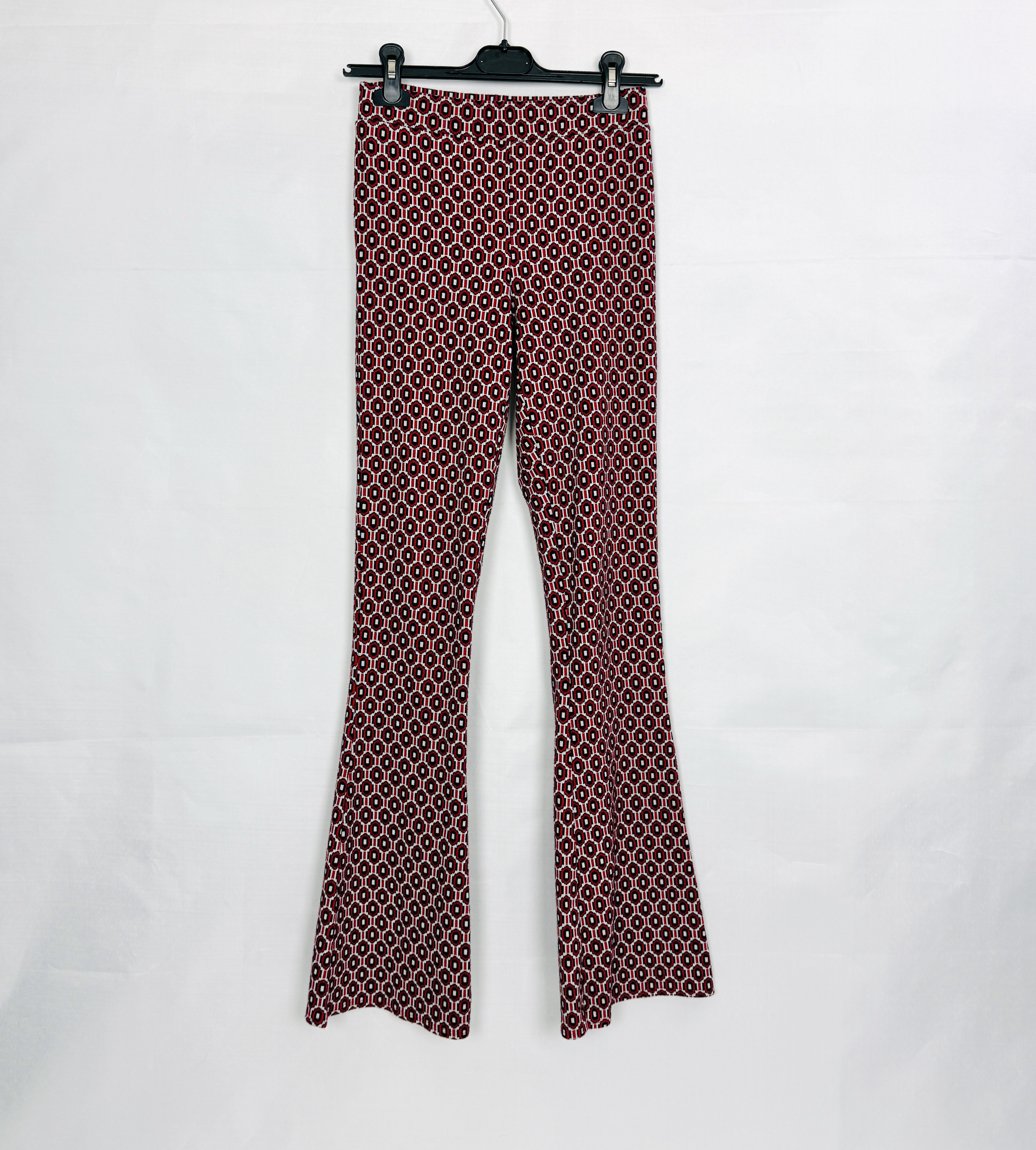 To para o wyraźnym, retro charakterze — drobny geometryczny motyw w odcieniach bordo, kremu i czerni tworzy rytmiczną, niemal hipnotyczną powierzchnię, która przyciąga wzrok i nadaje stylizacji wyrafinowanego charakteru. Wzór sprawia, że spodnie stają się samodzielnym elementem garderoby: jednocześnie dekoracyjne i uporządkowane, idealne dla osób, które lubią łączyć klasyczną formę z oryginalnym akcentem. Całość emanuje kobiecą pewnością siebie i subtelną elegancją, będąc propozycją zarówno do codziennych, jak i bardziej przemyślanych zestawów.