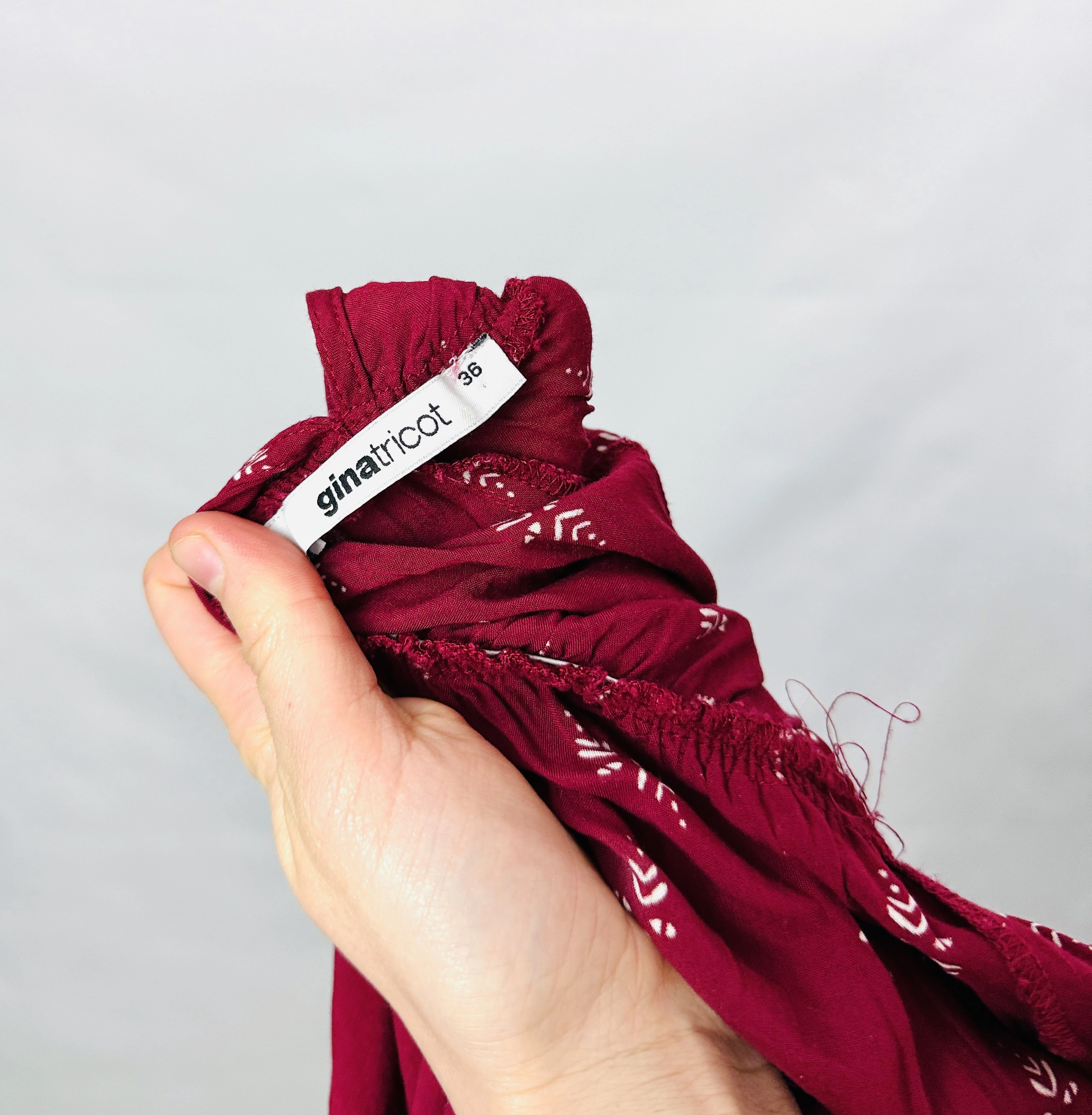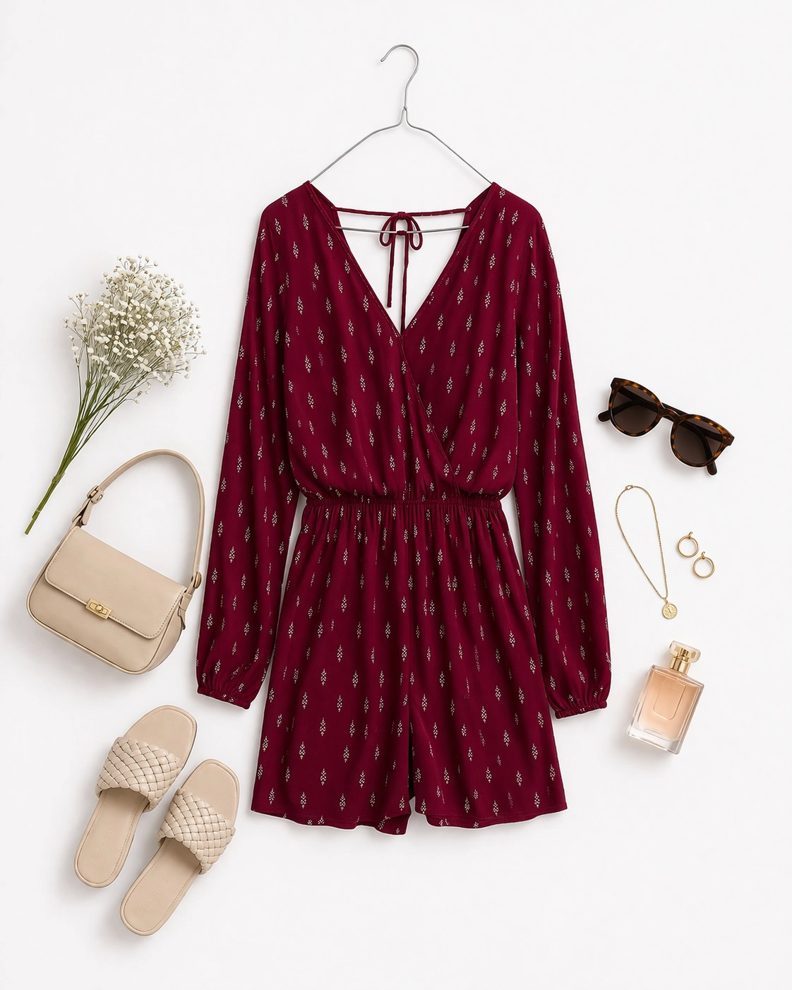 Bordowy kombinezon we wzory to wyśmienita baza do budowania nastrojowych, letnich stylizacji o wyrazistym charakterze. Najpiękniej zaprezentuje się w towarzystwie brązowych sandałków rzemykowych lub klapek na płaskiej podeszwie, tworząc look idealny na wakacyjny wyjazd czy popołudniowe spotkanie. Na wieczór można go zestawić z sandałami na koturnie i złotą biżuterią, która podkreśli ciepły ton bordowej tkaniny. Kolorystyka ubrania przepięknie harmonizuje z bieli, beżem, złotem oraz wszelkimi dodatkami z naturalnej plecionki. To produkt, który sprawi, że poczujesz się stylowo, pewnie i niezwykle kobieco, gwarantując nienaganny wygląd i wyjątkową, nastrojową wygodę.