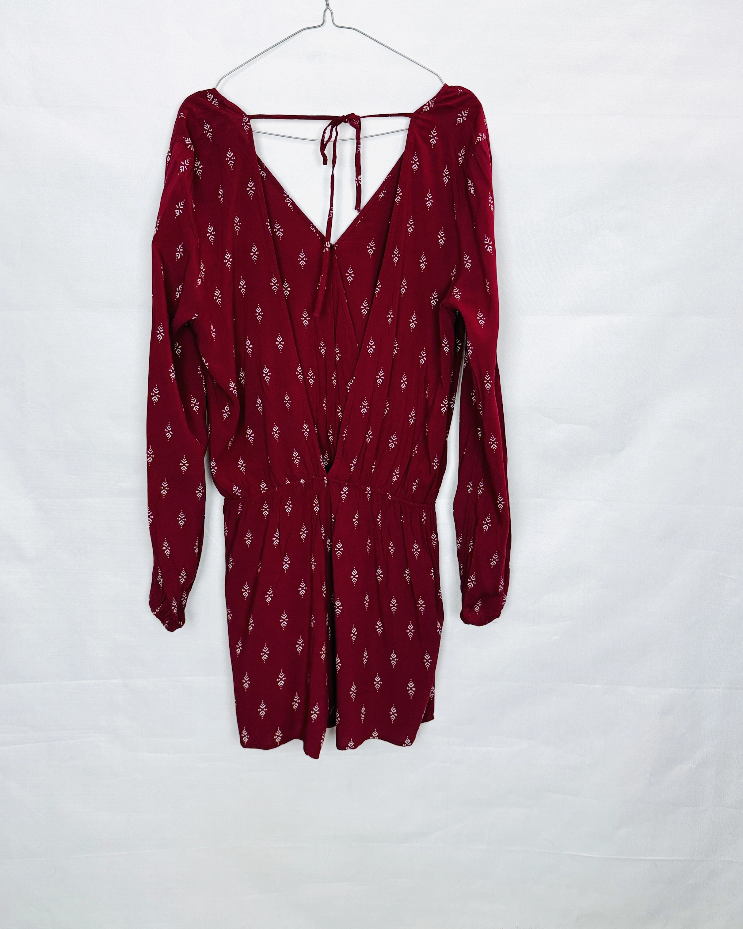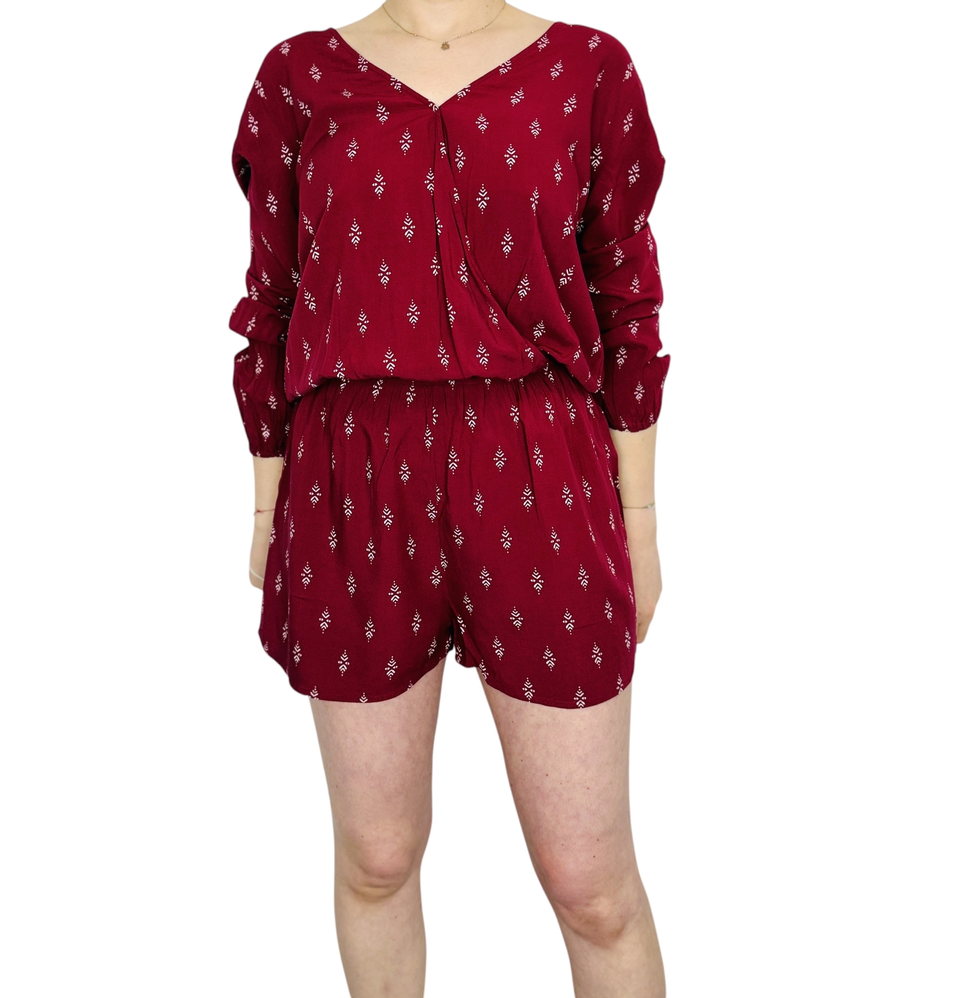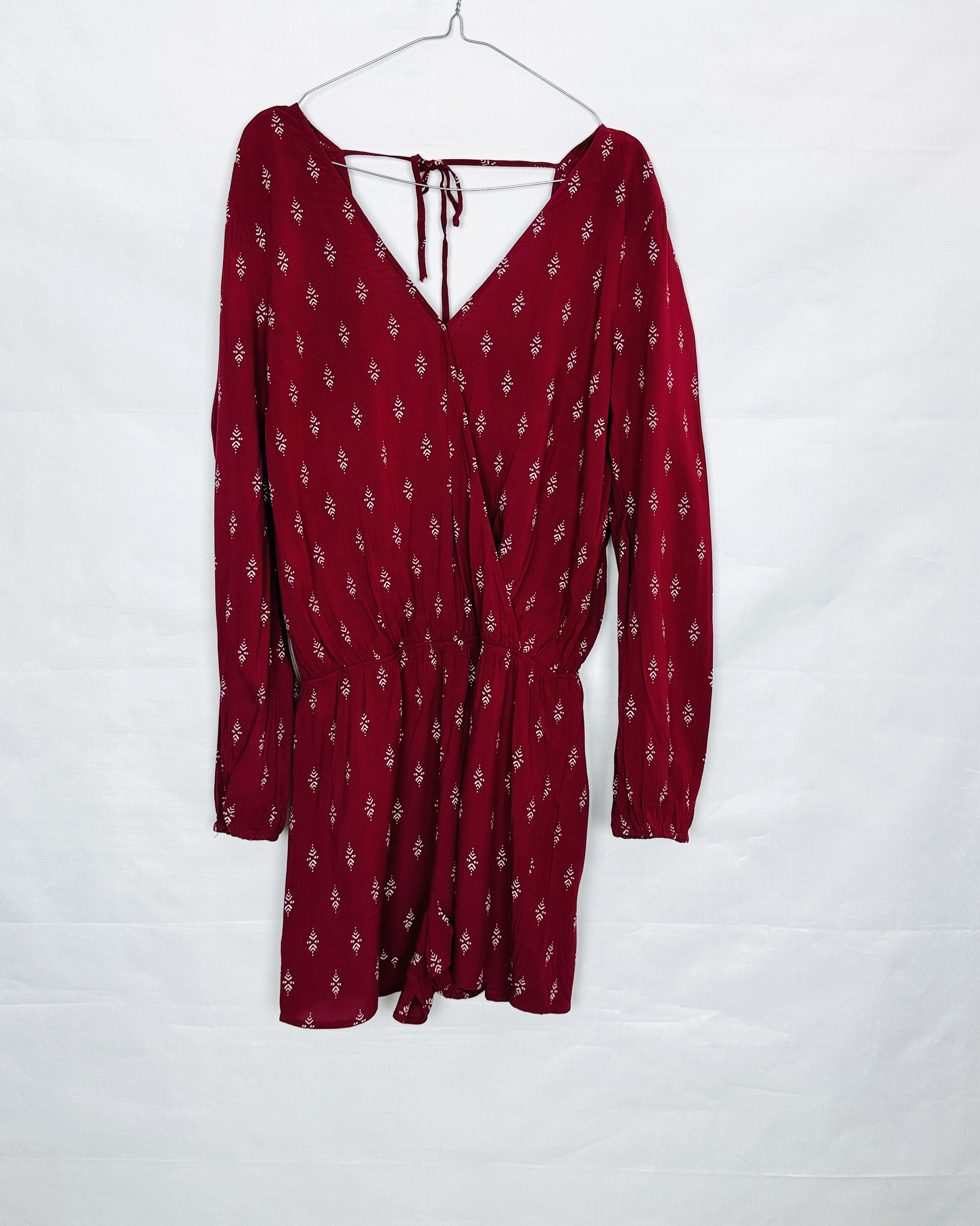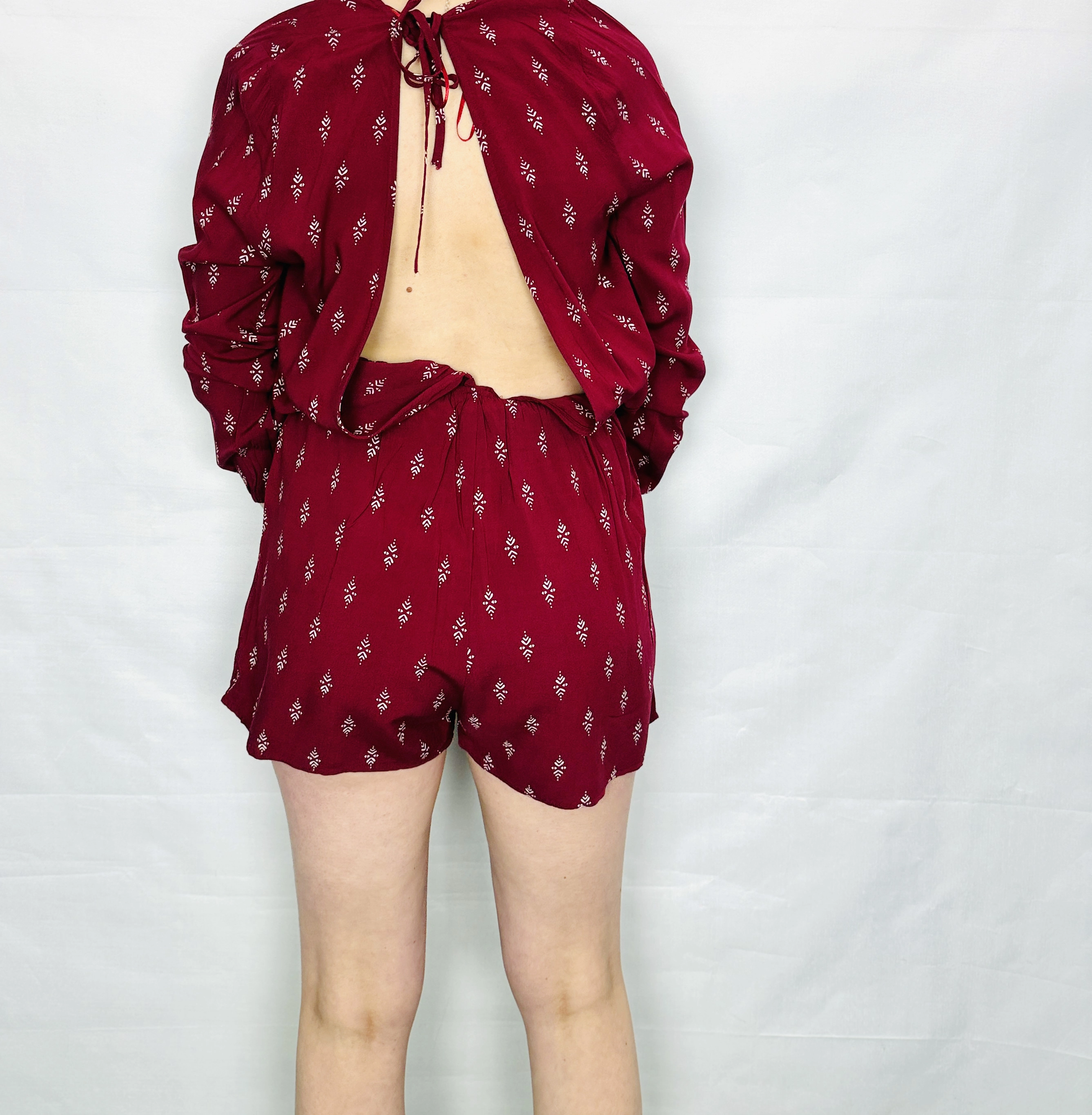 Ten kombinezon to kwintesencja nastrojowej swobody i kobiecego wdzięku, który w niezwykle oryginalny sposób łączy komfort noszenia z nutą zmysłowości. Głęboki, bordowy odcień tkaniny stanowi idealne, nasycone tło dla drobnego, geometrycznego wzoru w białym kolorze, który regularnie pokrywa całą powierzchnię ubrania. To propozycja dla kobiet, które kochają nastrojowe stylizacje pełne charakteru, pragnąc czuć się lekko i wyjątkowo zarówno podczas wakacyjnych spacerów, jak i letnich wieczornych spotkań.