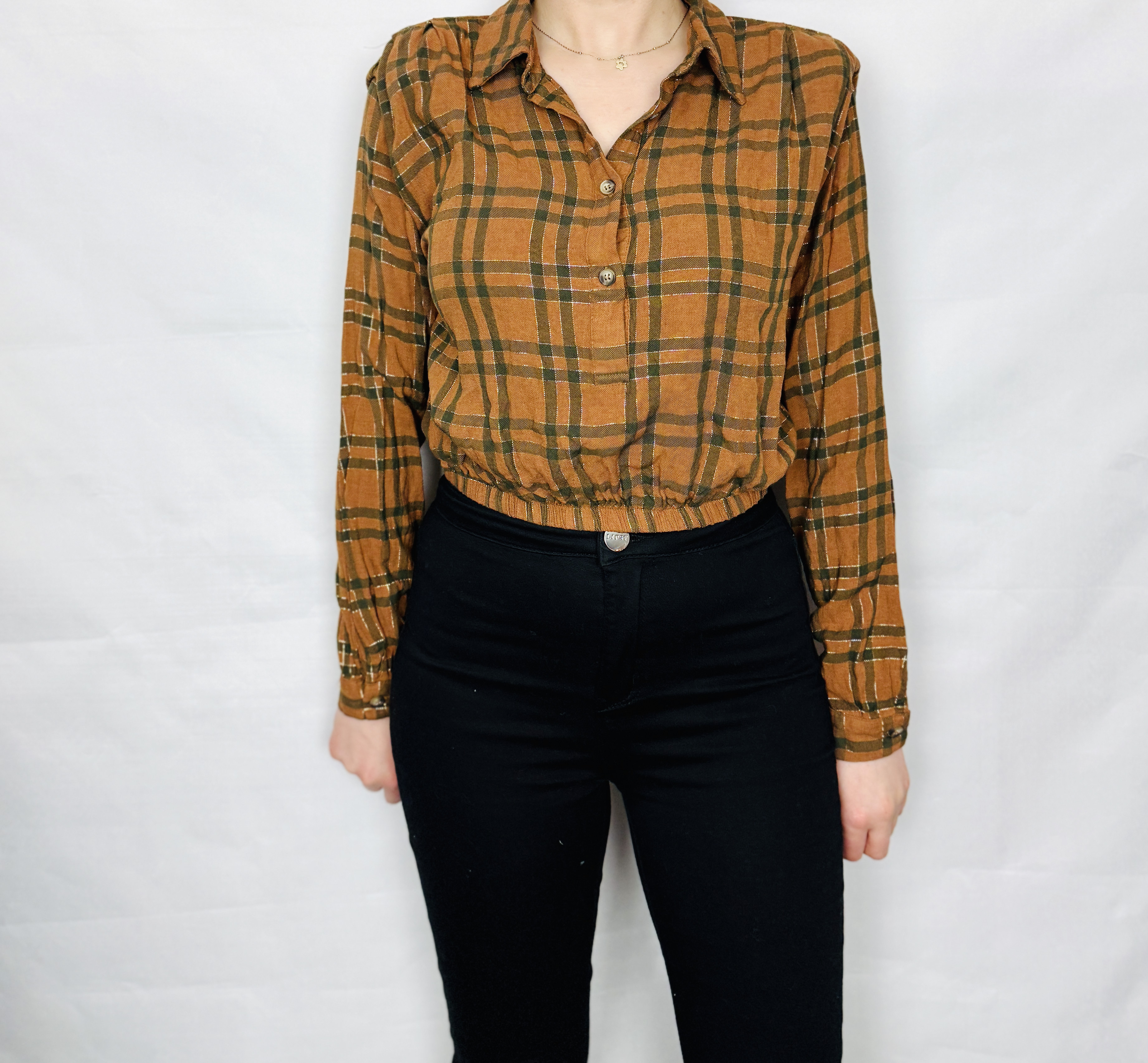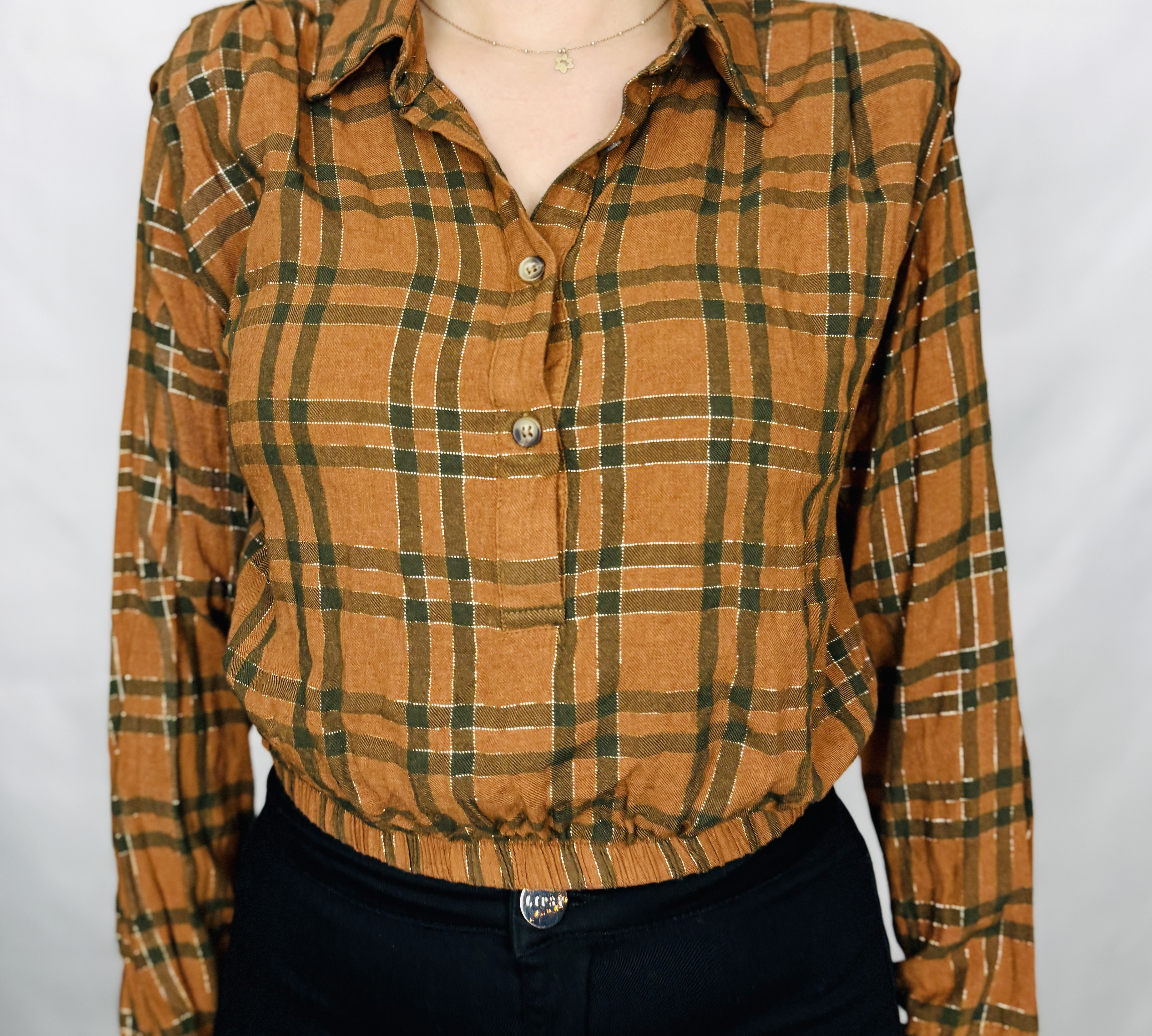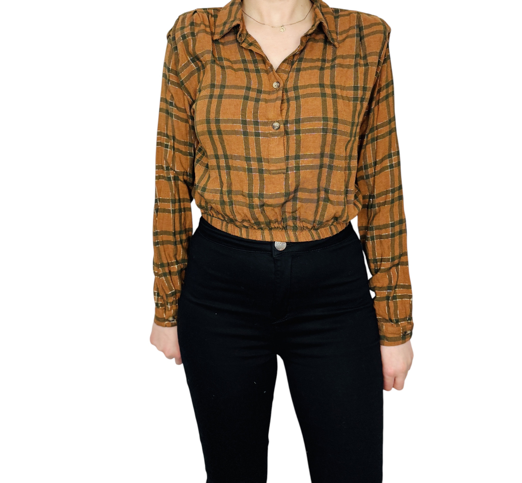 Ta brązowa bluzka w klasyczną kratę to połączenie przytulnej, jesiennej palety i kobiecej lekkości. Ciepły odcień brązu zestawiony z ciemniejszymi, zielonkawymi liniami tworzy uporządkowany, a zarazem naturalny wzór, który dodaje stylizacji wyrazu bez przesady. Całość ma w sobie spokojny, nieco rustykalny urok — to ubiór o spokojnym charakterze, który potrafi wprowadzić do garderoby elegancki, ale codzienny akcent.