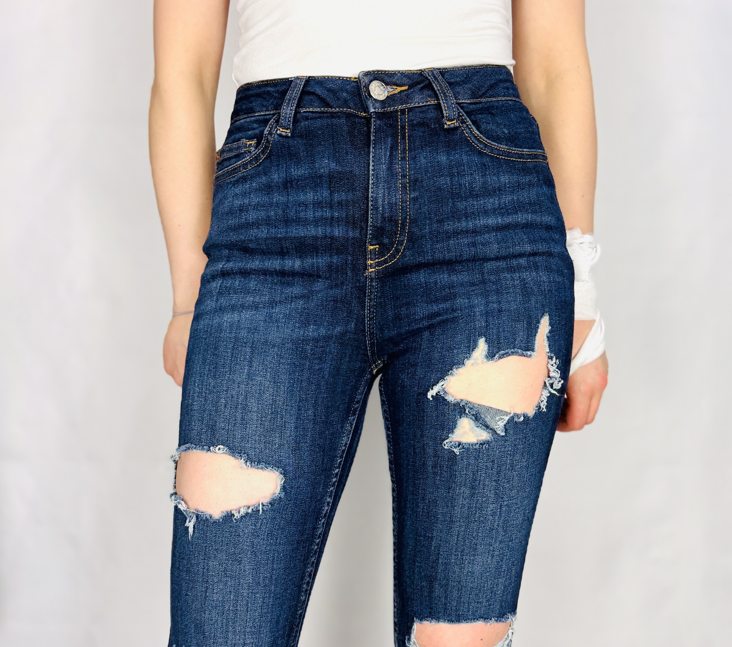 Najbardziej charakterystycznym elementem są przetarcia i rozdarcia ułożone na przedniej części nogawek — większe otwarte panele na udach oraz efektowne, częściej poprzeczne przetarcia na wysokości kolan nadają denimu wyrazu i tekstury. Krawędzie rozdarć mają postrzępioną, lekko włóknistą fakturę, która tworzy ciekawy kontrast z gładką powierzchnią reszty spodni. Dzięki temu detale wyglądają autentycznie i dodają stylizacji nuty nonszalancji, zachowując przy tym modną harmonię.