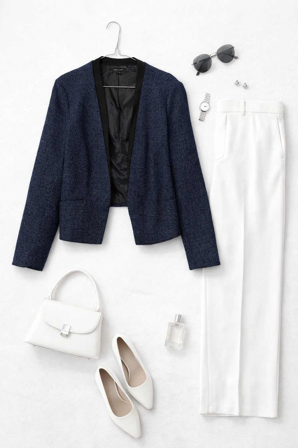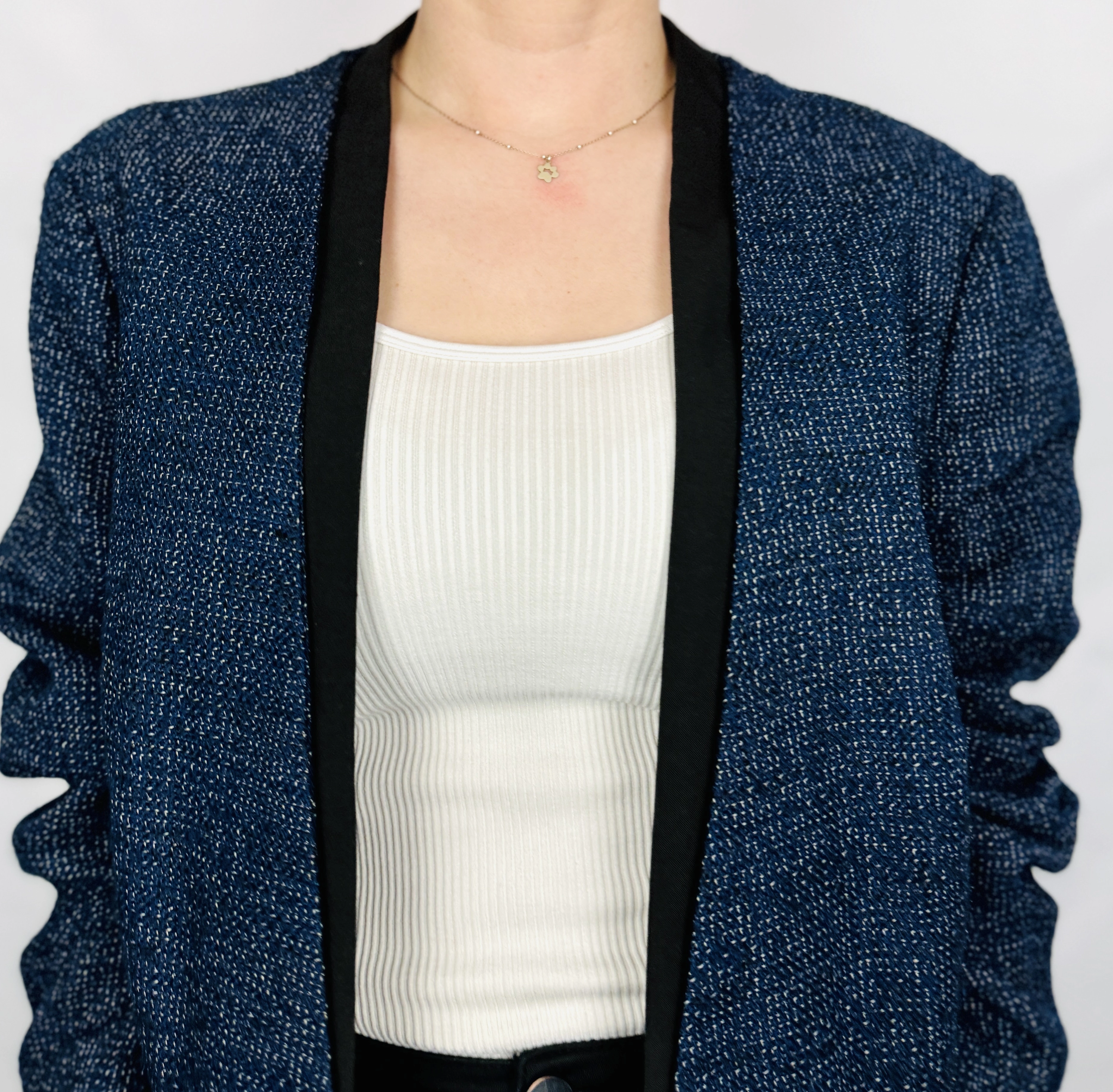 Pod względem sylwetki prosty krój delikatnie maskuje okolice talii i brzucha, jednocześnie zachowując proporcje figury. Otwarta forma i pionowa linia przodu optycznie wysmuklają sylwetkę, a kontrastowe wykończenie kieruje uwagę ku górnej części ciała. To fason, który dobrze sprawdzi się przy różnych typach sylwetek, dodając im lekkości i uporządkowanego charakteru.