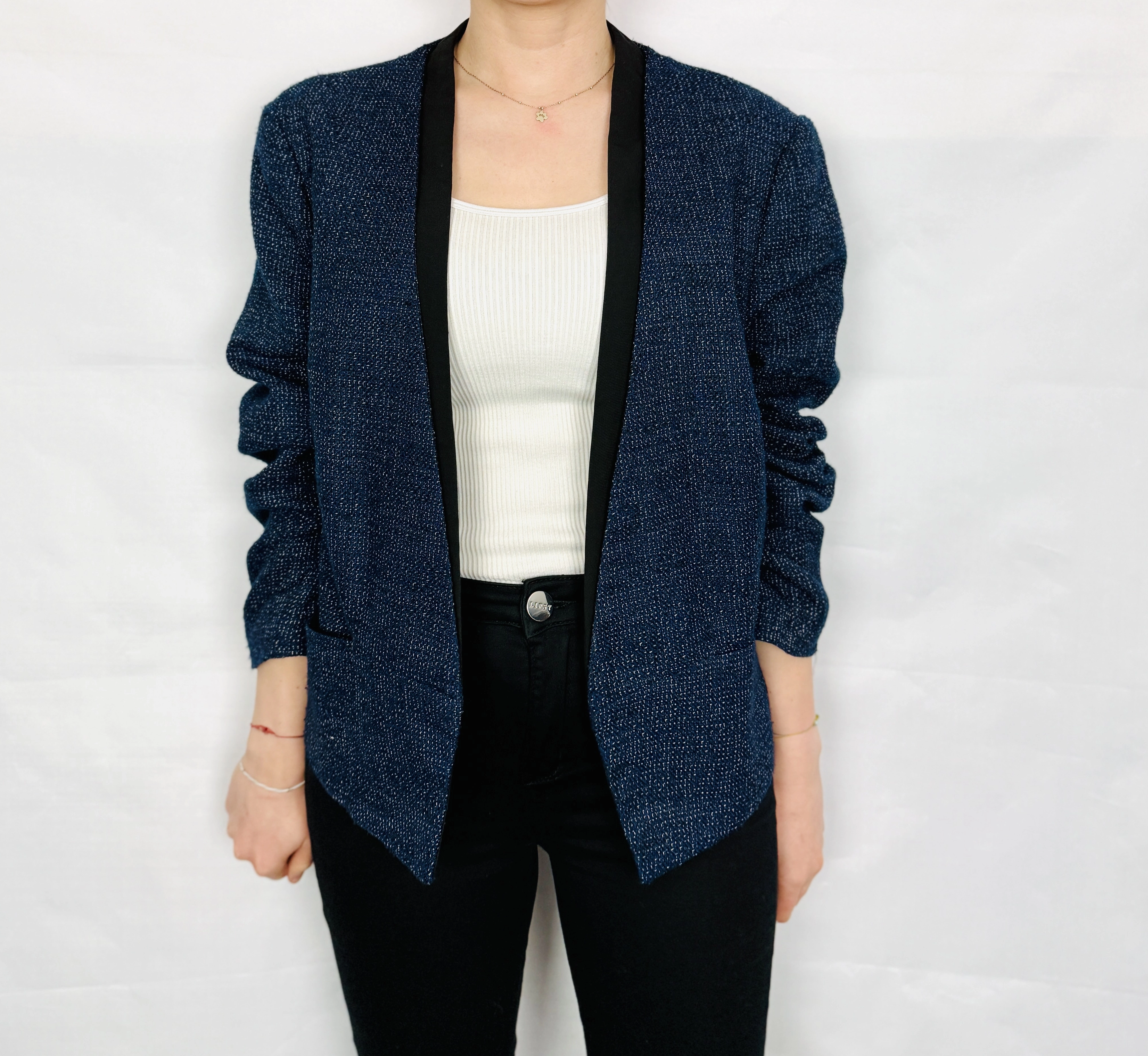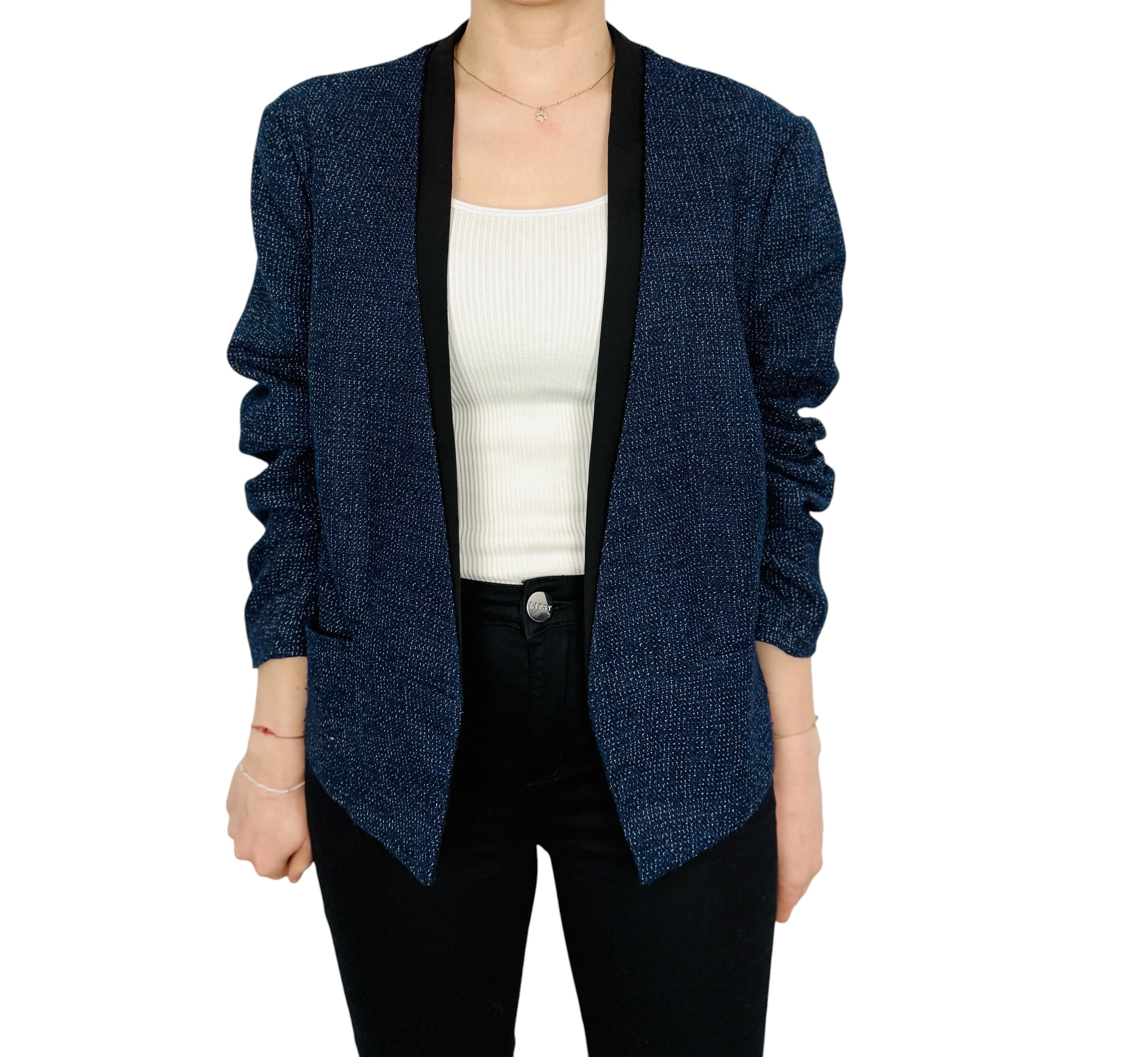 Fason żakietu jest prosty i lekko luźniejszy, co zapewnia komfort noszenia i sprawia, że świetnie układa się na sylwetce. Brak klasycznego zapięcia nadaje mu lekkości, a otwarta forma tworzy pionowe linie optycznie wydłużające figurę. Dekolt wykończony szeroką, czarną lamówką przypomina subtelnie szalowy kołnierz, który miękko opada i nadaje całości eleganckiego wyrazu. Długie rękawy o prostej linii harmonijnie dopełniają całość, a długość sięgająca bioder sprawia, że model jest bardzo uniwersalny.