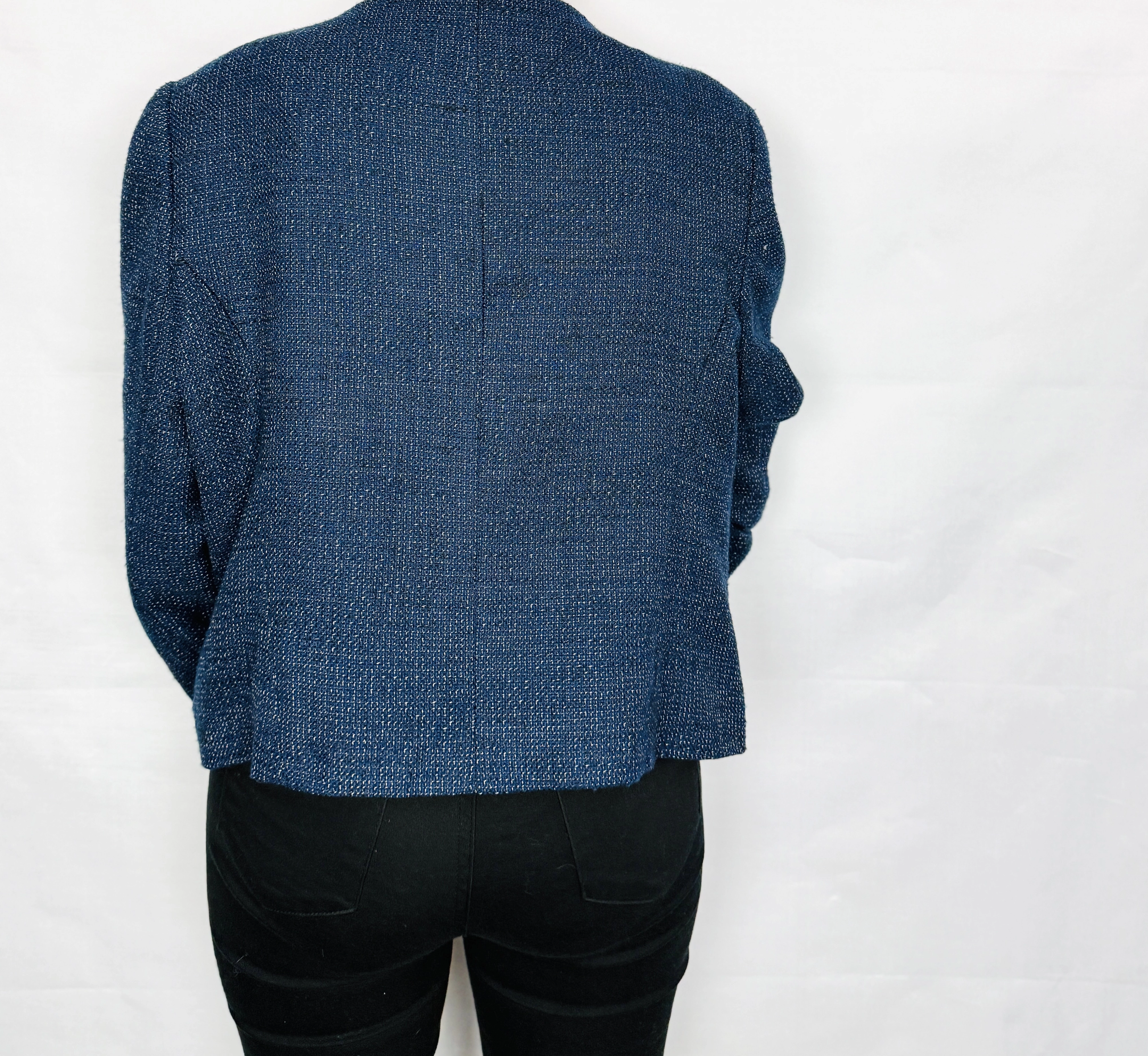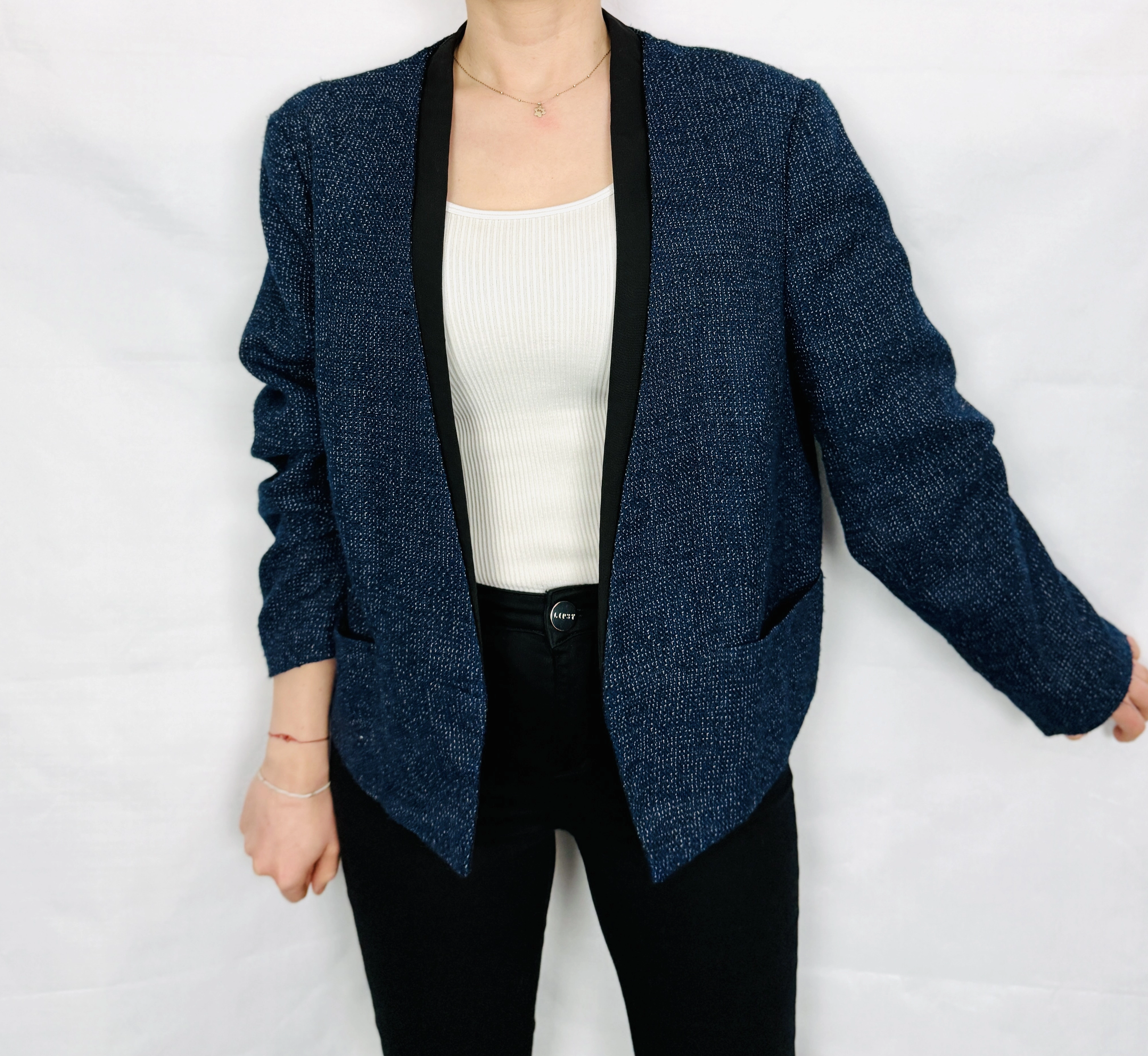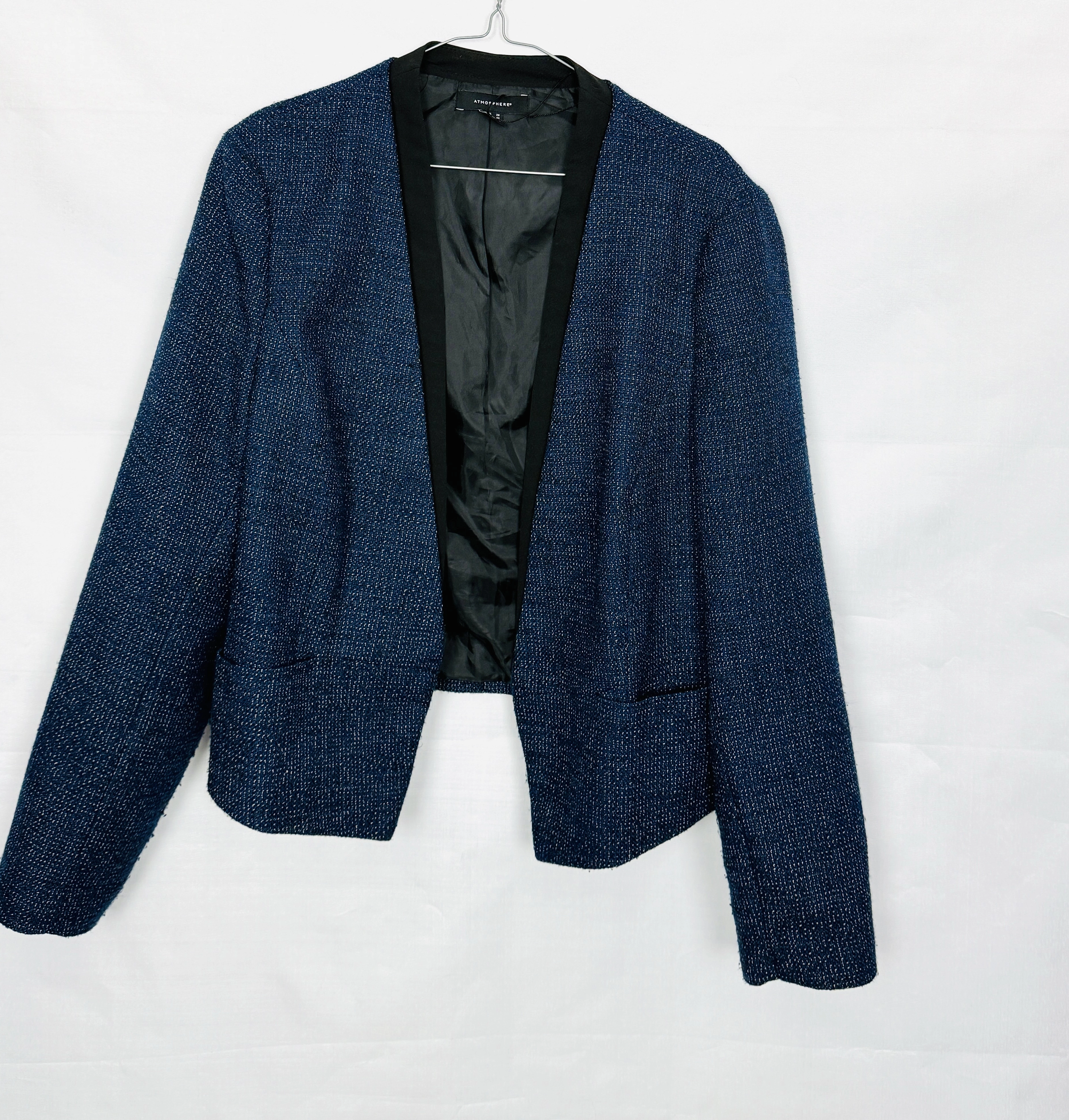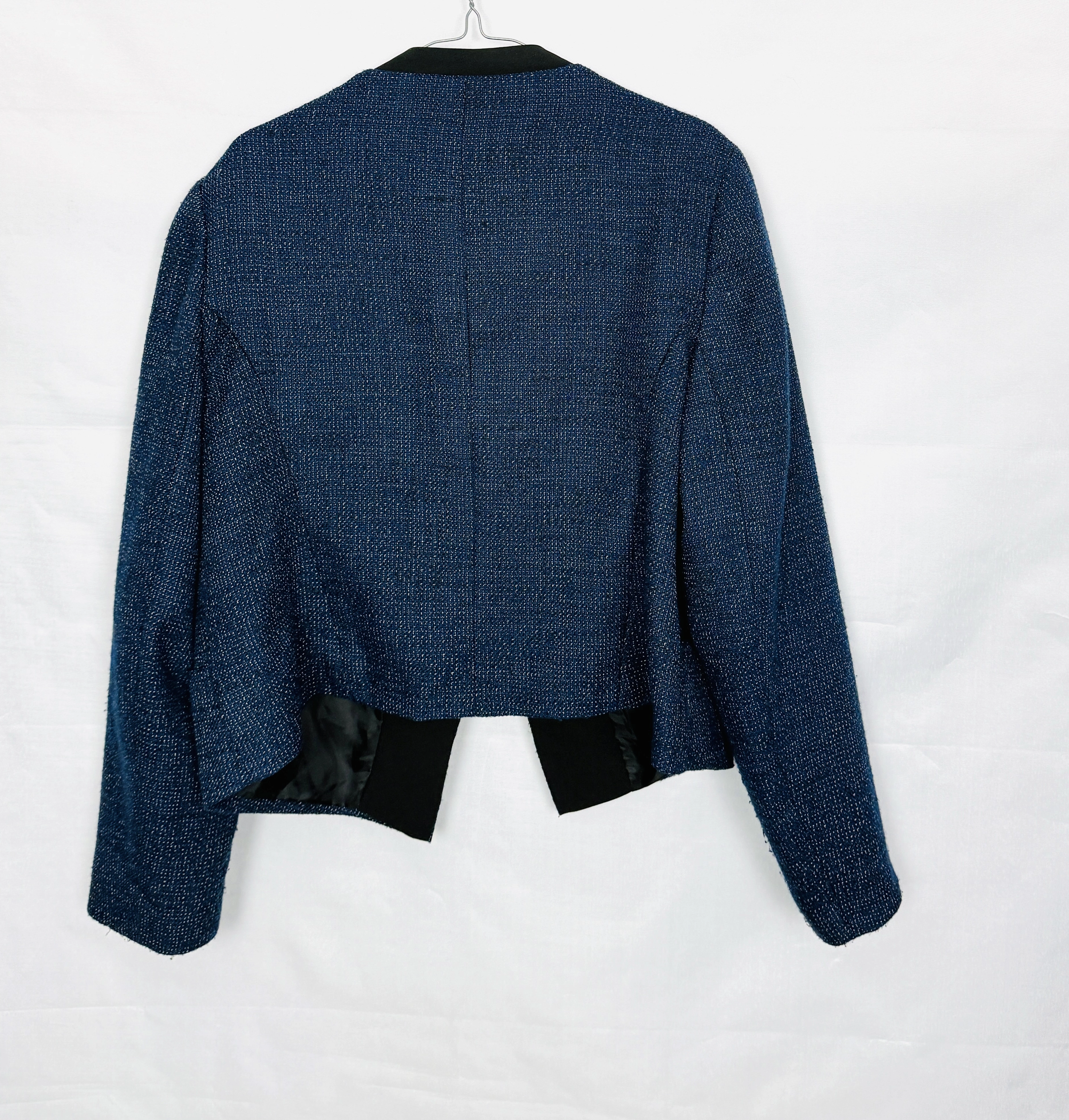 Ten żakiet to elegancja w nowoczesnym, lekko swobodnym wydaniu, która doskonale odnajduje się zarówno w codziennych, jak i bardziej dopracowanych stylizacjach. Głęboki odcień ciemnego niebieskiego nadaje całości wyrafinowania, a subtelna, drobnoziarnista faktura materiału sprawia, że model prezentuje się niezwykle stylowo i z charakterem. Kontrastowe wykończenie w czerni dodaje całości wyrazistości i podkreśla jego bardziej współczesny, miejski charakter.