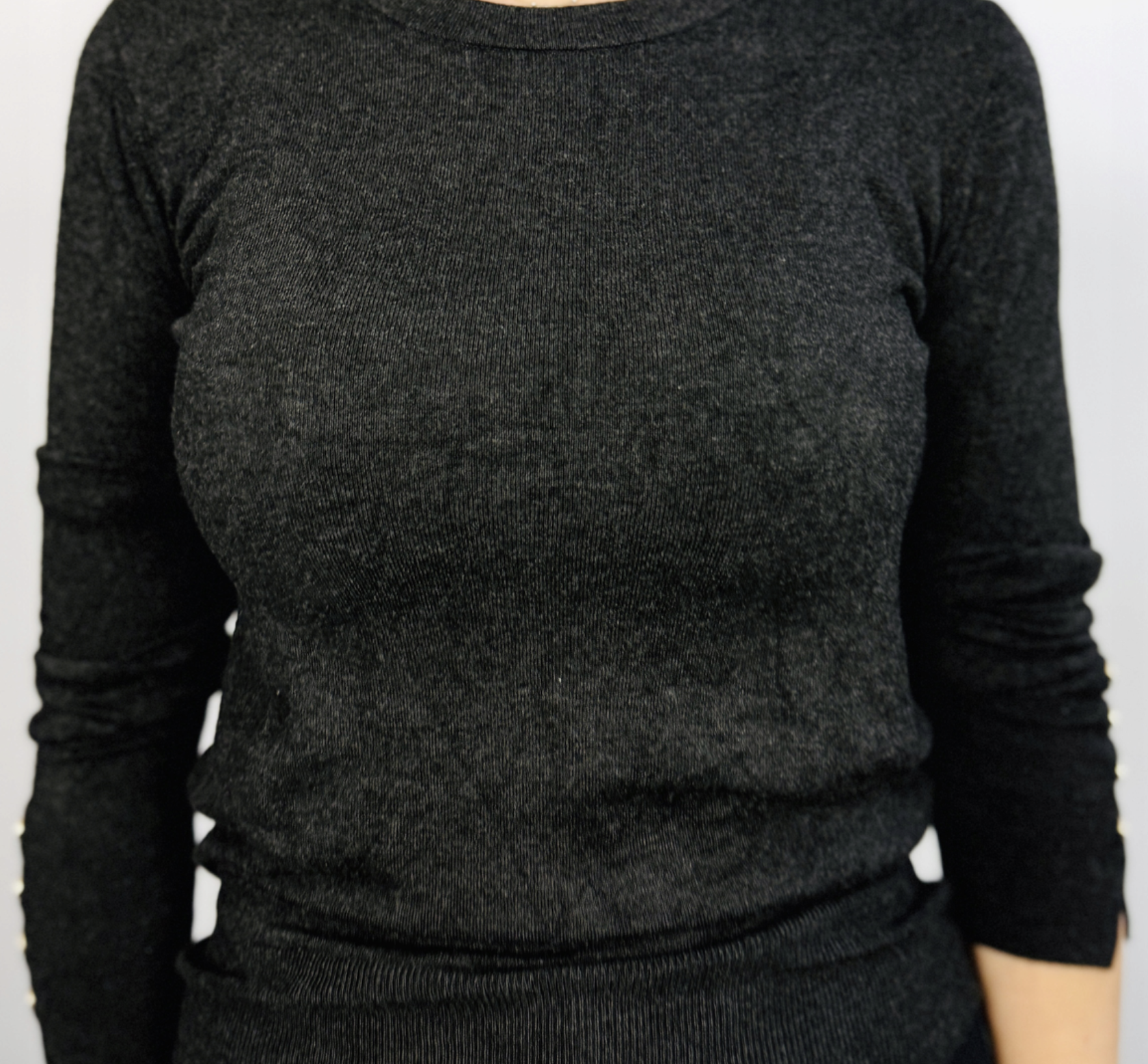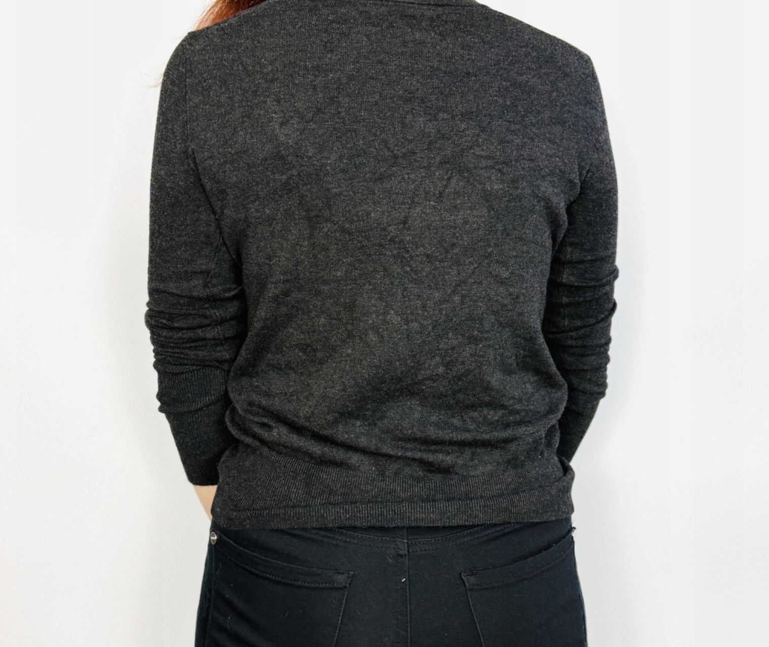 Sweterek został uszyty z miękkiego, przyjemnie otulającego materiału, który gładko przylega do ciała, modelując figurę i nadając jej smukłości. Dzięki elastyczności tkaniny pięknie dopasowuje się do kształtów, nie opinając nadmiernie newralgicznych miejsc. Kolor – głęboki, ciemnoszary z grafitowym podtonem – jest uniwersalny, a przy tym elegancki i nieco tajemniczy. Idealnie komponuje się z klasyczną czernią, beżem, bielą, ale też z mocniejszymi akcentami, jak burgund, musztarda czy butelkowa zieleń.