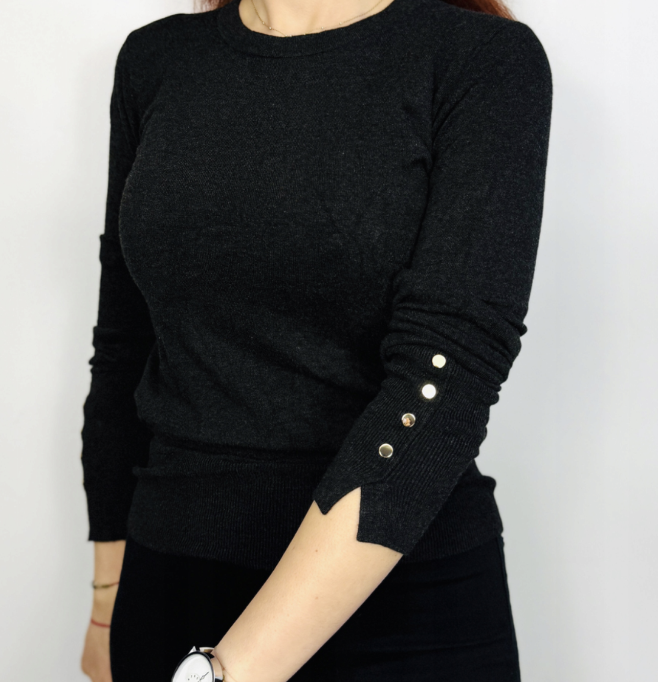 Największą ozdobą tego modelu są jednak rękawy – lekko dopasowane, sięgające do nadgarstków, z ozdobnymi, złotymi guzikami przy mankietach. Trzy błyszczące guziki zostały umieszczone tuż nad rozcięciem, które nadaje rękawowi lekkości i modowego charakteru. To subtelny, ale efektowny detal, który przyciąga wzrok i sprawia, że nawet prosta stylizacja nabiera eleganckiego sznytu.