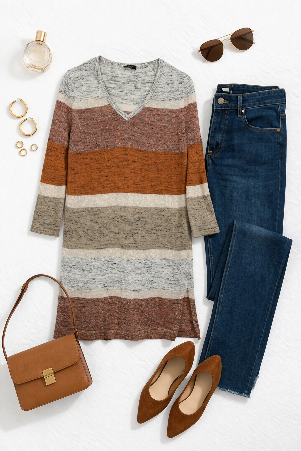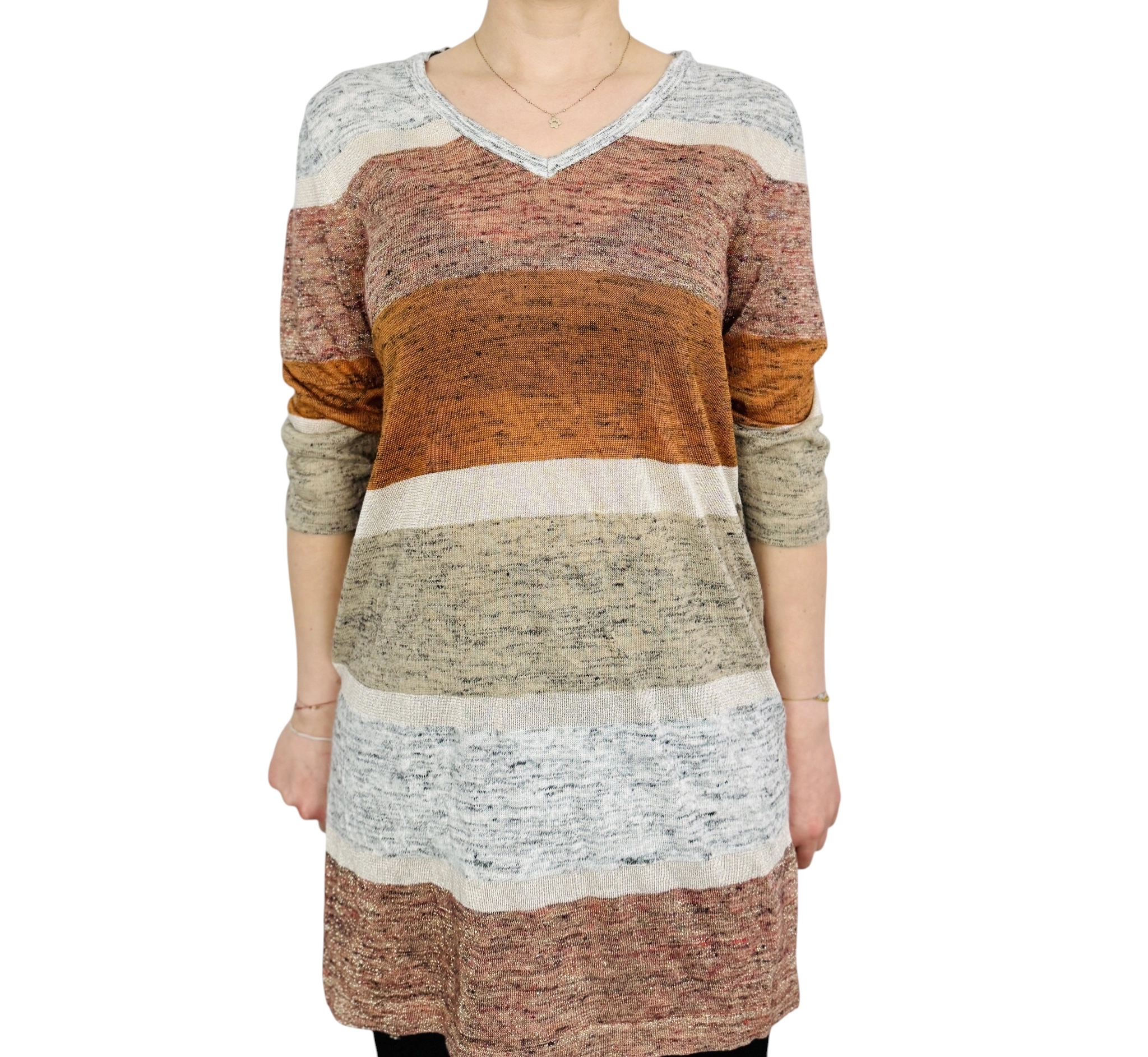 Ten sweterek to wyjątkowe połączenie przytulności i subtelnej, codziennej elegancji, które doskonale wpisuje się w styl casual z nutą naturalnego ciepła. Stonowana paleta barw oparta na odcieniach beżu, kremu, karmelu i delikatnej szarości tworzy harmonijną kompozycję poziomych pasów, nadając całości spokojnego, ale bardzo stylowego charakteru. To model, który otula wizualnie i wprowadza do stylizacji przyjemną, jesienną aurę.
