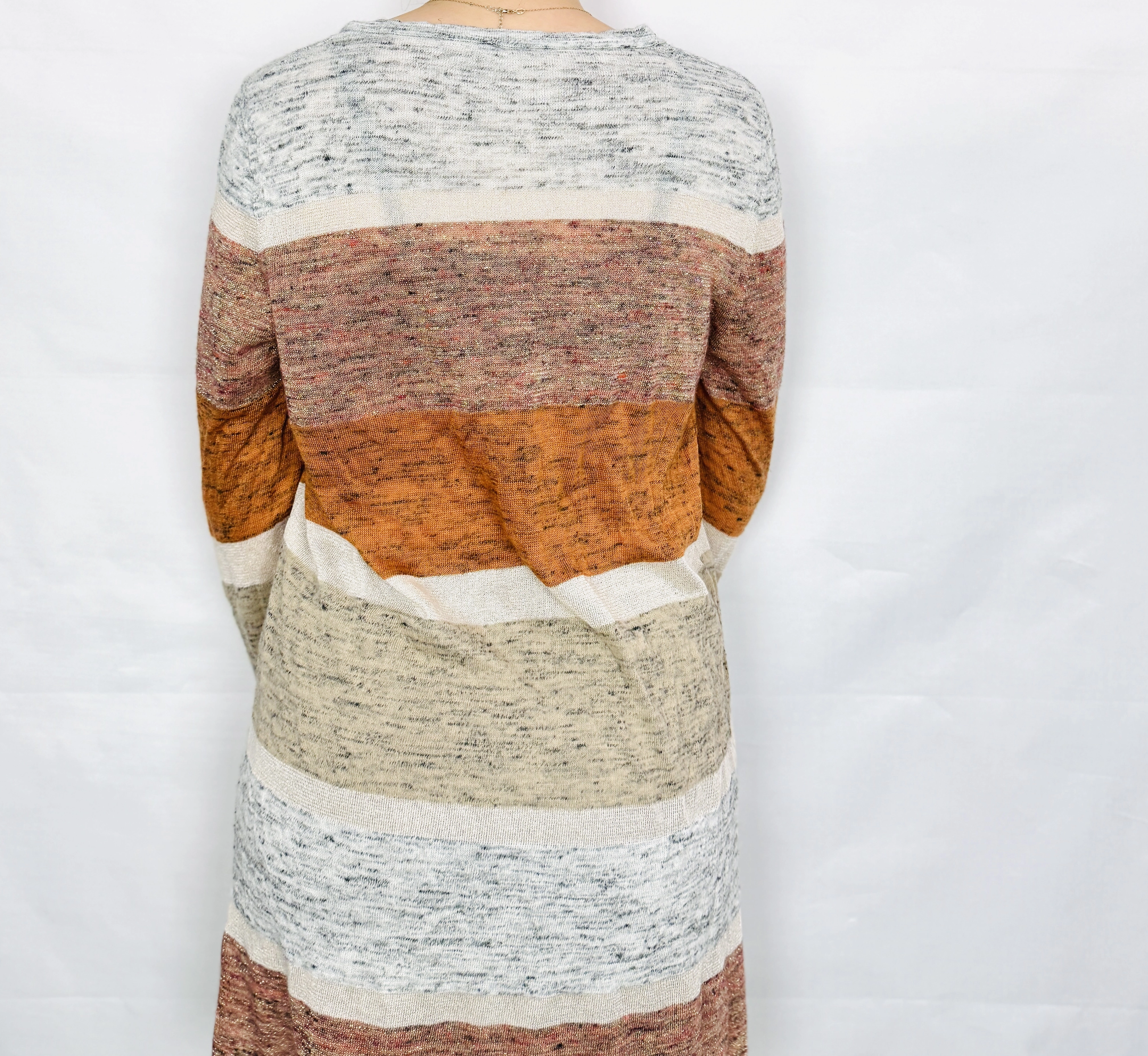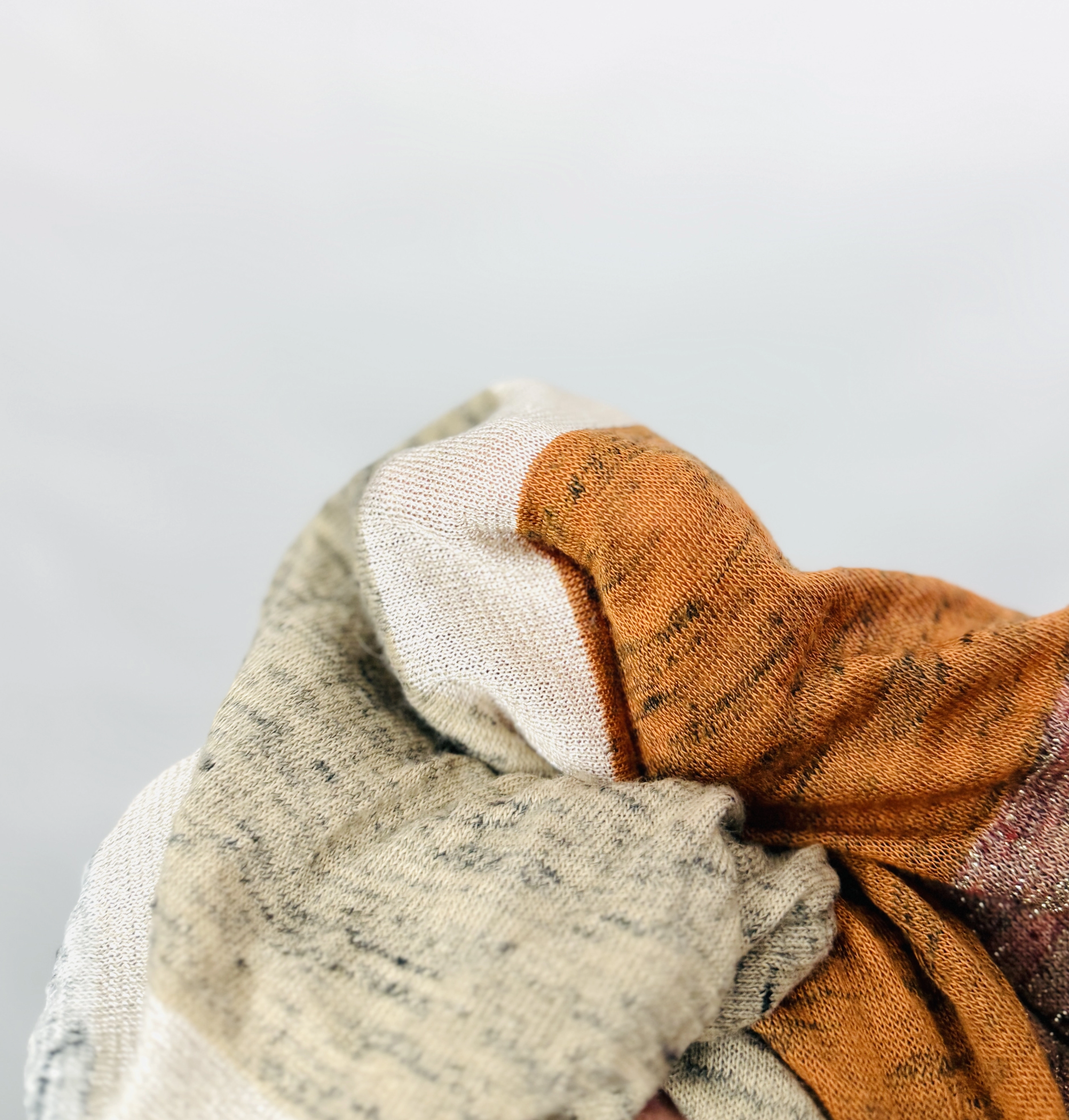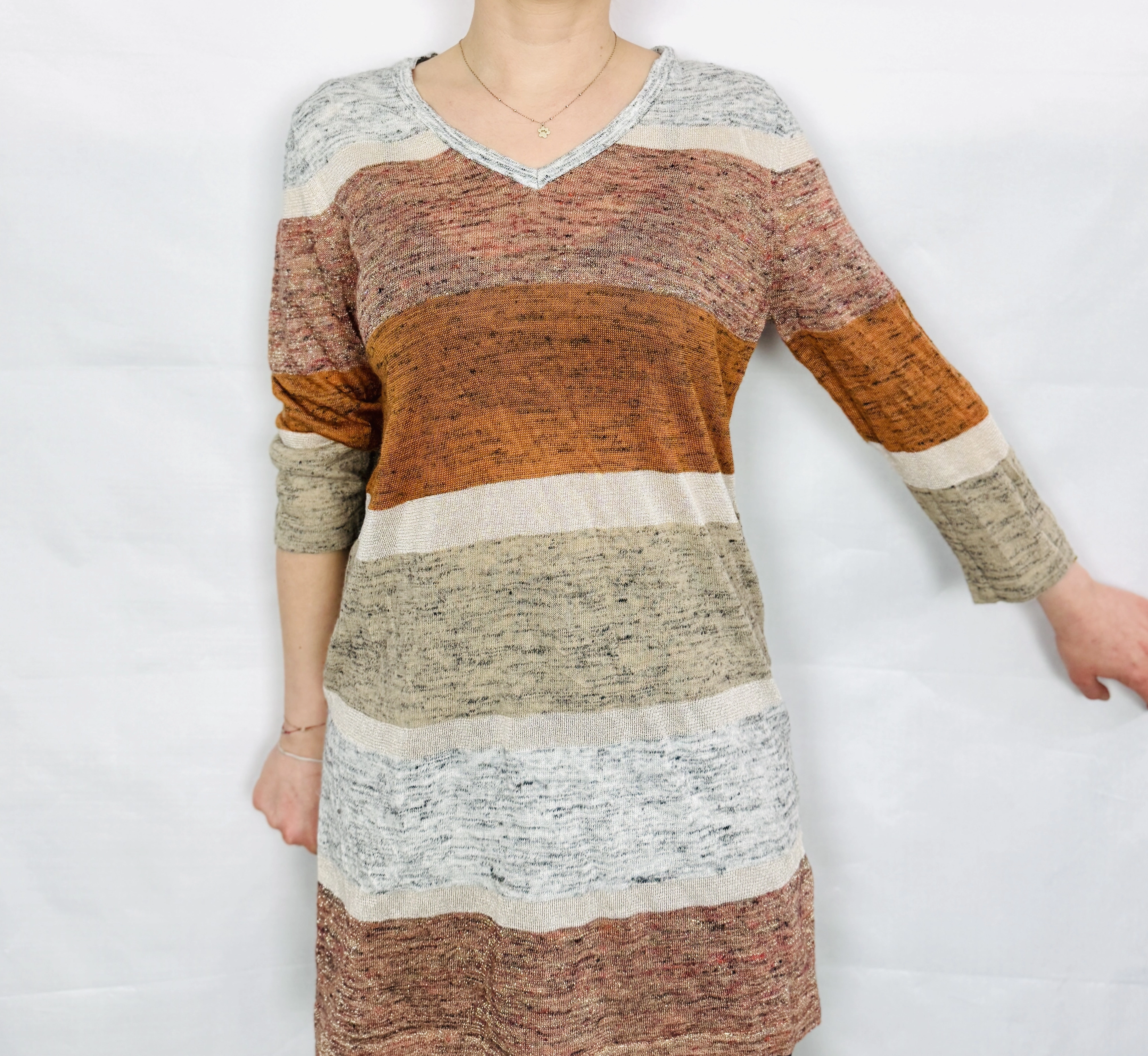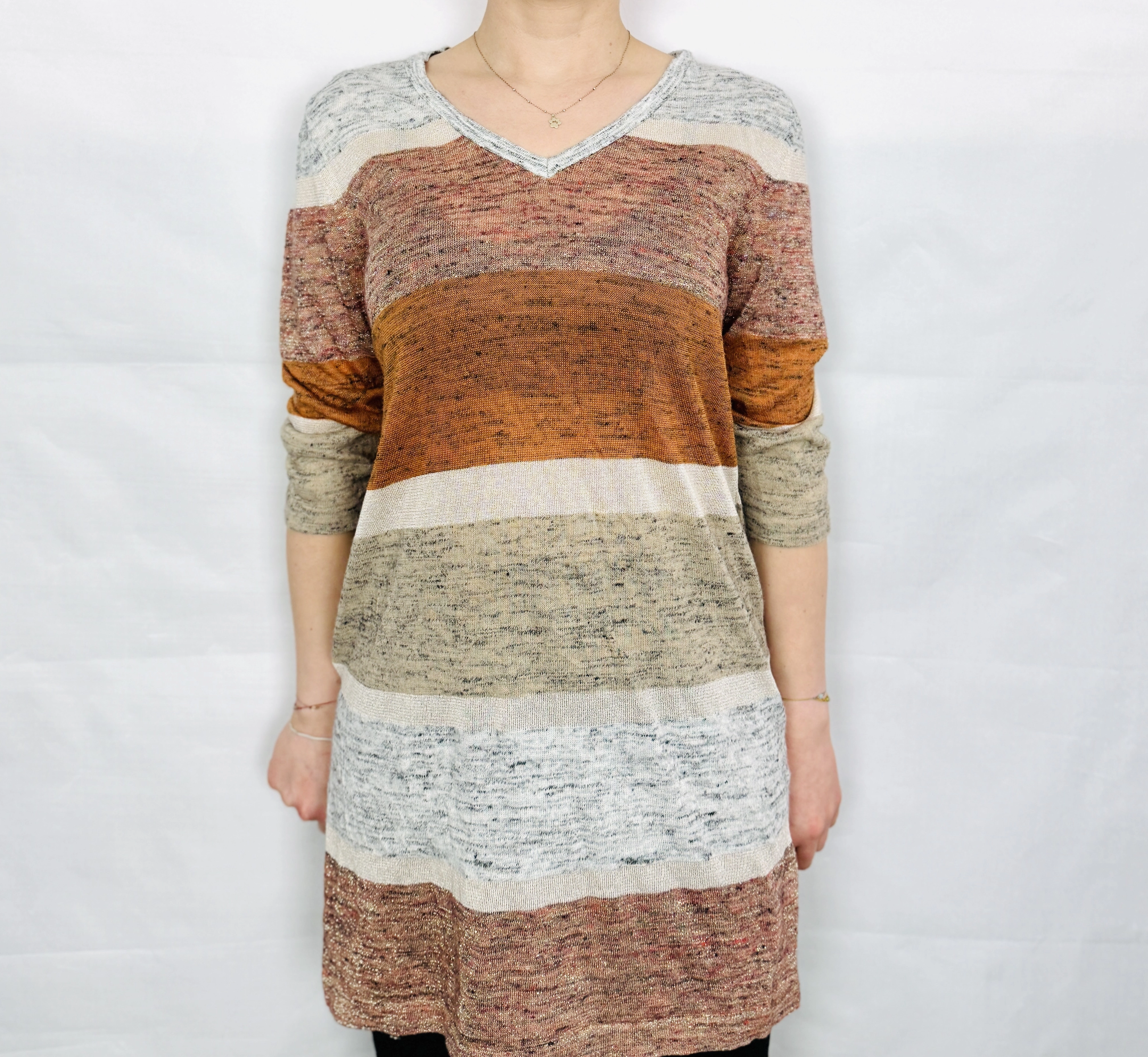 Materiał sprawia wrażenie cienkiego, miękkiego i delikatnie otulającego, dzięki czemu sweterek komfortowo dopasowuje się do ciała bez uczucia ciężkości. Struktura tkaniny jest lekko melanżowa, co dodaje głębi kolorom i sprawia, że pasy wyglądają bardziej naturalnie i ciekawie. Całość układa się płynnie, tworząc przyjemny efekt lekkości i swobody.