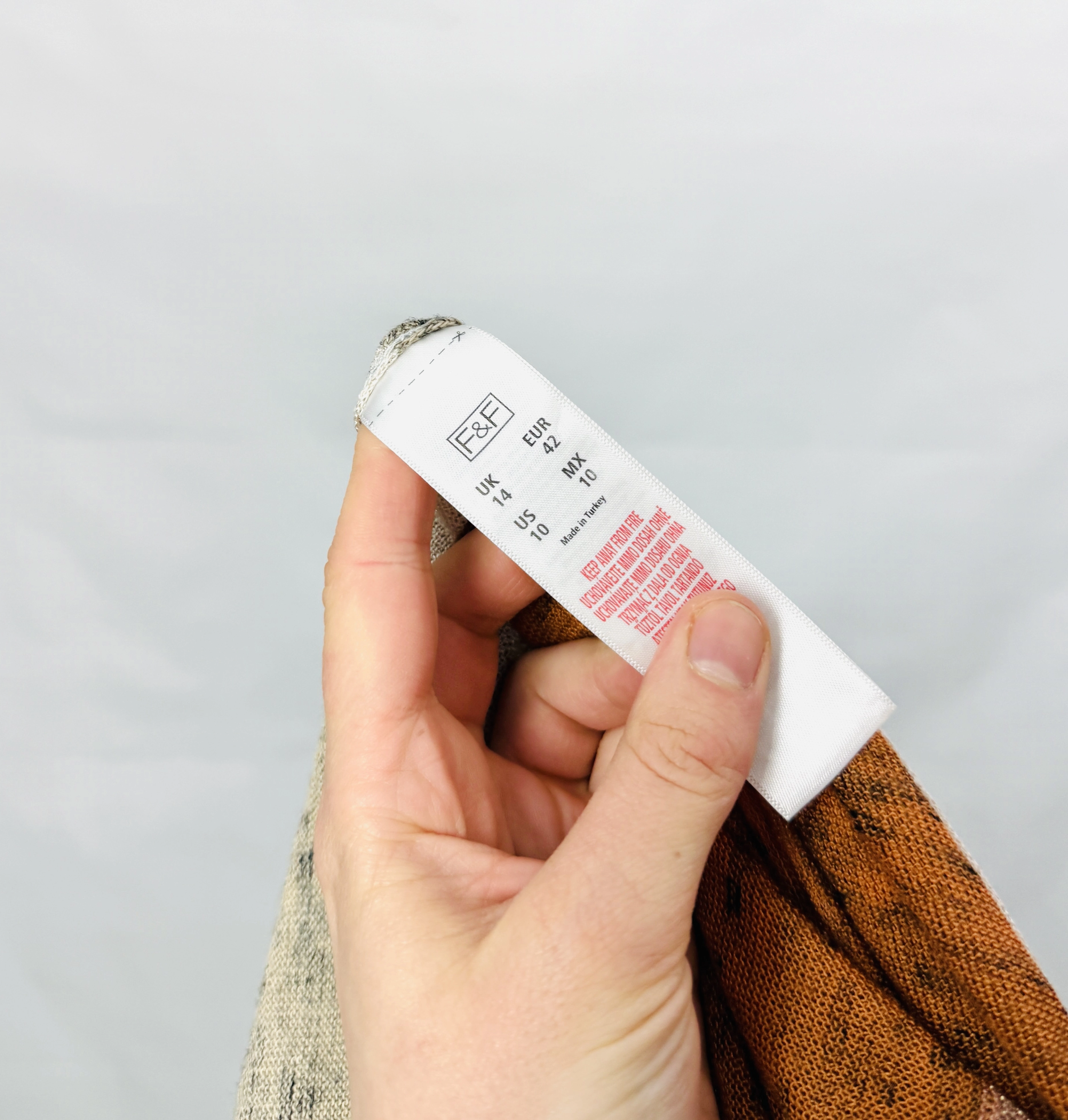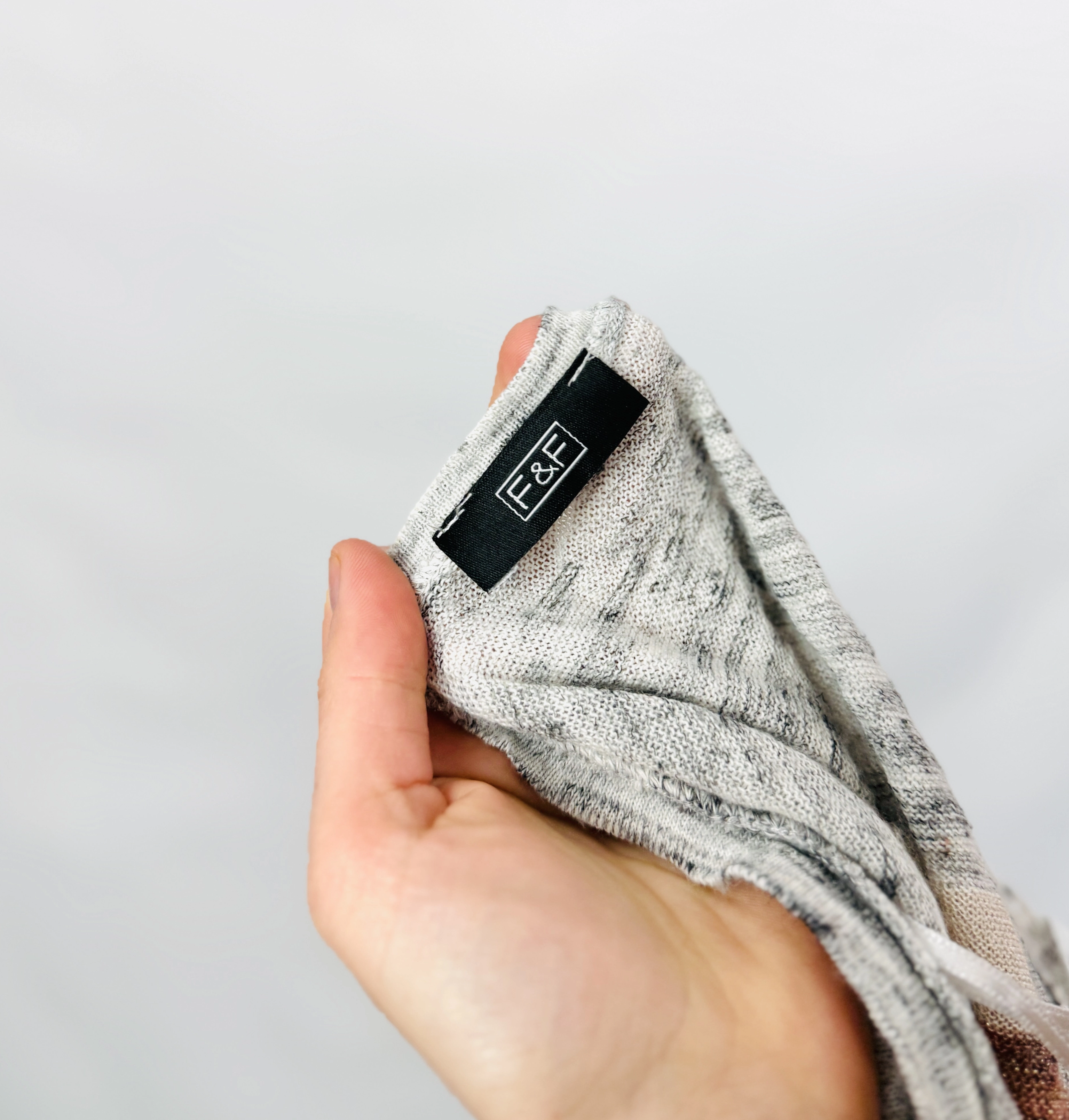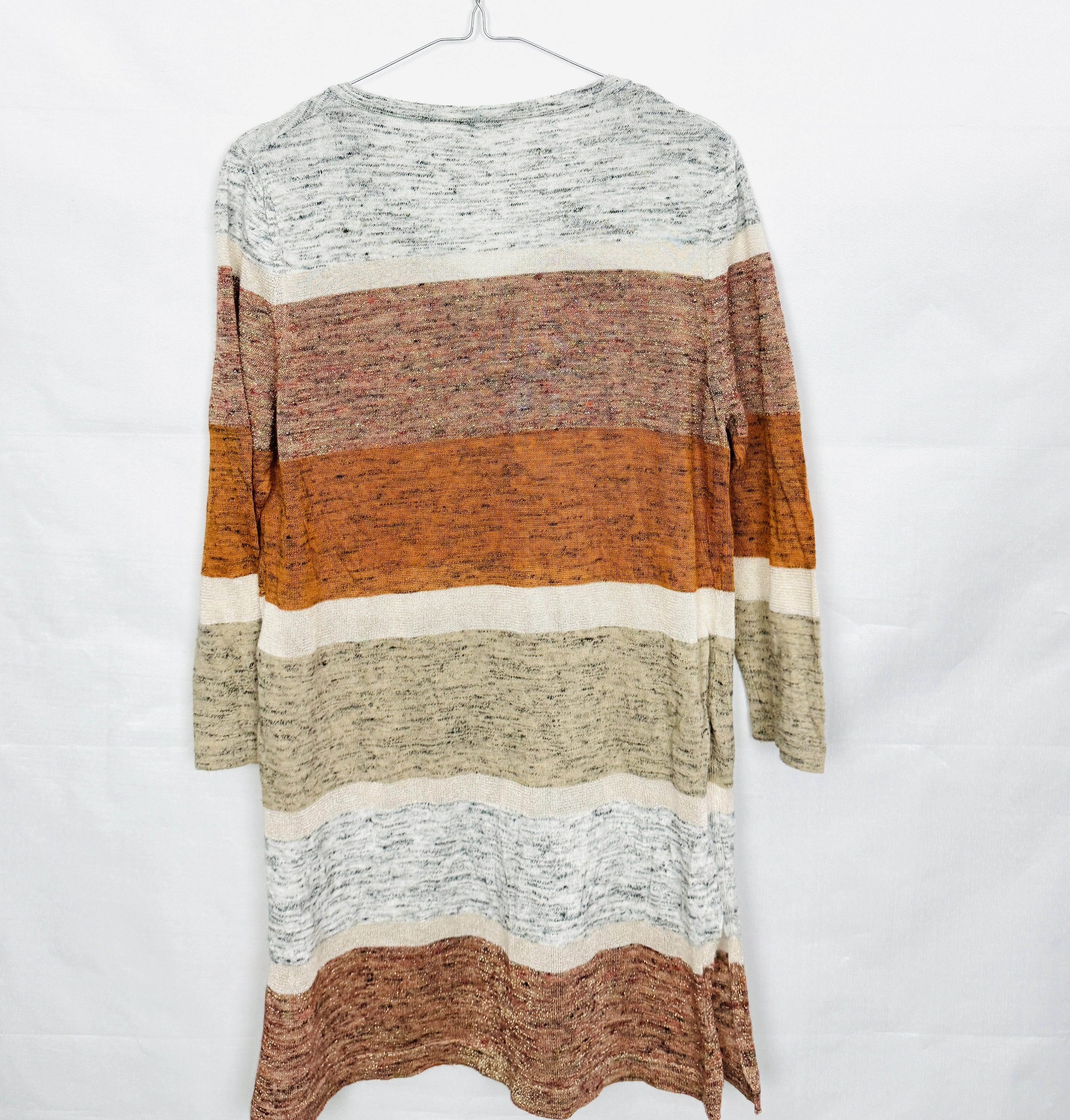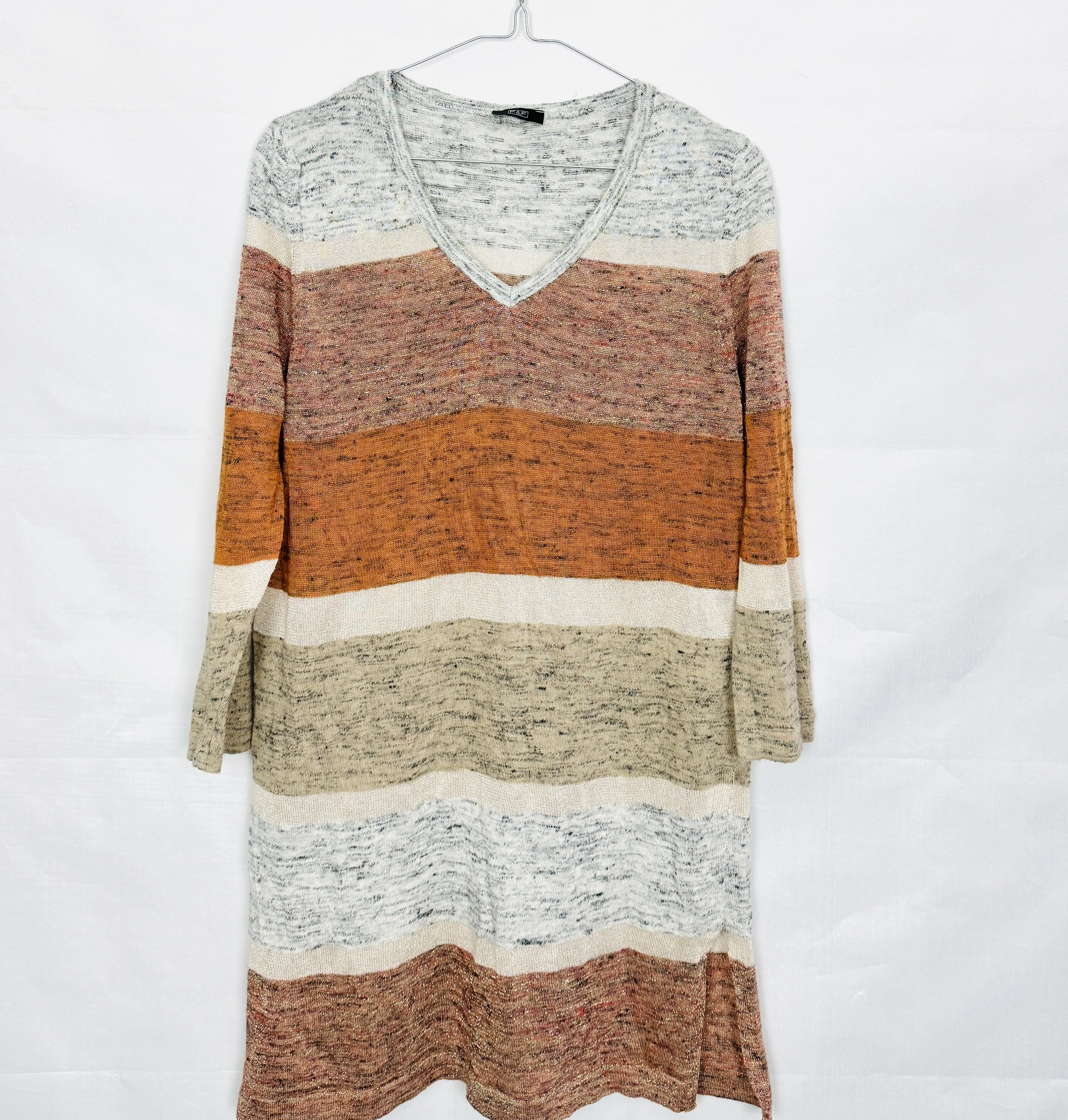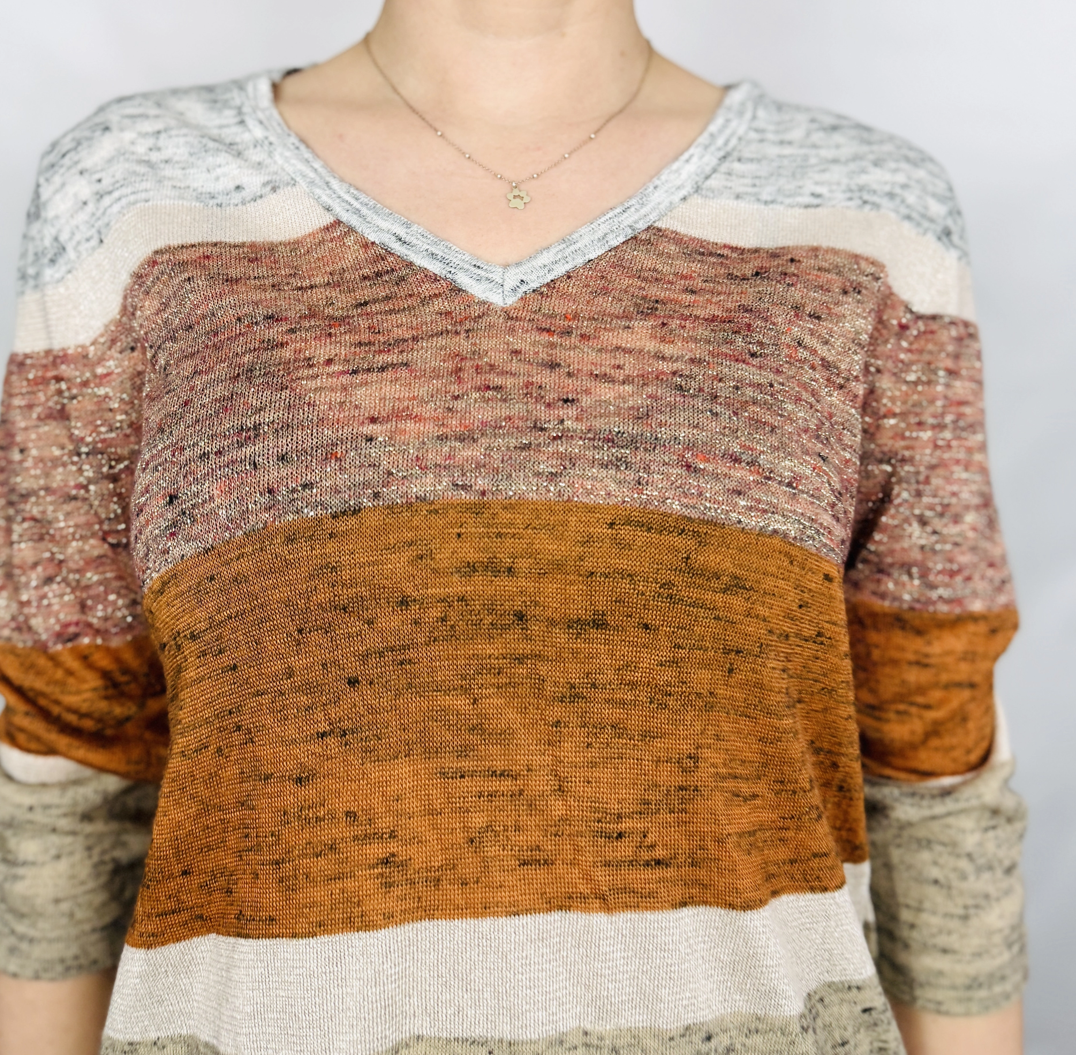 Materiał sprawia wrażenie cienkiego, miękkiego i delikatnie otulającego, dzięki czemu sweterek komfortowo dopasowuje się do ciała bez uczucia ciężkości. Struktura tkaniny jest lekko melanżowa, co dodaje głębi kolorom i sprawia, że pasy wyglądają bardziej naturalnie i ciekawie. Całość układa się płynnie, tworząc przyjemny efekt lekkości i swobody.