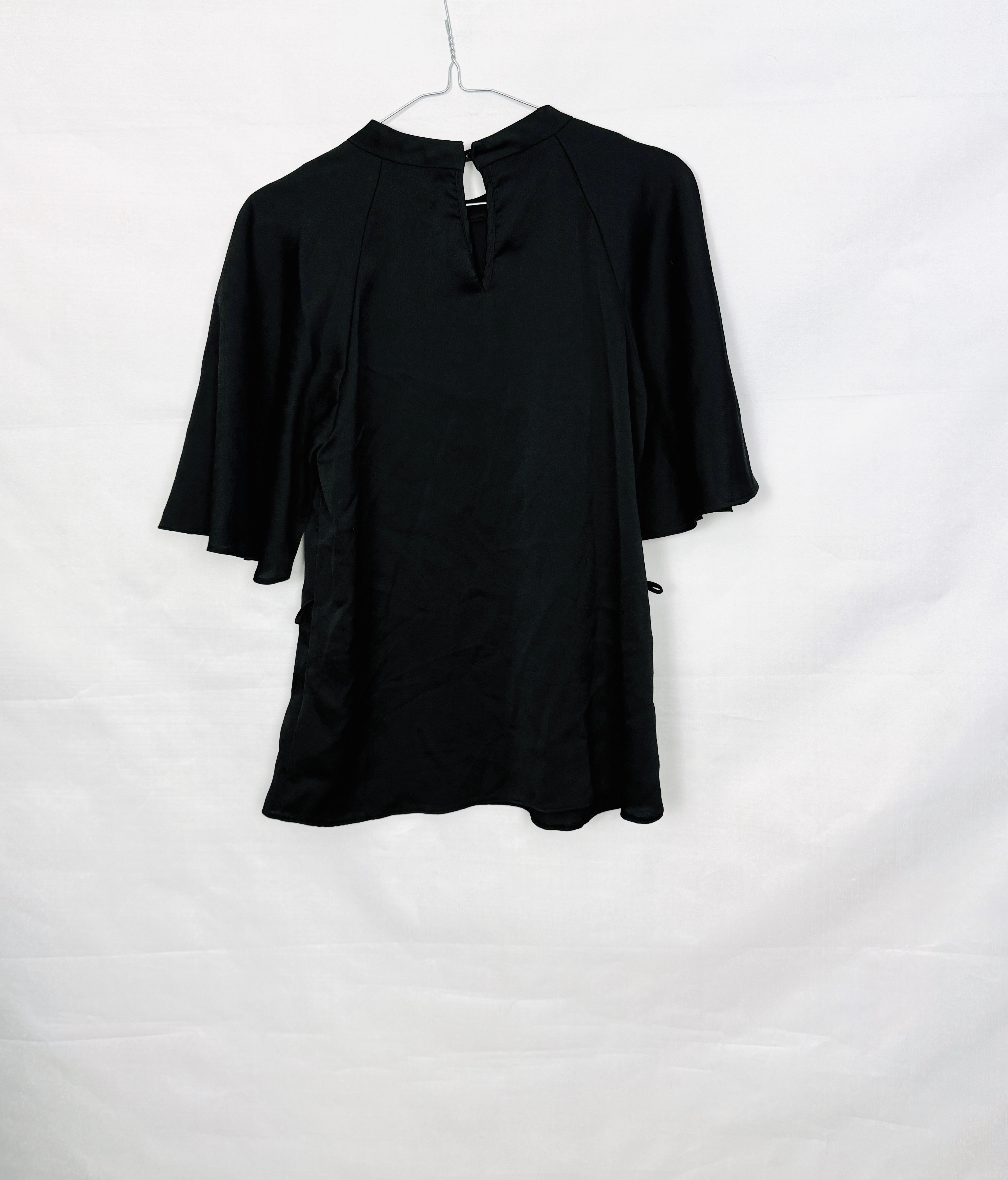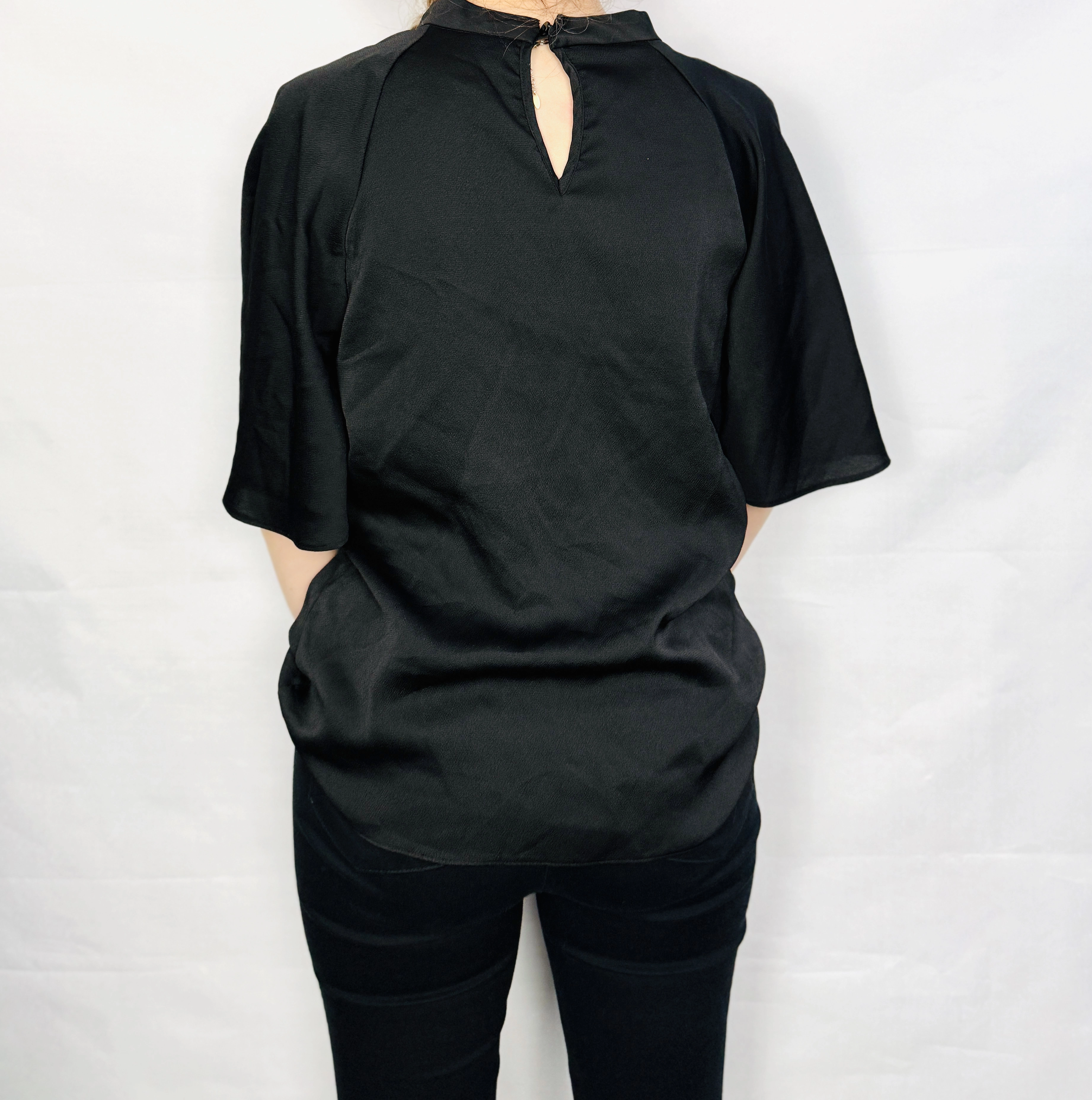 To wyrafinowana i kobieca bluzka, która łączy w sobie elegancję wieczorowego szyku z lekką nonszalancją codziennego stylu. Głęboka czerń i delikatny połysk nadają jej uniwersalnego charakteru — jest jednocześnie subtelna i wyrazista, gotowa, by stać się centralnym punktem zarówno eleganckiej, jak i bardziej swobodnej stylizacji. Jej prosta forma podkreślona została efektownymi rękawami oraz minimalistyczną stójką, dzięki czemu bluzka zachowuje ponadczasowy szyk z nutą nowoczesnej teatralności.
