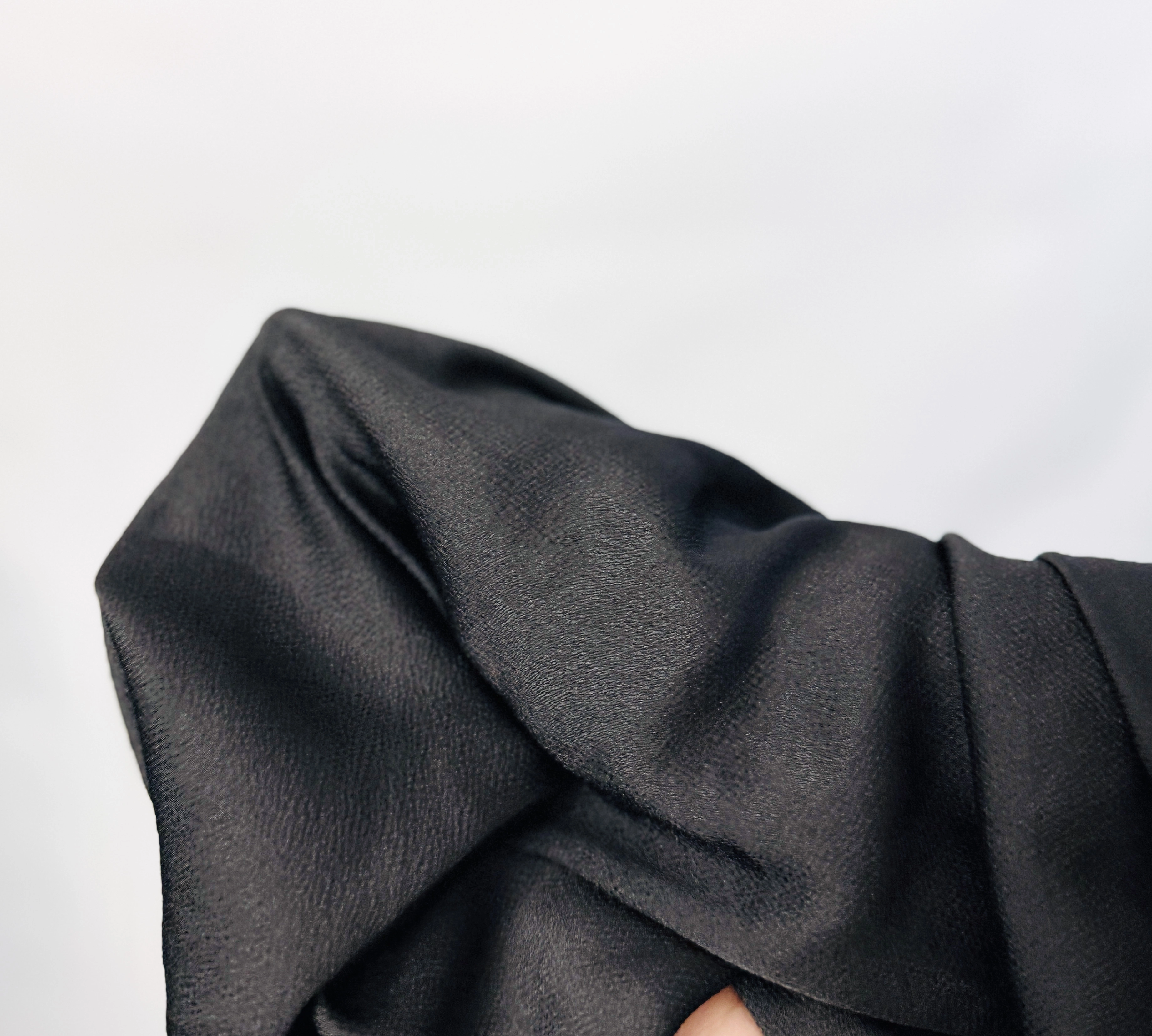 Materiał prezentuje się jako gładki i delikatnie lejący, o satynowym połysku, który subtelnie reaguje na światło, nadając powierzchni eleganckiego blasku bez efektu przesady. Tkanina układa się miękko, tworząc ładne, falujące linie przy rękawach i tułowiu, co dodaje ubraniu lekkości i dynamiki. Poziom połysku sprawia, że bluzka świetnie sprawdzi się w zestawieniach wymagających eleganckiego wykończenia, a jednocześnie materiał pozostaje wystarczająco stonowany, by pasować do codziennych kombinacji.