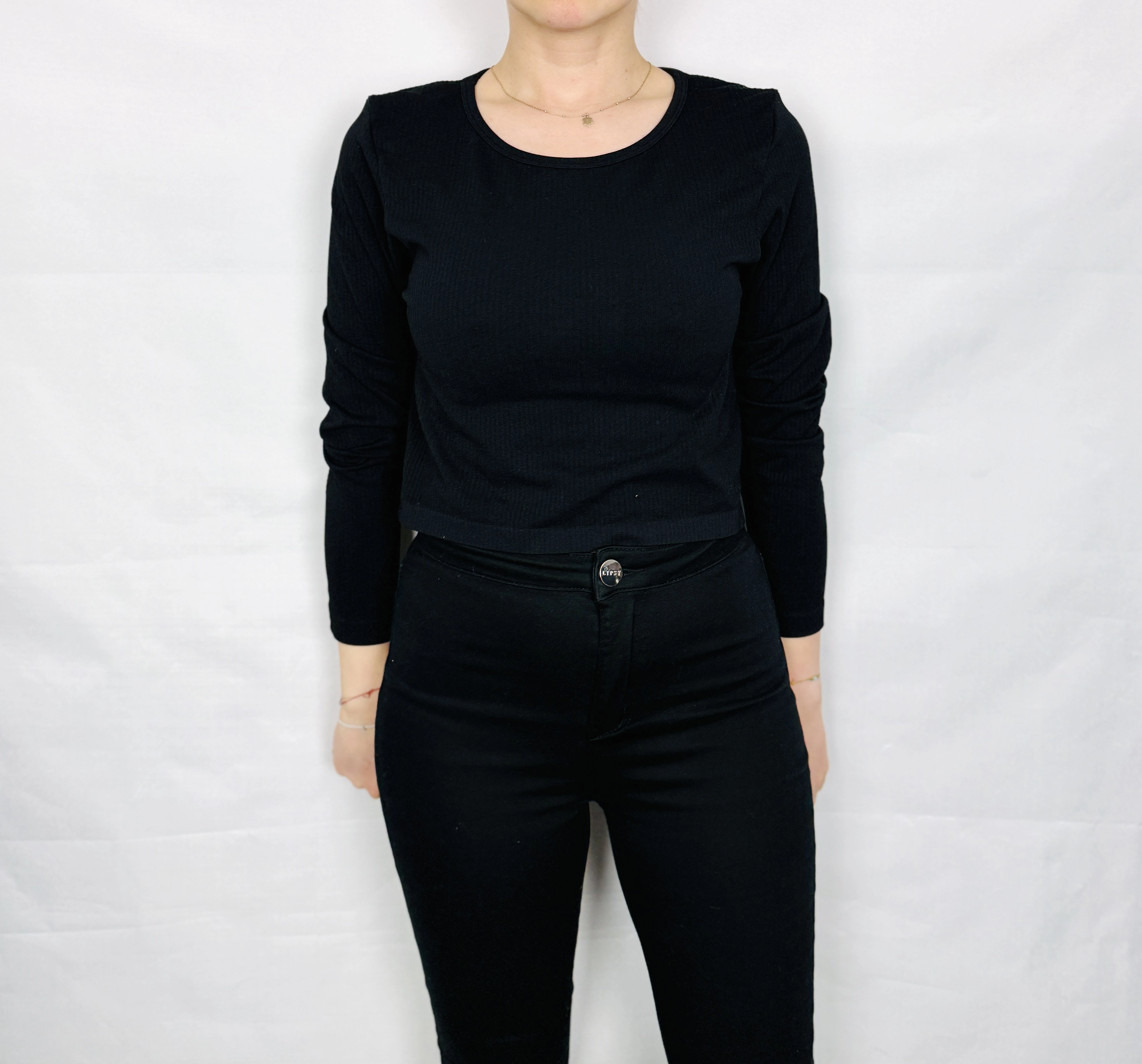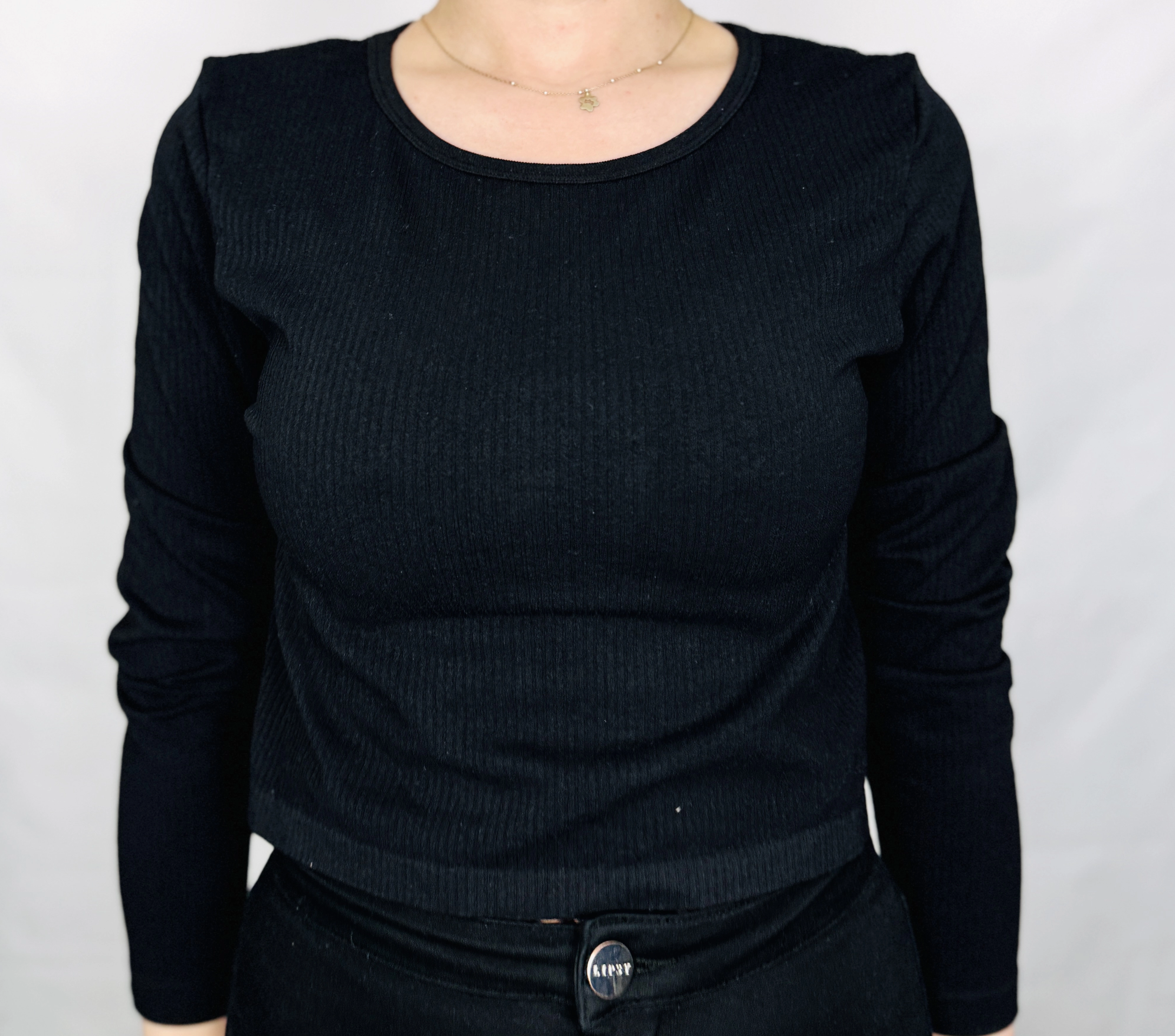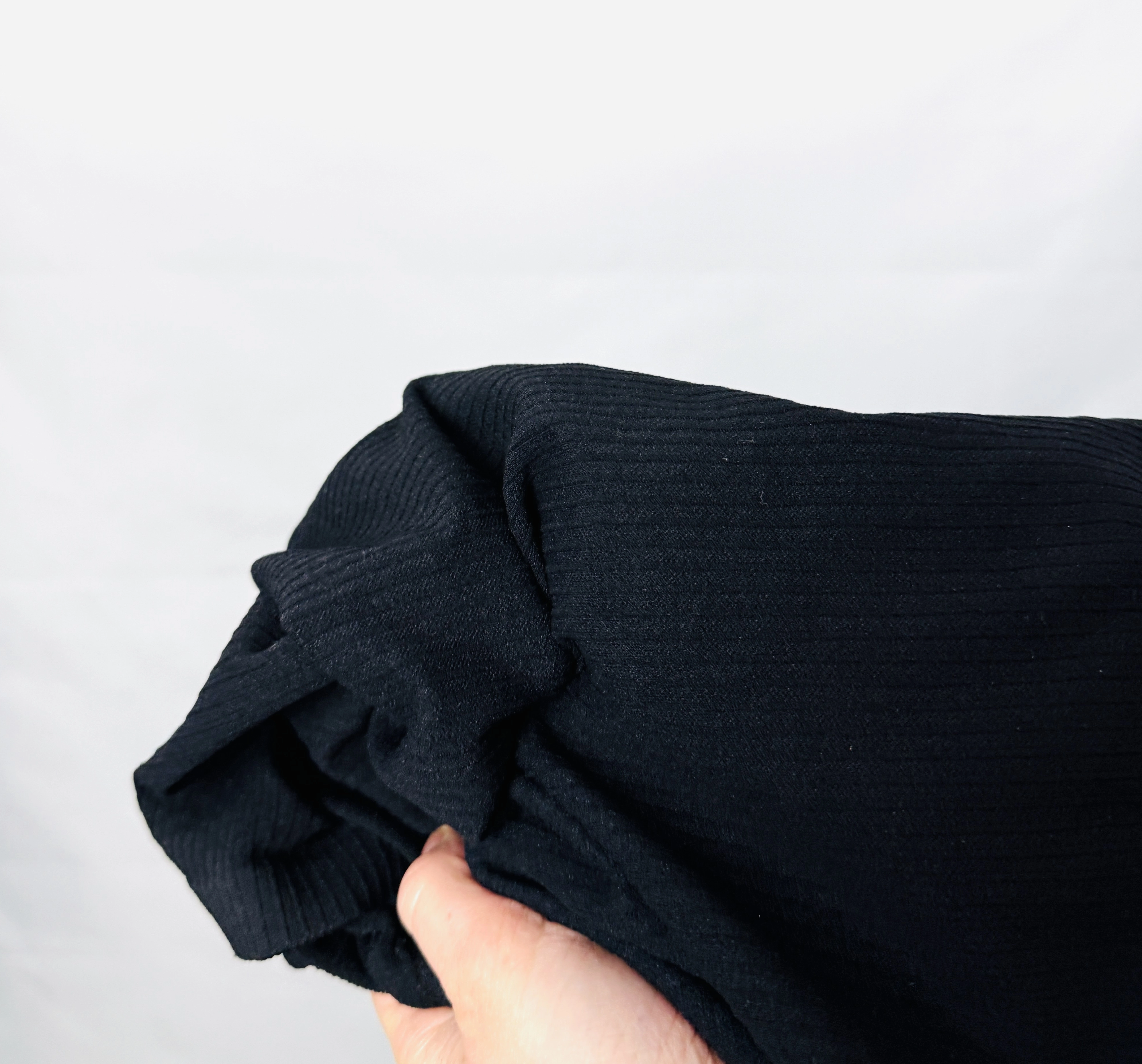 Materiał, z którego wykonano bluzkę, charakteryzuje się delikatną strukturą drobnego prążka, co dodaje tkaninie głębi i sprawia, że produkt wygląda na szlachetniejszy niż zwykła bawełniana koszulka. Dzianina jest wyjątkowo miękka, gładsza w dotyku i cechuje się dużą elastycznością, dzięki czemu idealnie dopasowuje się do figury. Materiał sprawia wrażenie nieco grubszego i otulającego, co gwarantuje przyjemne odczucie na skórze oraz trwałość fasonu. Sposób, w jaki dzianina absorbuje światło, podkreśla matowy finisz czerni, nadając ubraniu eleganckiego i stonowanego wykończenia.