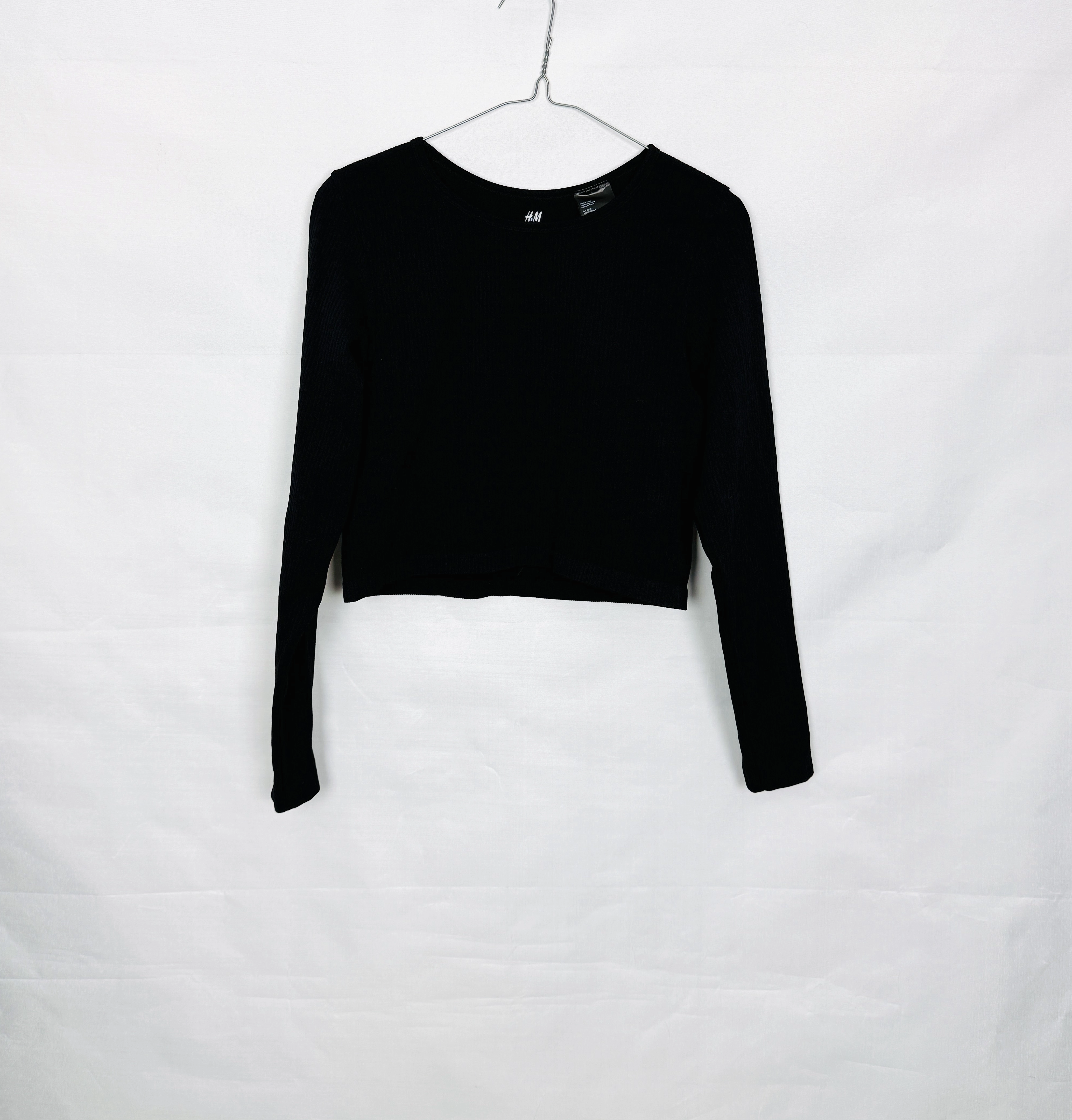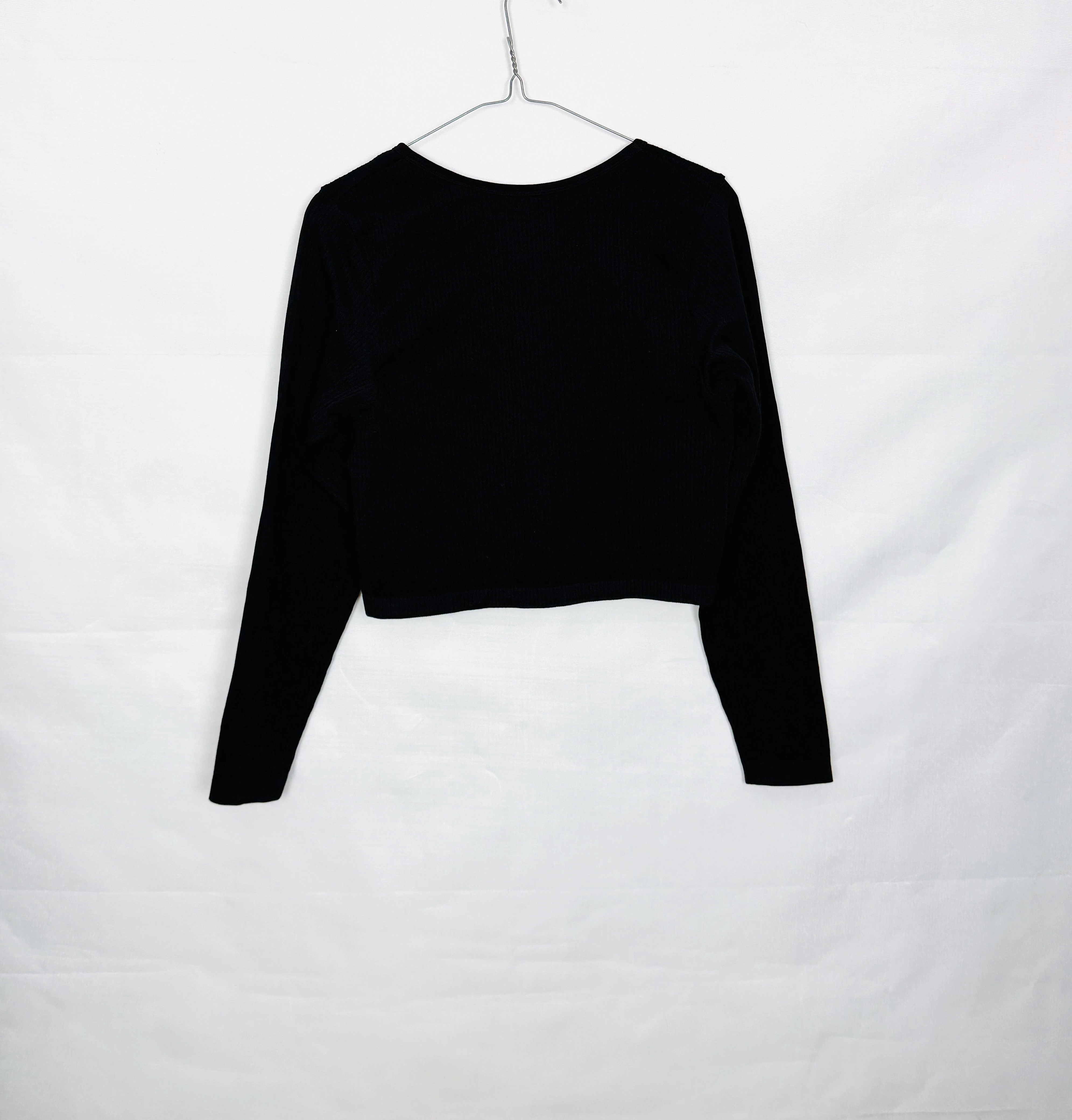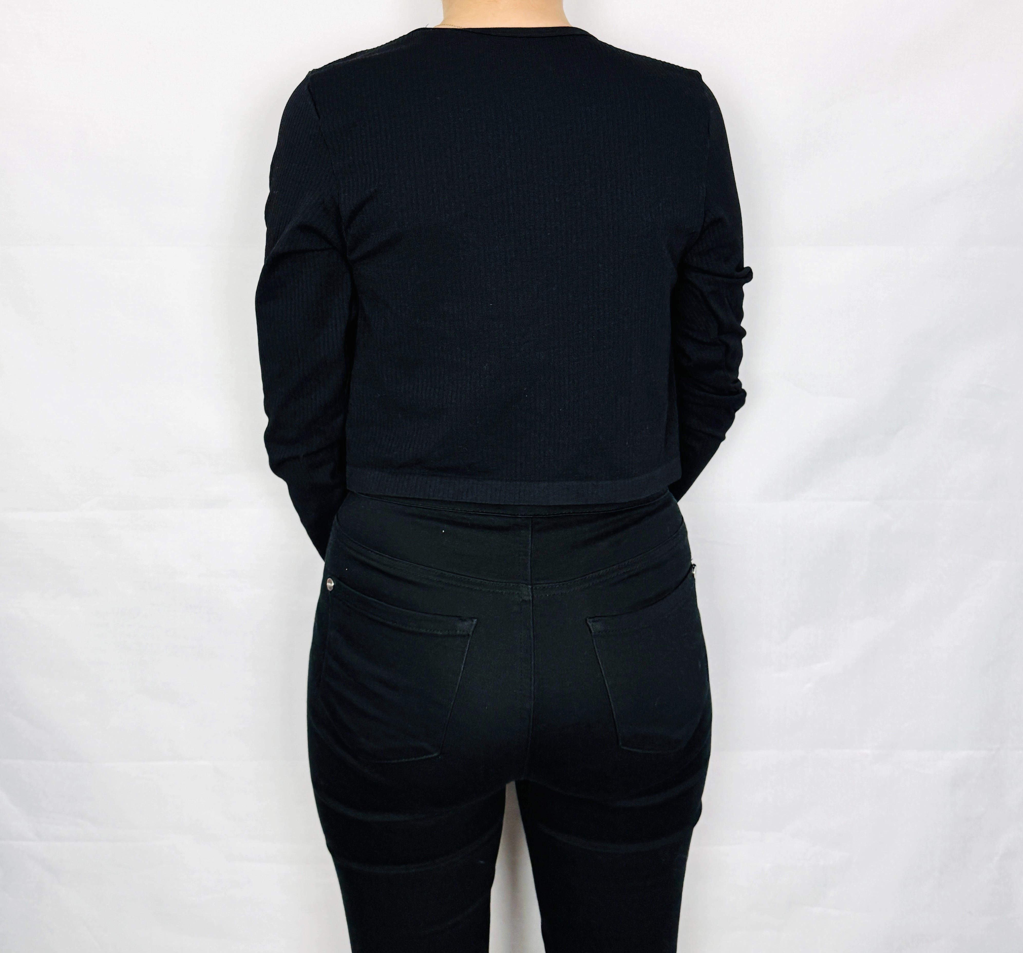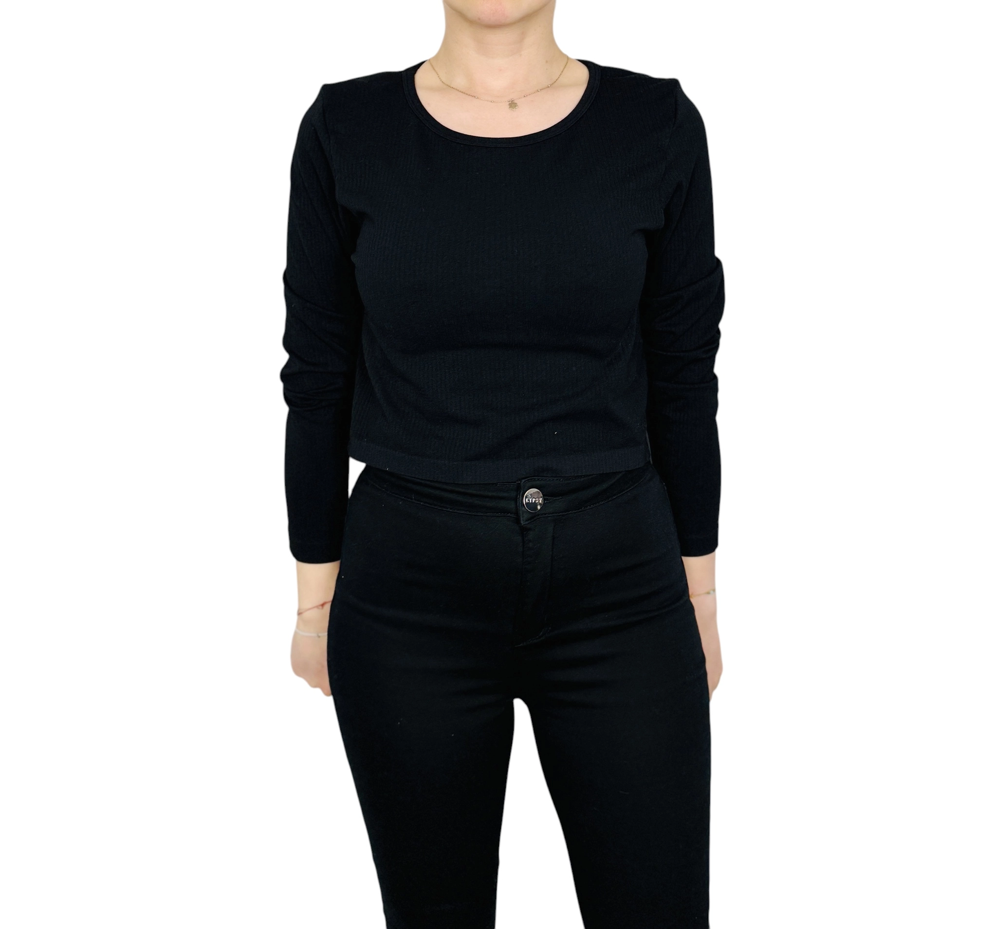 Materiał, z którego wykonano bluzkę, charakteryzuje się delikatną strukturą drobnego prążka, co dodaje tkaninie głębi i sprawia, że produkt wygląda na szlachetniejszy niż zwykła bawełniana koszulka. Dzianina jest wyjątkowo miękka, gładsza w dotyku i cechuje się dużą elastycznością, dzięki czemu idealnie dopasowuje się do figury. Materiał sprawia wrażenie nieco grubszego i otulającego, co gwarantuje przyjemne odczucie na skórze oraz trwałość fasonu. Sposób, w jaki dzianina absorbuje światło, podkreśla matowy finisz czerni, nadając ubraniu eleganckiego i stonowanego wykończenia.