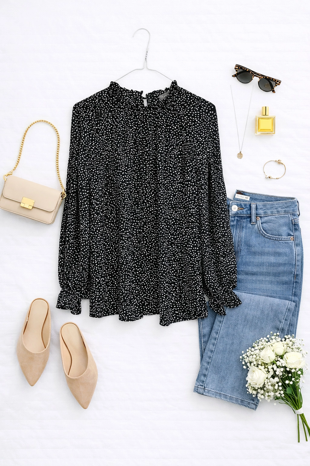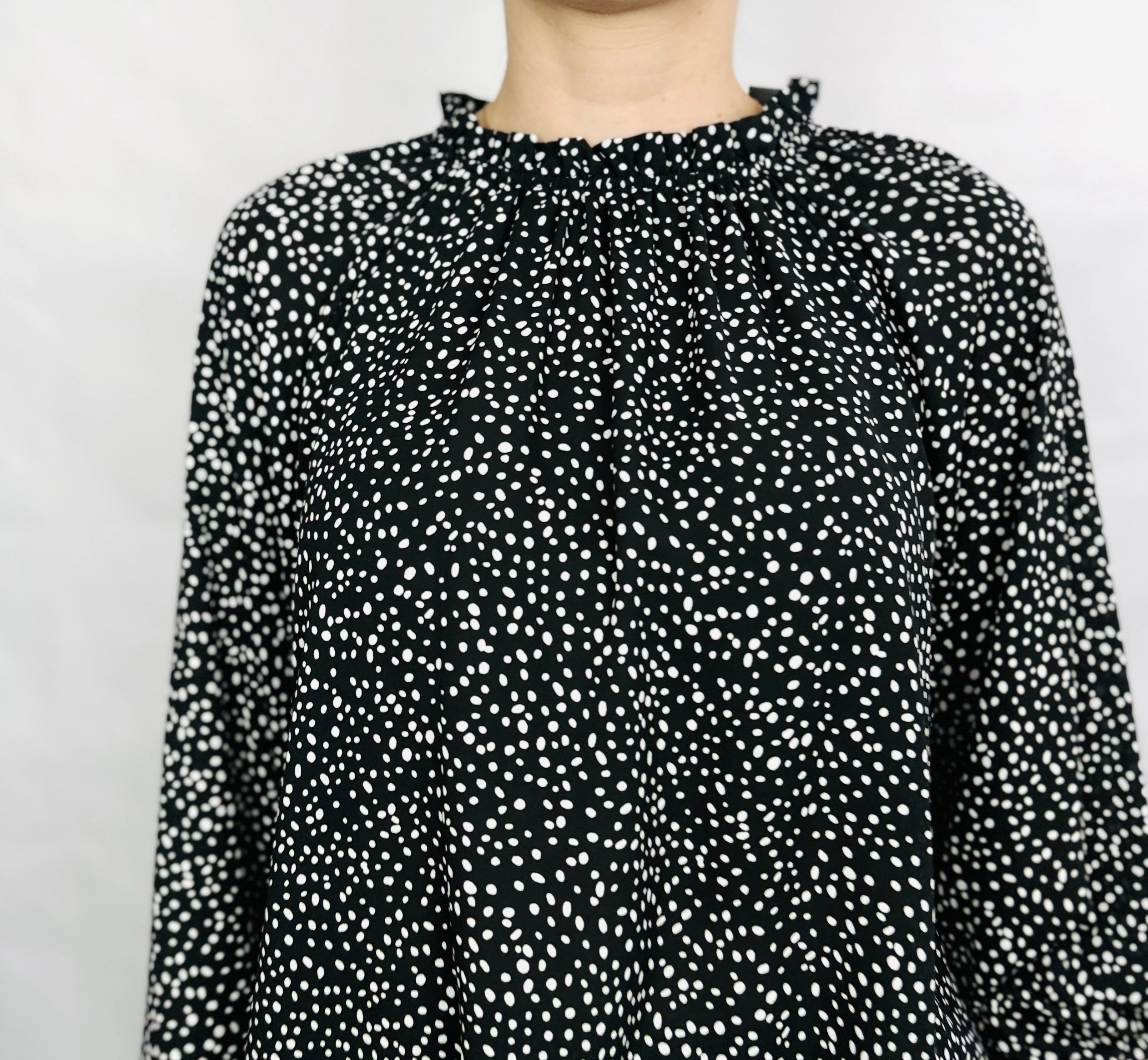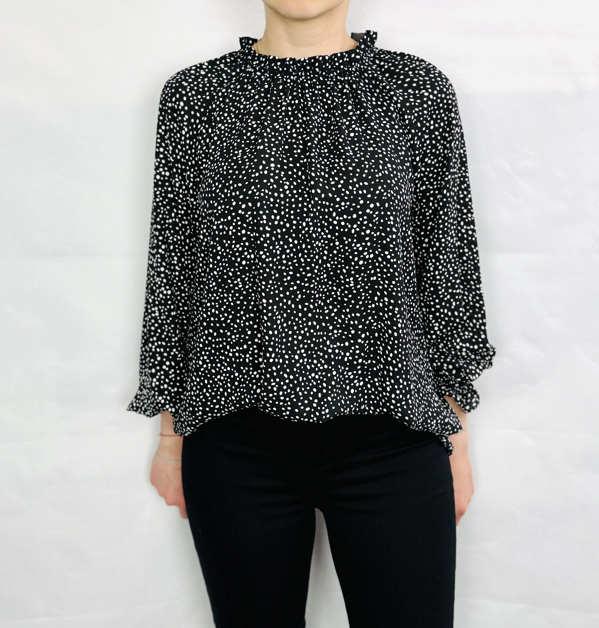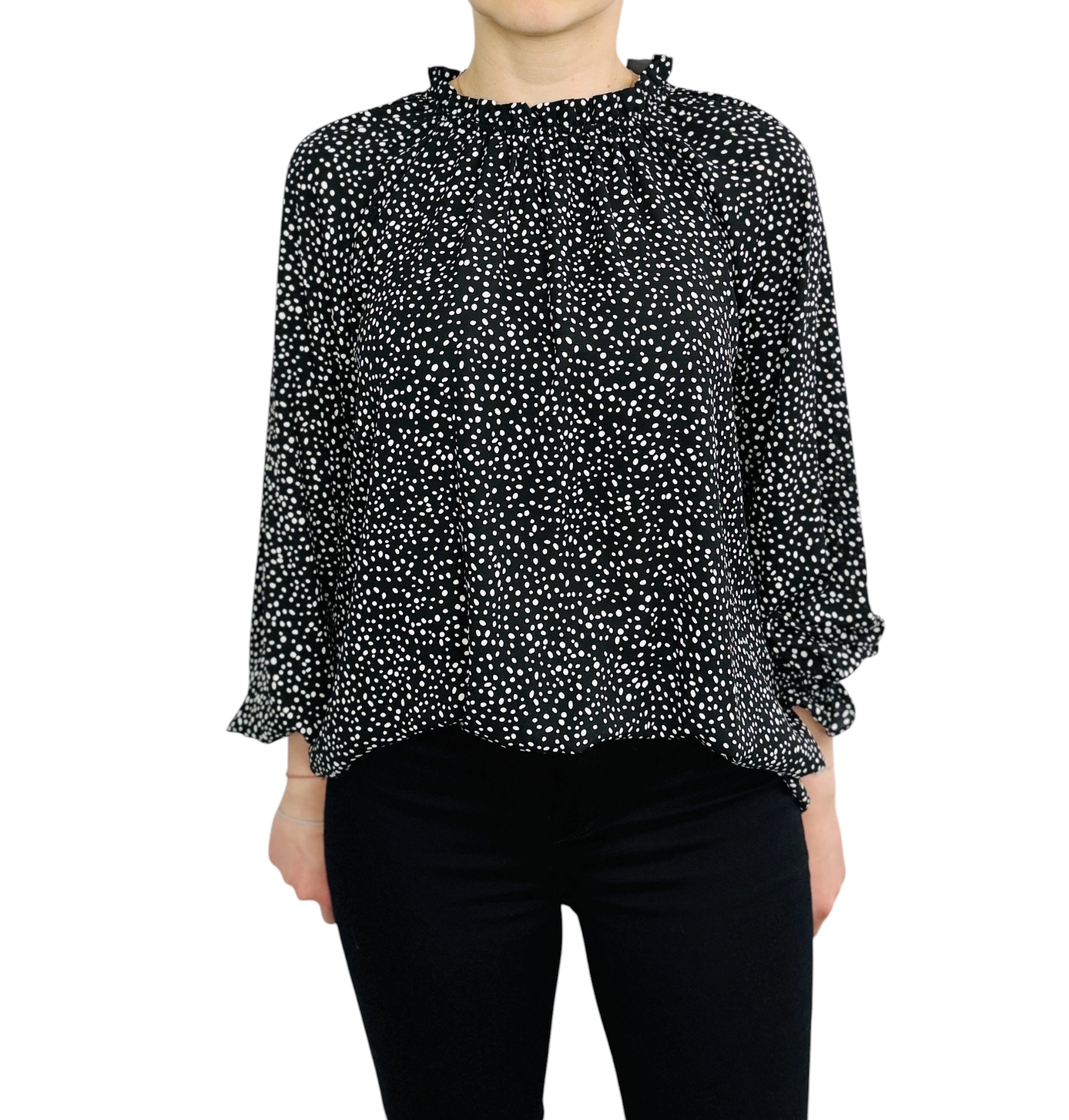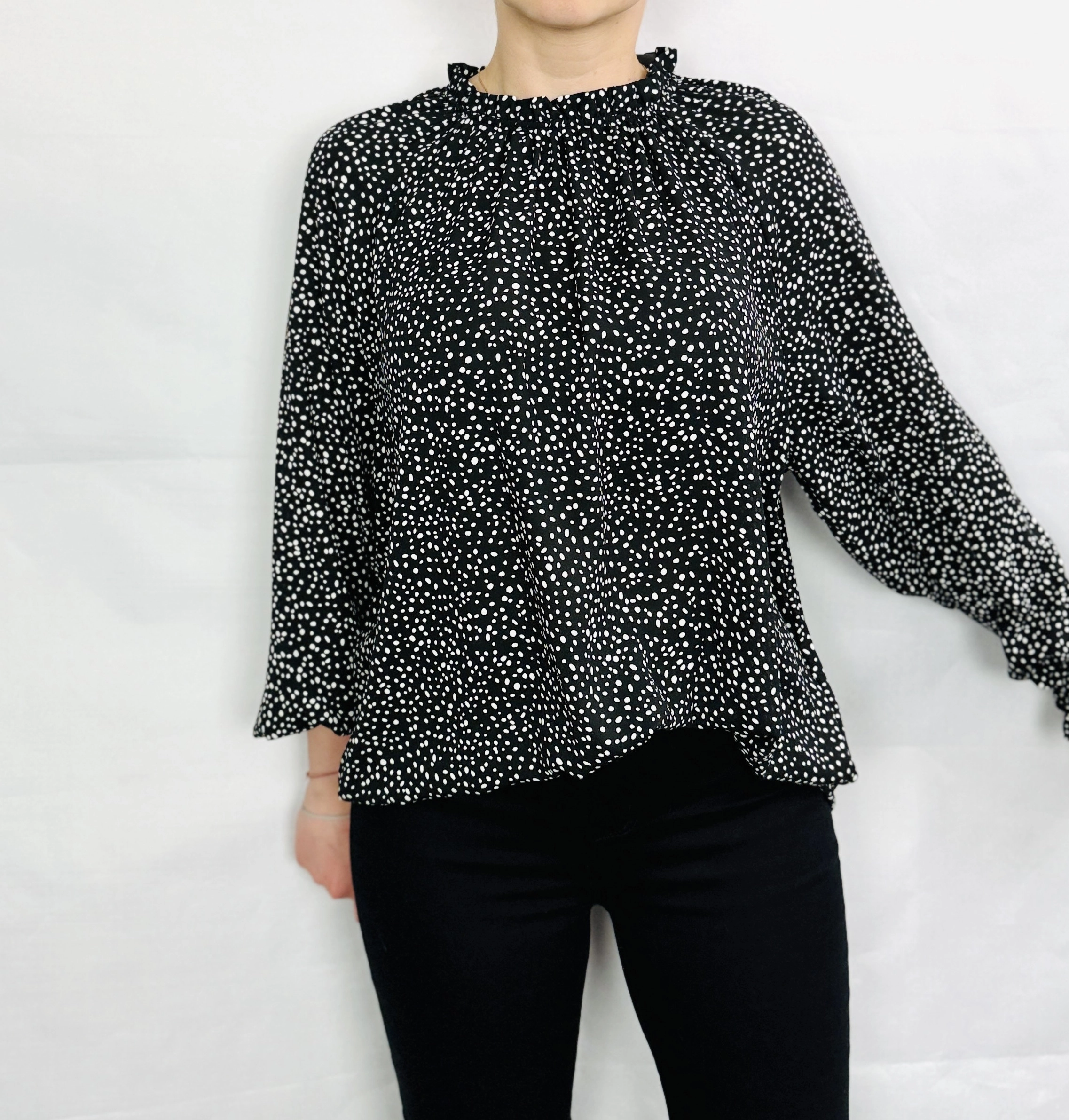 Długość bluzki sięga do bioder, co czyni ją praktyczną i łatwą do łączenia z różnorodnymi elementami garderoby. Doskonale komponuje się zarówno z klasycznymi jeansami, jak i eleganckimi spódnicami czy spodniami o prostym kroju, tworząc stylizacje na wiele okazji – od codziennych spacerów, przez spotkania w pracy, aż po wieczorne wyjścia. Czarny kolor z białymi groszkami pozwala na łatwe łączenie z neutralnymi barwami, takimi jak biel, beż czy szarość, ale także z intensywnymi akcentami czerwieni czy różu, co daje szerokie możliwości stylizacyjne.