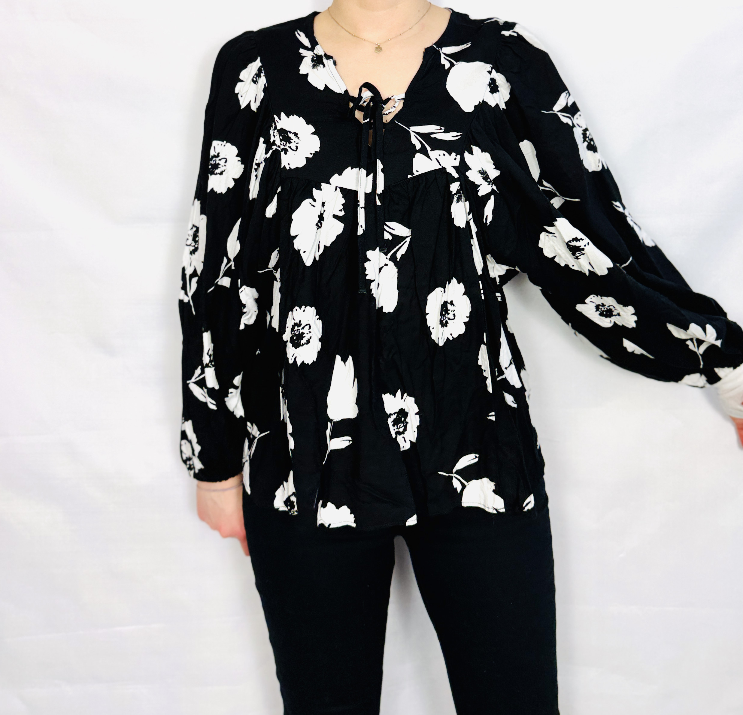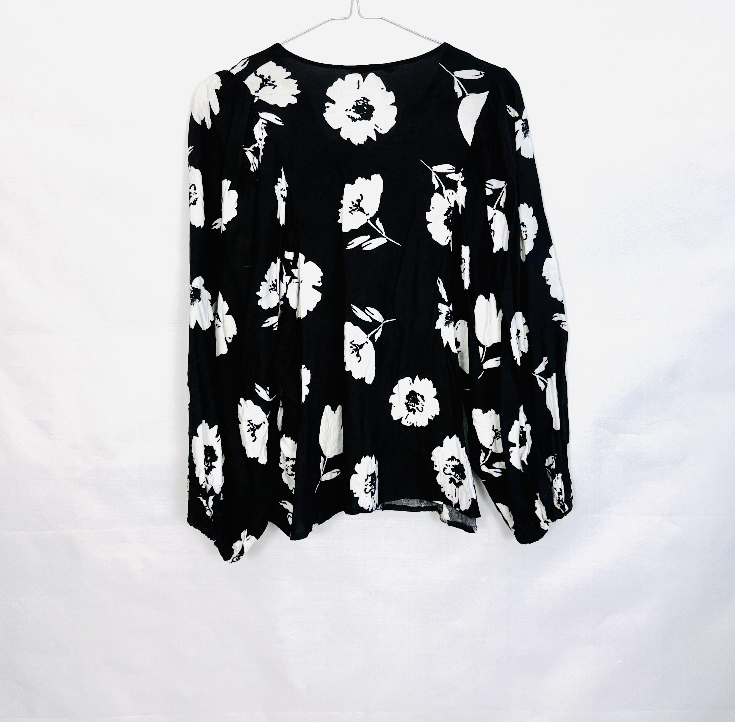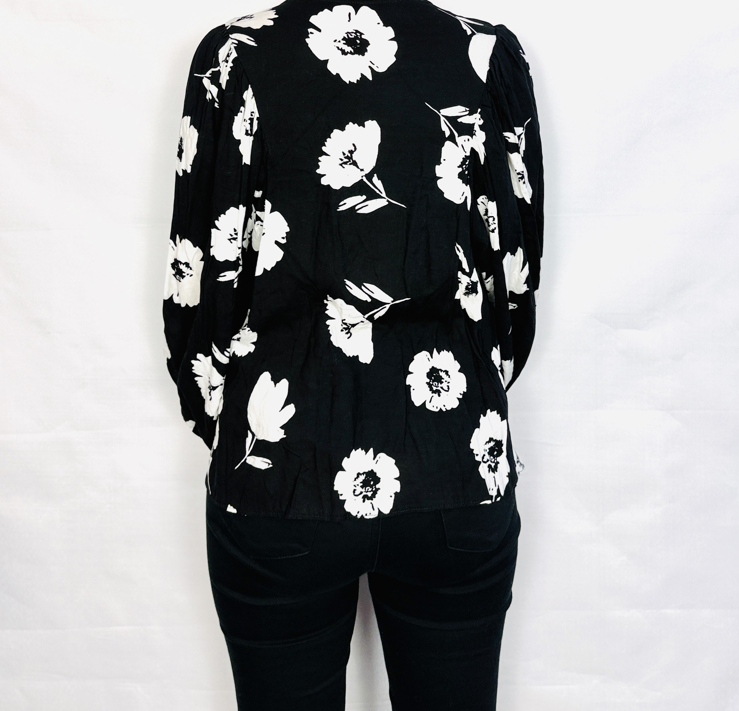 Czarna bluzka w duże białe kwiaty z wiązaniem S 36