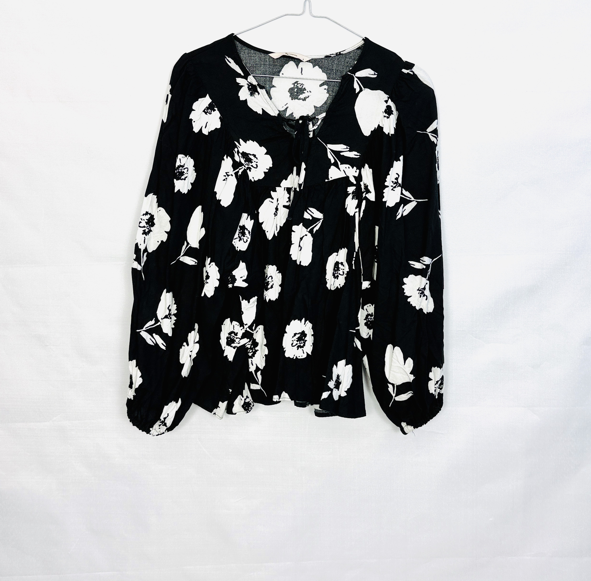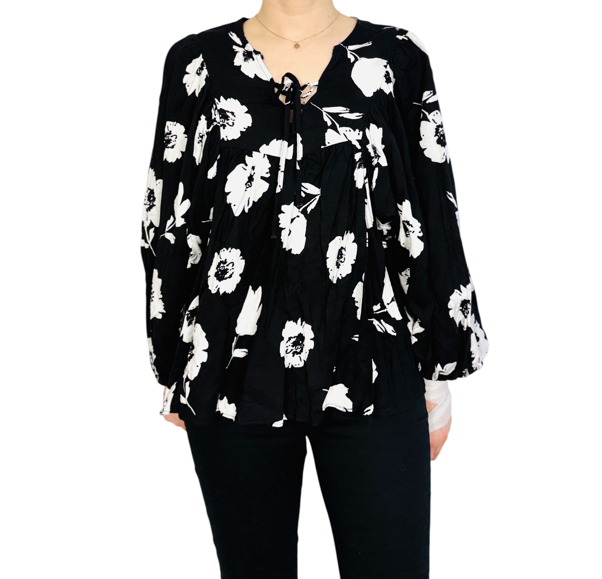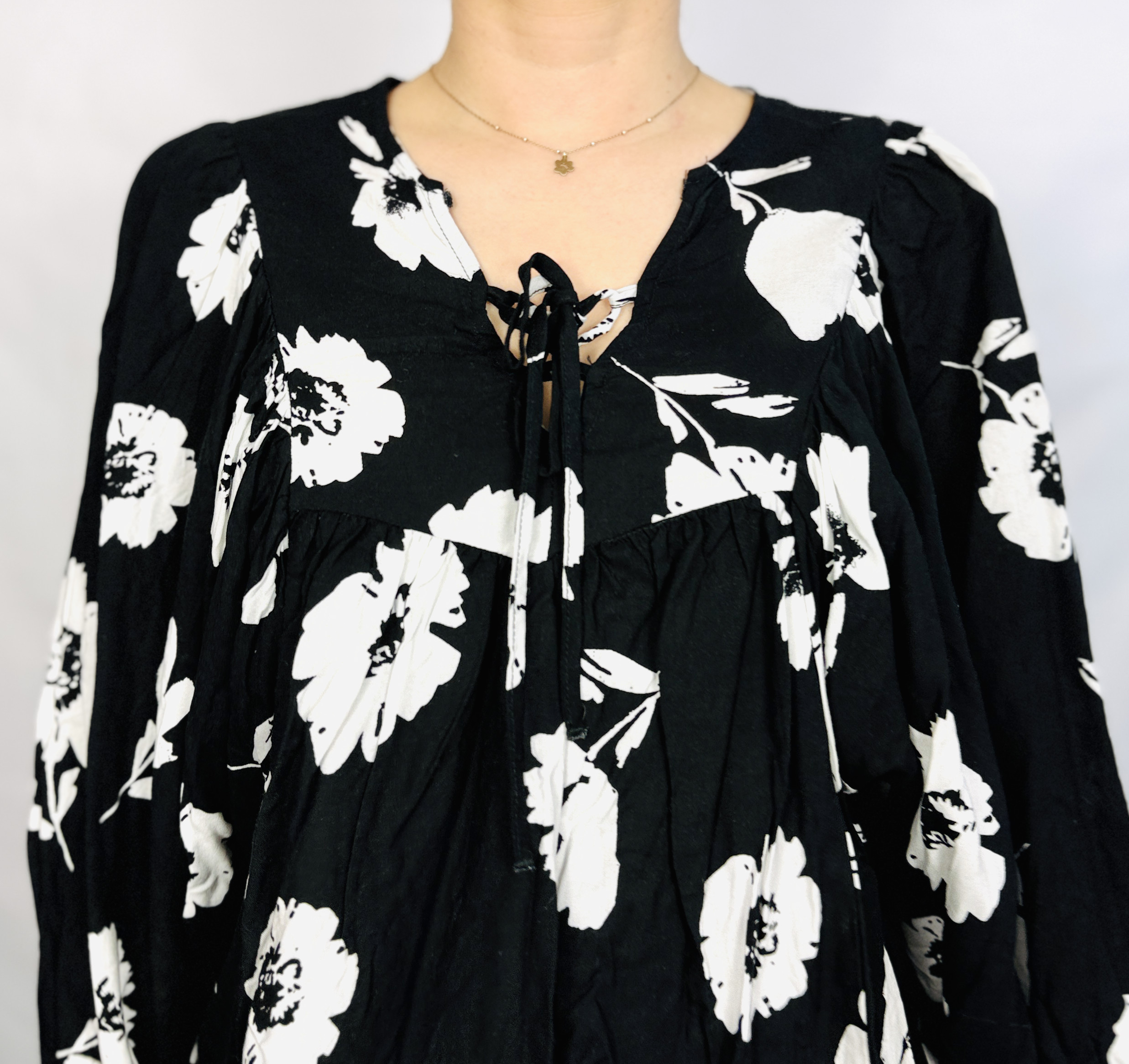 Czarna bluzka w duże białe kwiaty z wiązaniem S 36