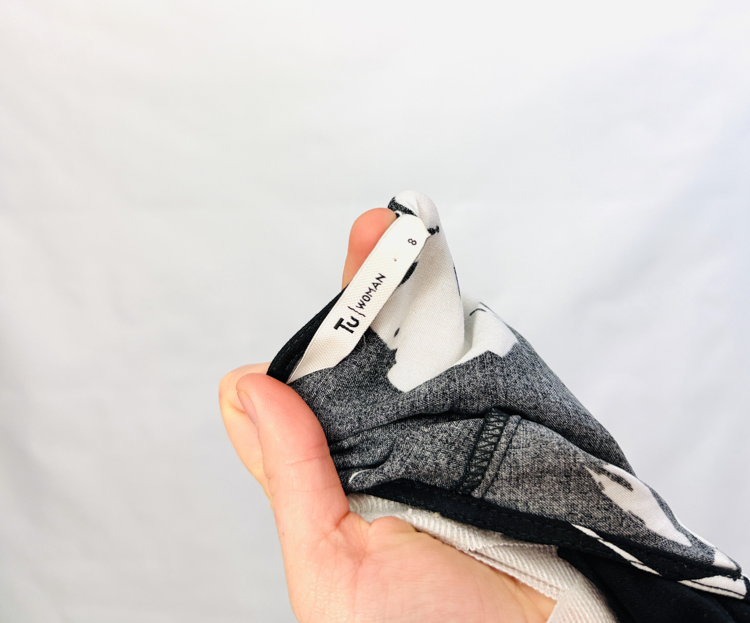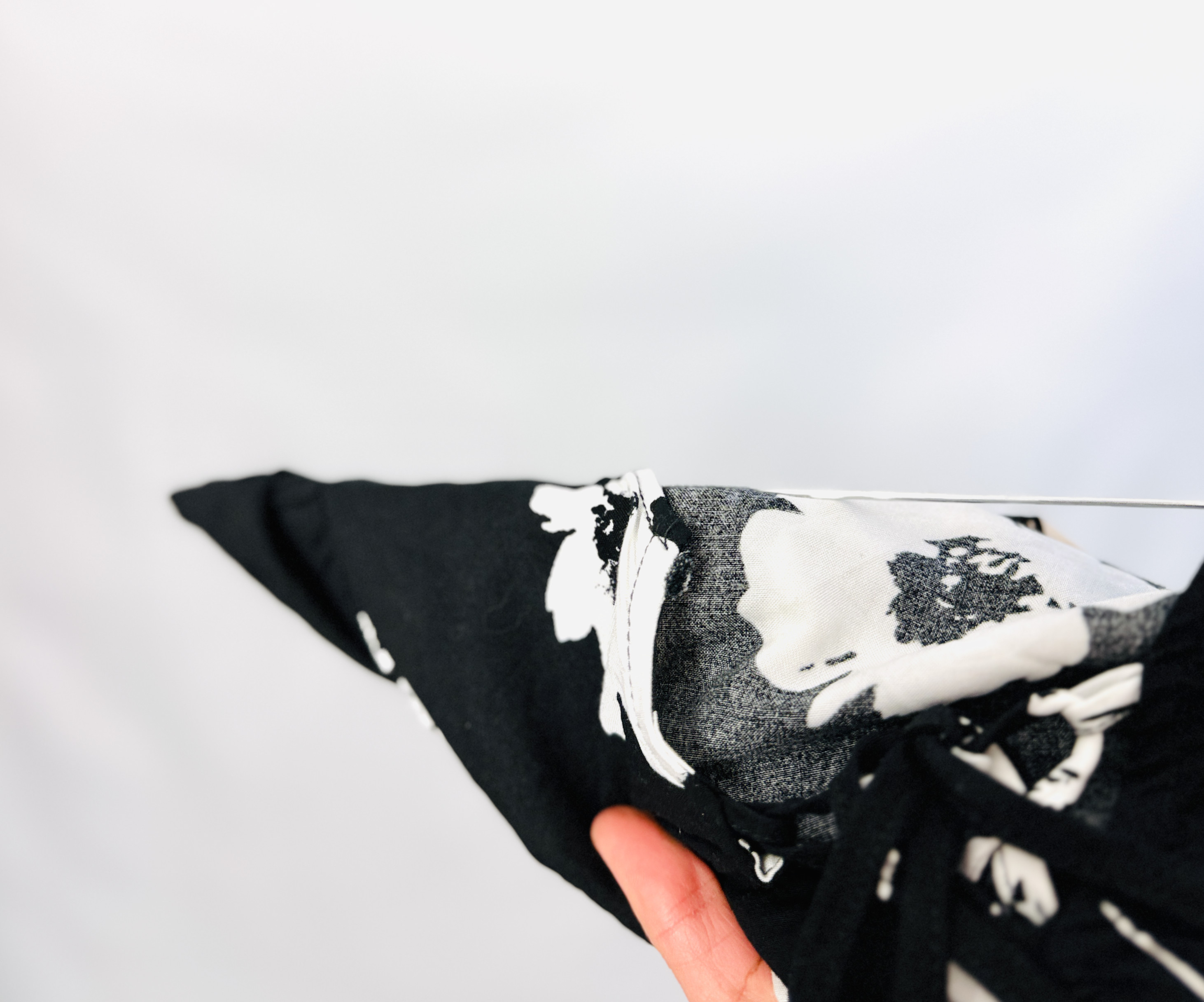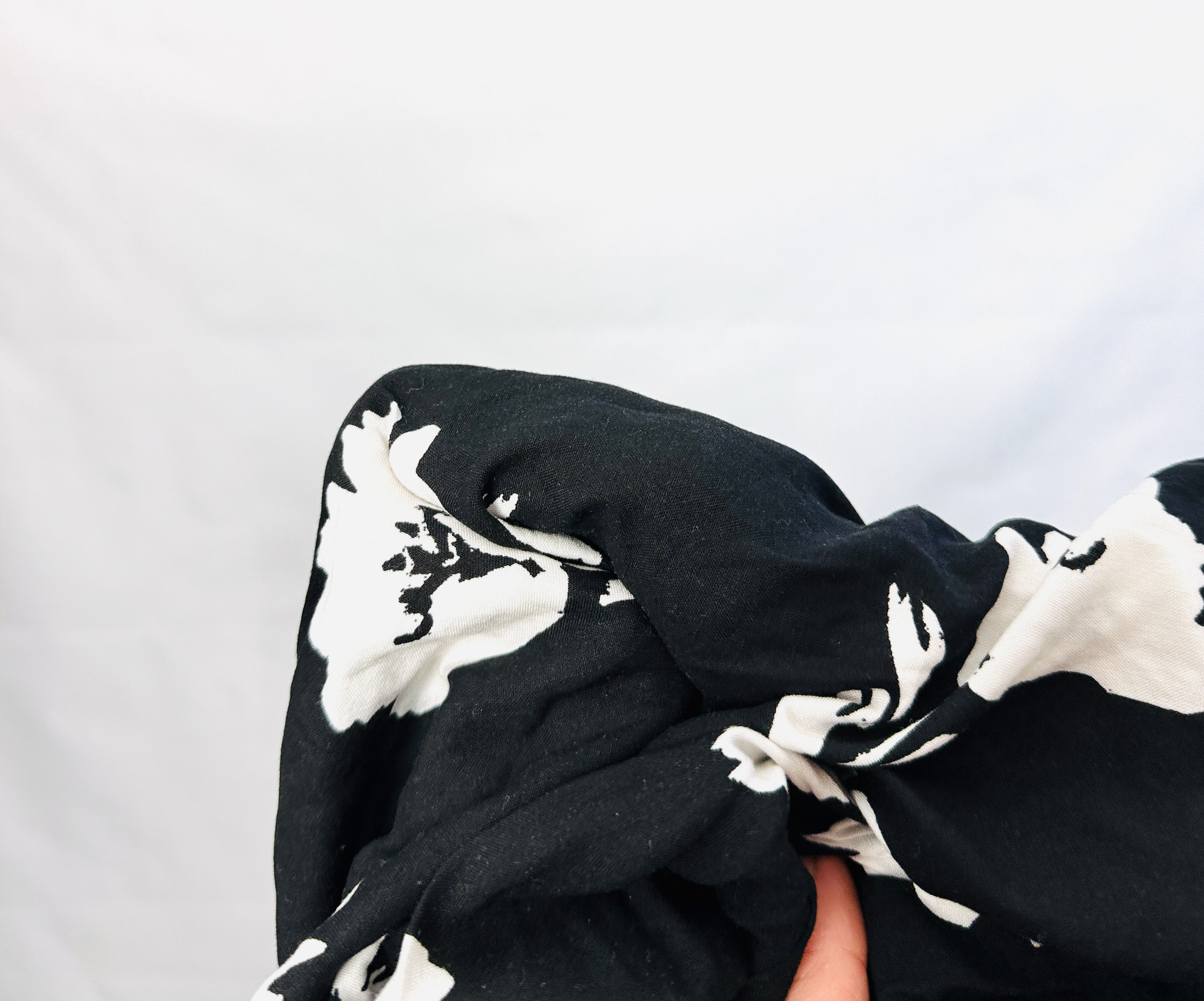 Tkanina prezentuje się jako miękko układająca i lekko lejąca, o gładkiej powierzchni, która podkreśla kontrast między czernią a bielą motywów. Duże, namalowane w prosty sposób kwiaty działają dekoracyjnie i dodają lekkości formie, jednocześnie kierując uwagę ku górze i środkowej części sylwetki. Dzięki temu wzór maskuje drobne niedoskonałości w okolicach talii i bioder, a rozkloszowany dół wprowadza subtelną grację i swobodę, nie opinając nadmiernie sylwetki.