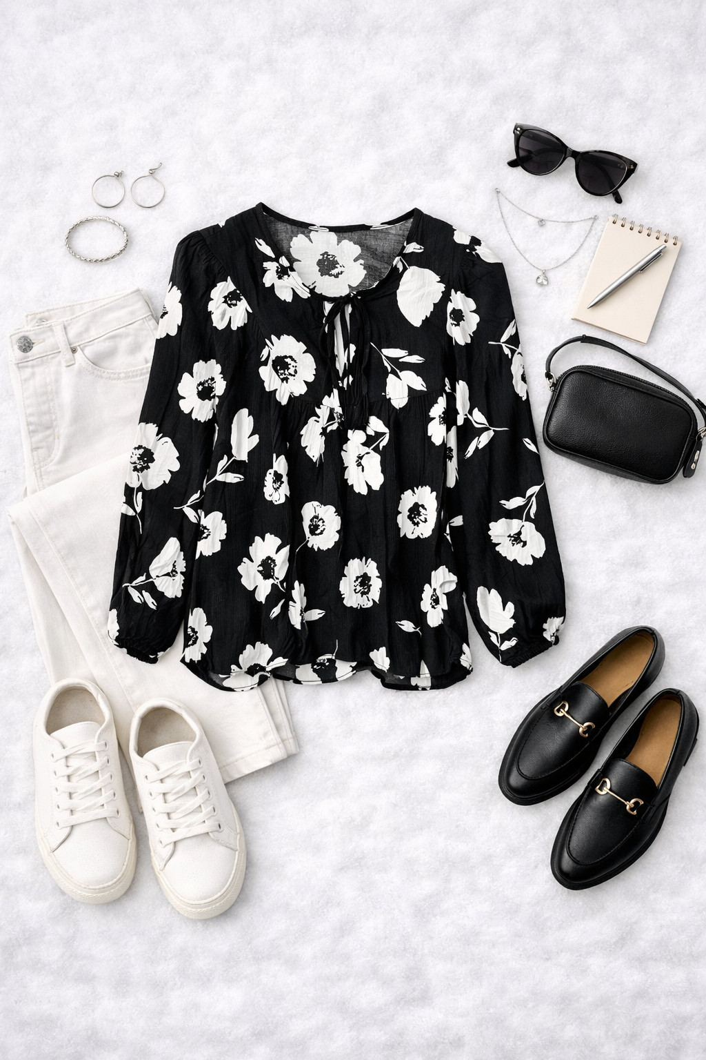 Ta bluzka to subtelne połączenie romantyzmu i swobodnej elegancji — kontrastujące, duże białe kwiaty na głębokim czarnym tle nadają jej wyrazistego, a zarazem kobiecego charakteru. Delikatne marszczenia nad linią biustu i dekoracyjne wiązanie przy szyi wprowadzają lekko boho nutę, dzięki której całość zyskuje artystyczny i miękki wyraz. To propozycja dla osób, które szukają ubrania o zmysłowym, a jednocześnie naturalnym uroku, idealnego zarówno do codziennych, jak i bardziej wyjściowych stylizacji.