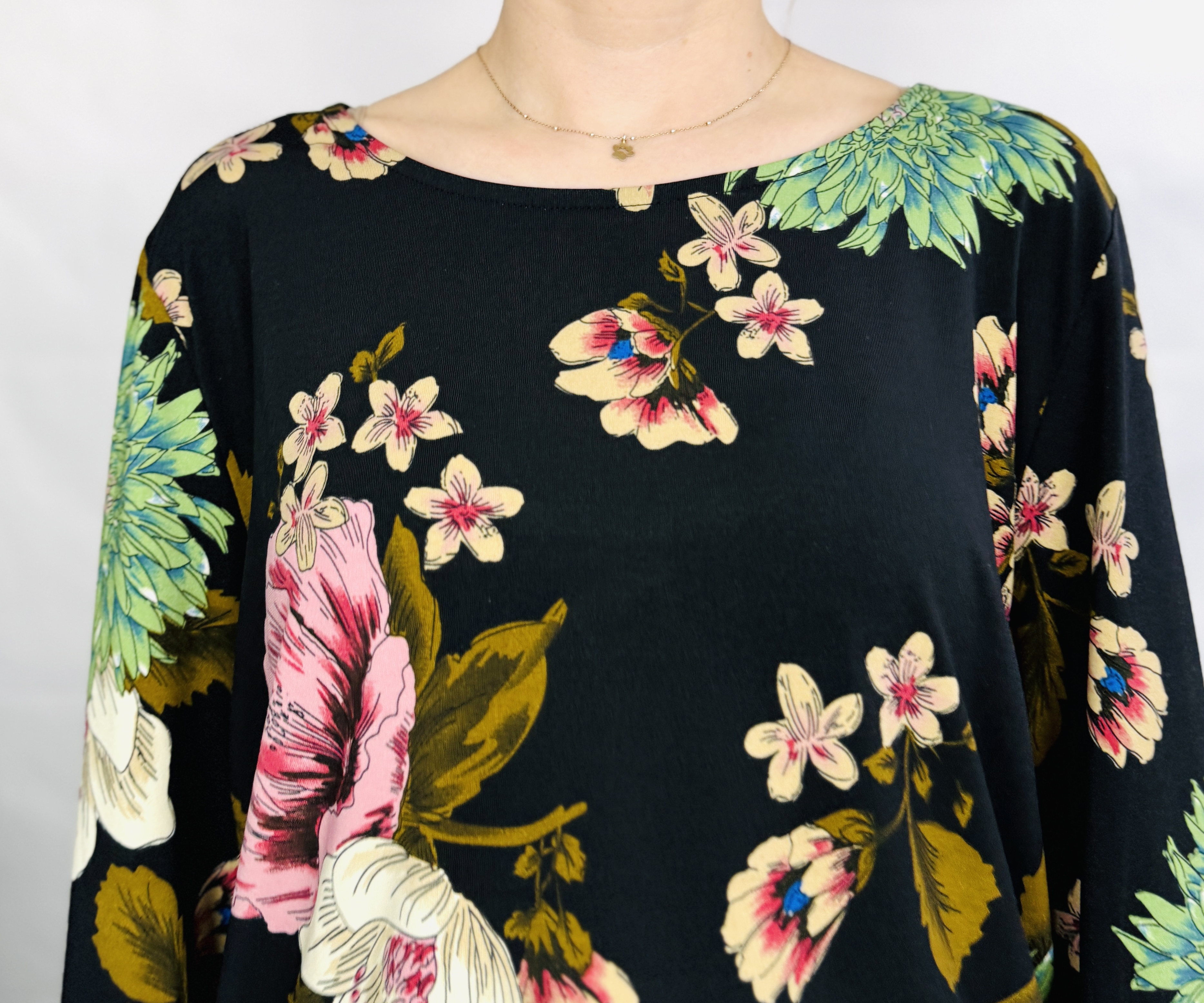 Dekolt bluzki jest szeroko zaokrąglony, łagodnie eksponuje linię szyi, tworząc klasyczną, ponadczasową ramę dla wzoru. Rękawy są długie i lekkie, z delikatnym marszczeniem przy nadgarstkach, które tworzy subtelne mankiety i dodaje formie romantycznej nuty. Fason ma luźniejszą, prostą linię tułowia, długość sięga linii bioder, a dół układa się swobodnie, co daje komfort noszenia bez nadmiernego opinania sylwetki. Kwiatowy motyw obejmuje dużą, dekoracyjną kompozycję w odcieniach różu, kremu i zieleni z akcentami liści w tonacji oliwkowej, co nadaje bluzce głębi i harmonii kolorystycznej.