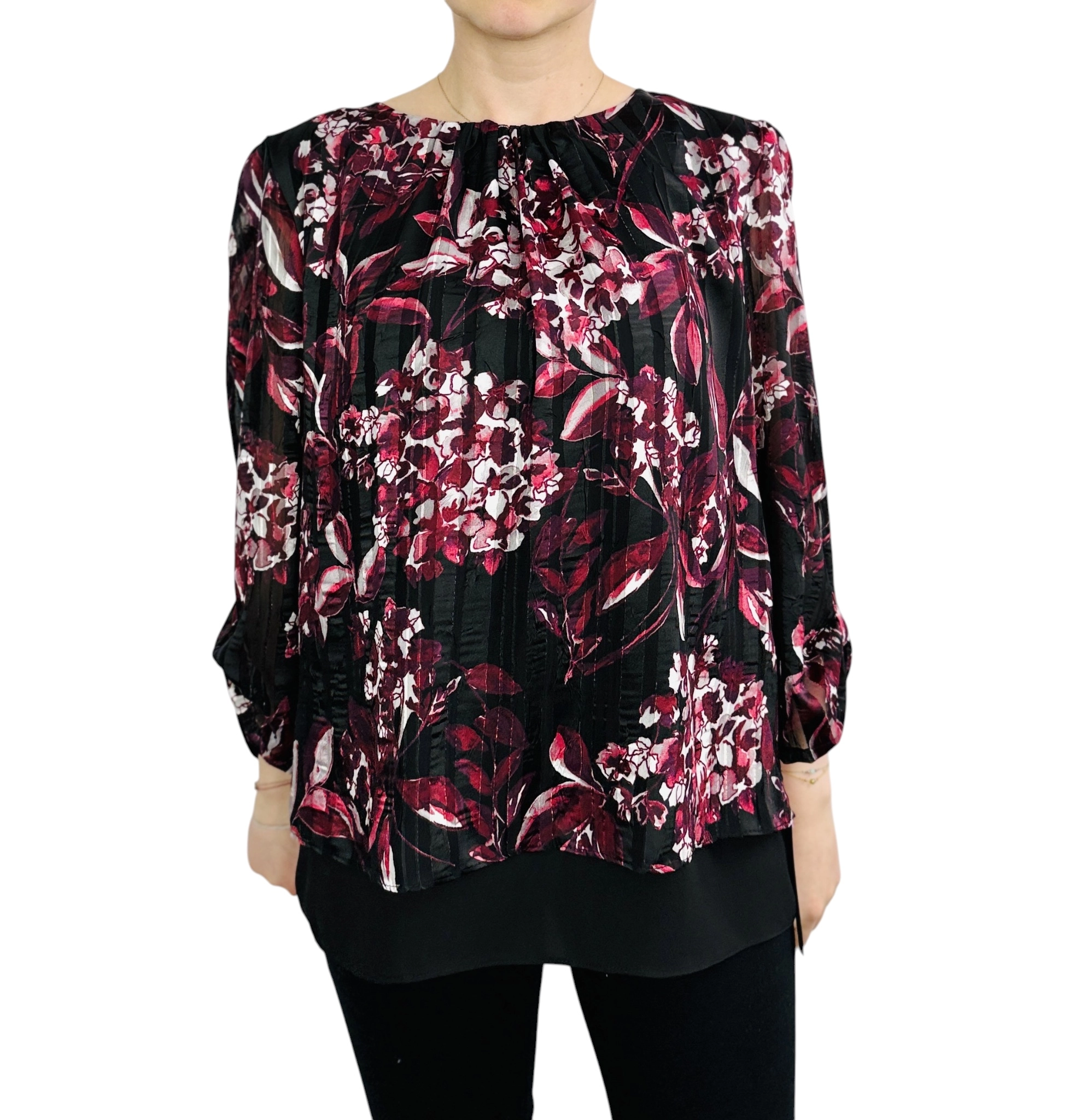 Fason bluzki jest luźniejszy, co zapewnia komfort i swobodę ruchów, a jednocześnie pozwala na efektowne układanie się materiału na sylwetce. Dekolt jest okrągły, subtelnie eksponując szyję i nadając całości harmonijny wygląd. Charakterystycznym elementem są delikatne marszczenia przy dekolcie oraz na rękawach o długości do nadgarstków, które dodają bluzce lekkości i finezji, tworząc efekt subtelnej objętości i romantycznego akcentu. Materiał ma lekko połyskującą, fakturowaną powierzchnię, która pięknie odbija światło, podkreślając kwiatowy wzór i nadając bluzce wyjątkowego blasku.