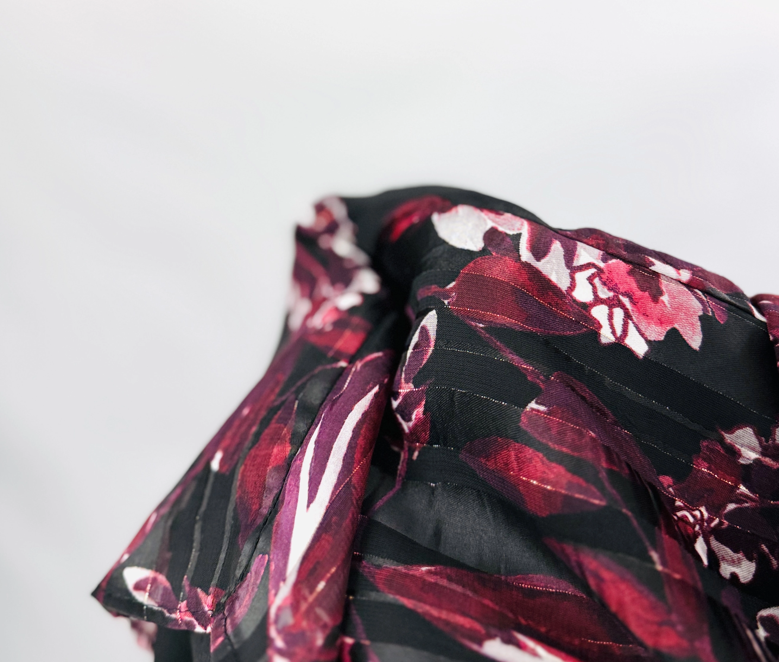 Ta czarna bluzka w kwiaty to połączenie romantyzmu i nowoczesnej elegancji, które zachwyca swoją lekkością i kobiecym wdziękiem. Intensywne, bordowe i różowe kwiatowe motywy na głębokim, czarnym tle tworzą efektowny kontrast, który przyciąga wzrok i nadaje stylizacji wyjątkowego charakteru. To ubranie, które emanuje subtelną zmysłowością i delikatnością, idealne dla kobiet ceniących sobie modę z klasą i wyrafinowany styl.