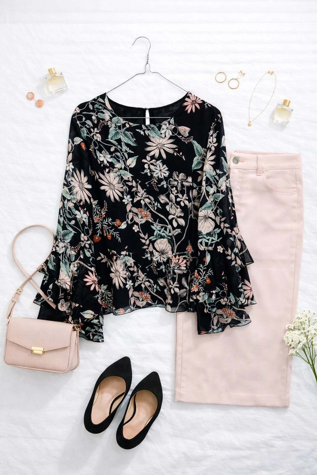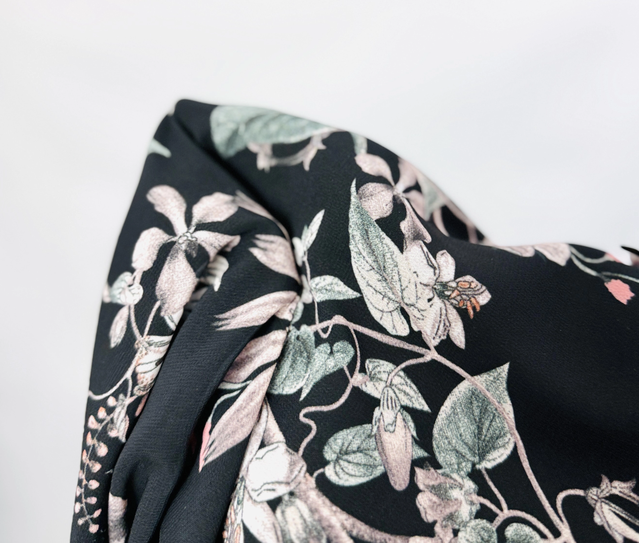 Ta czarna bluzka to prawdziwa oda do kobiecości, łącząca w sobie elegancję mrocznej bazy z delikatnością eterycznego, kwiatowego wzoru. Na głębokim, czarnym tlej rozpościera się malowniczy ogród pełen subtelnych kwiatów w odcieniach pudrowego różu, beżu i stonowanej zieleni, które wyglądają niczym naniesione pędzlem artysty. To ubranie emanuje romantycznym duchem i wyrafinowaniem, stanowiąc idealny wybór dla kobiet, które pragną poczuć się wyjątkowo i dodać swojej stylizacji odrobinę poetyckiego blasku w nowoczesnym wydaniu.