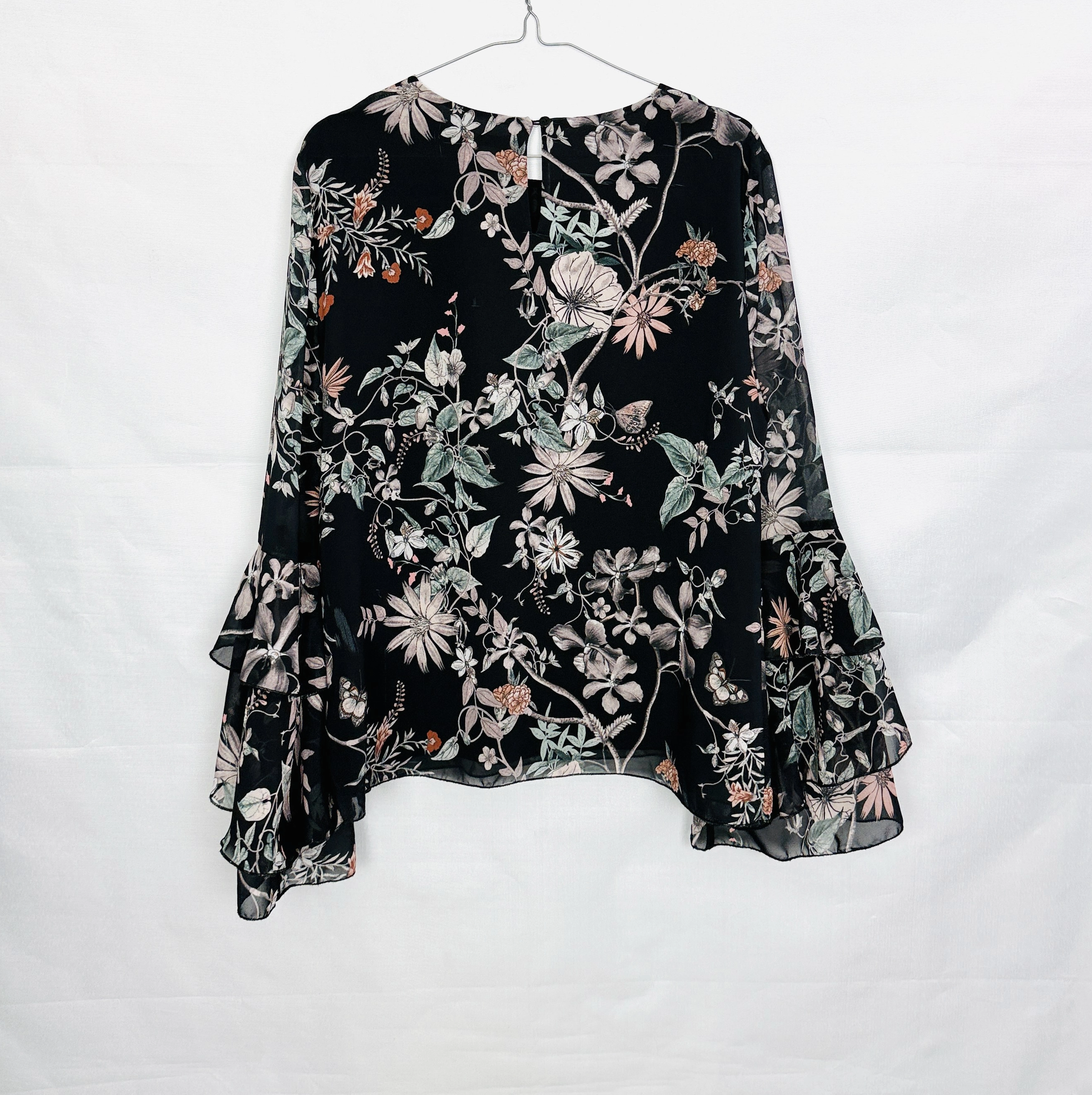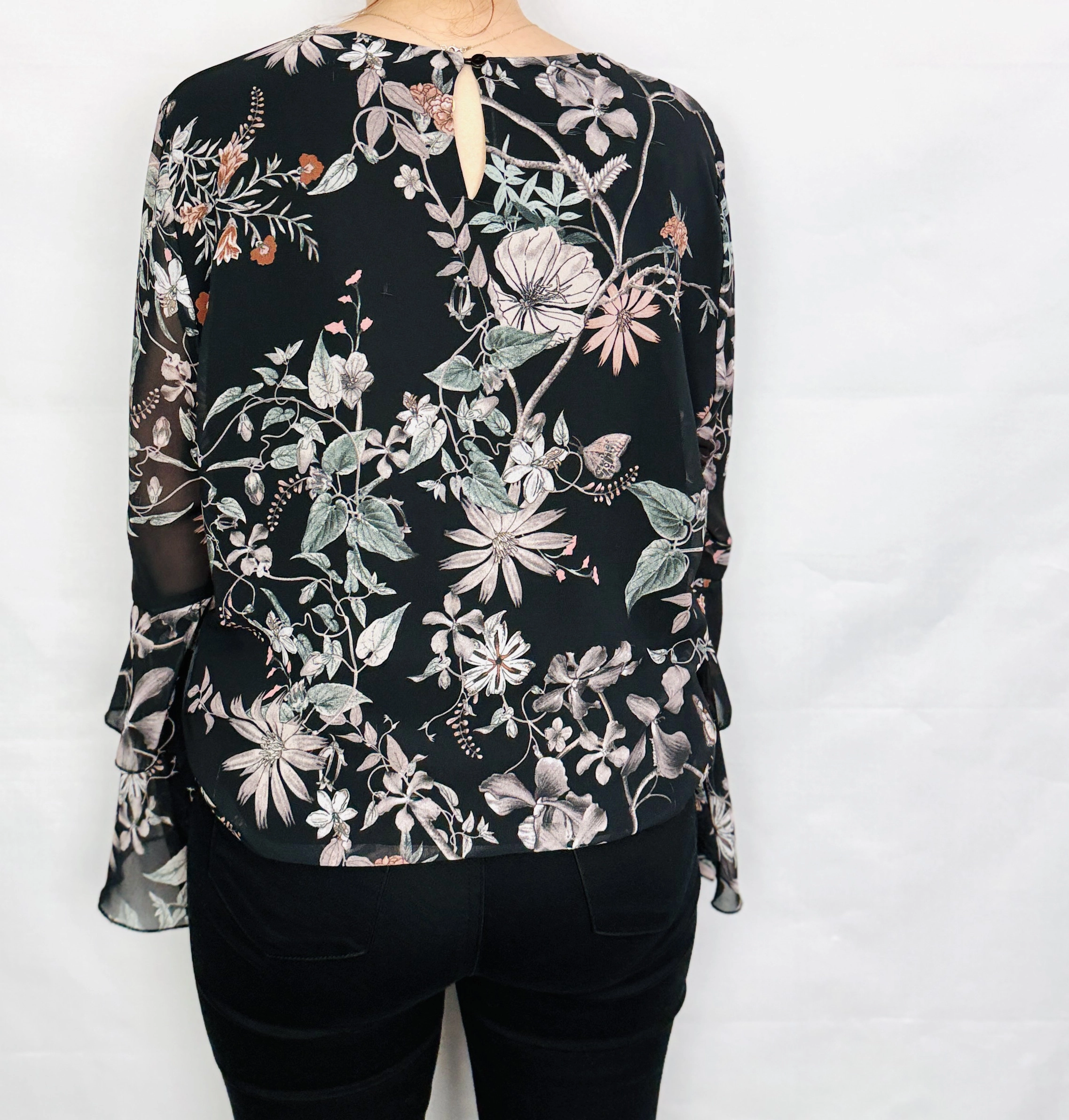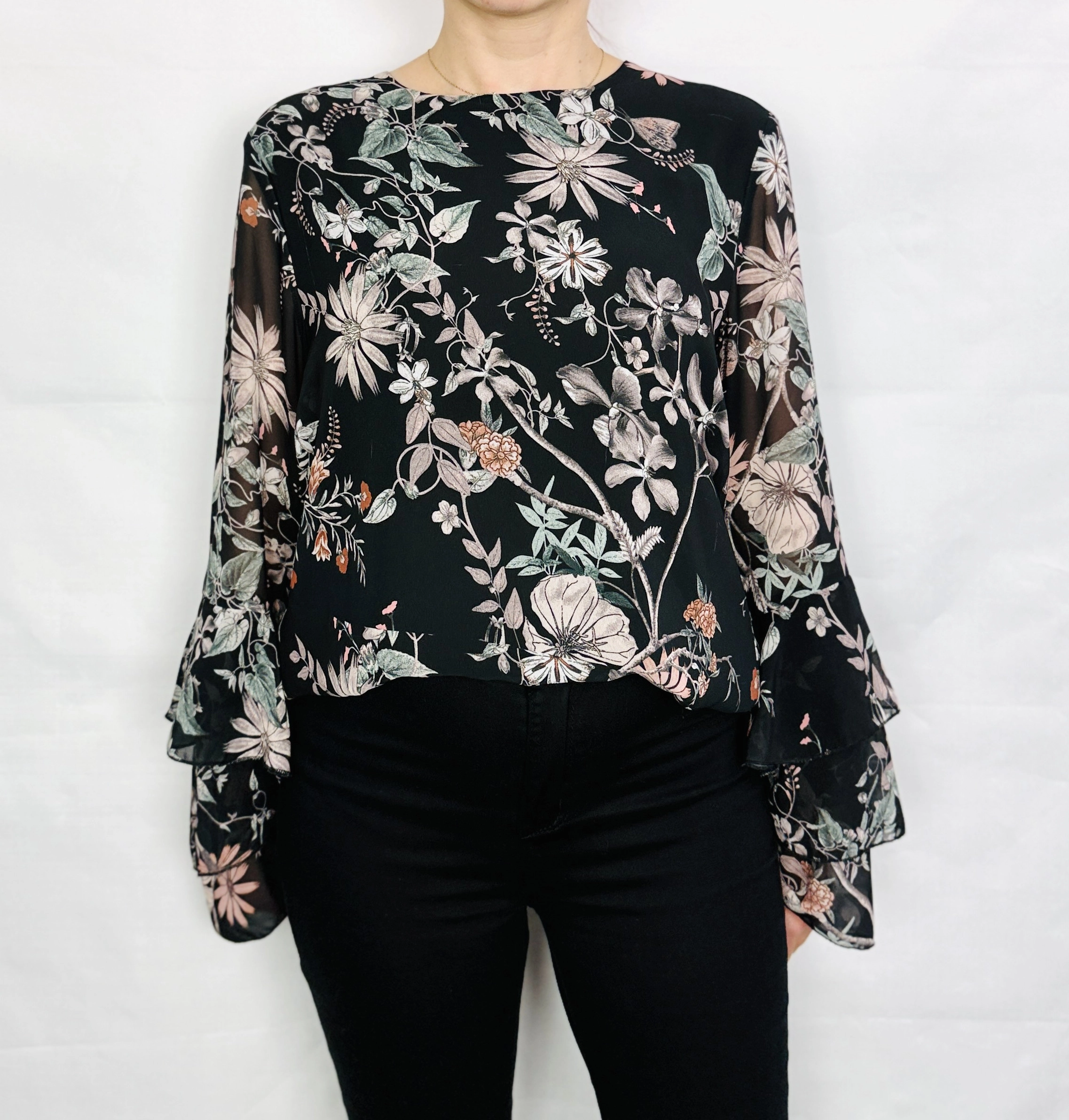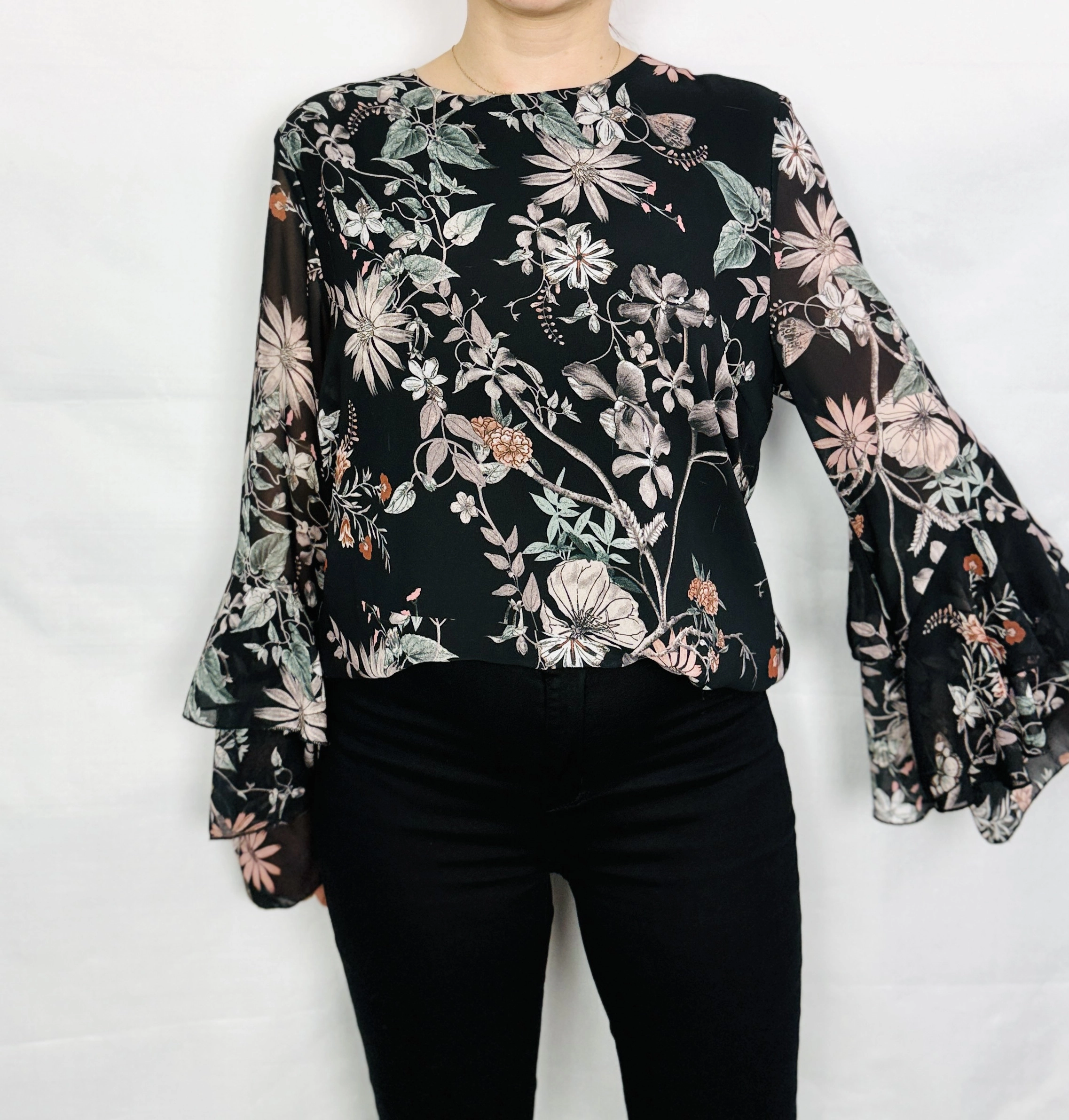 Czarna bluzka w romantyczne kwiaty z dzwonowatymi rękawami L 40