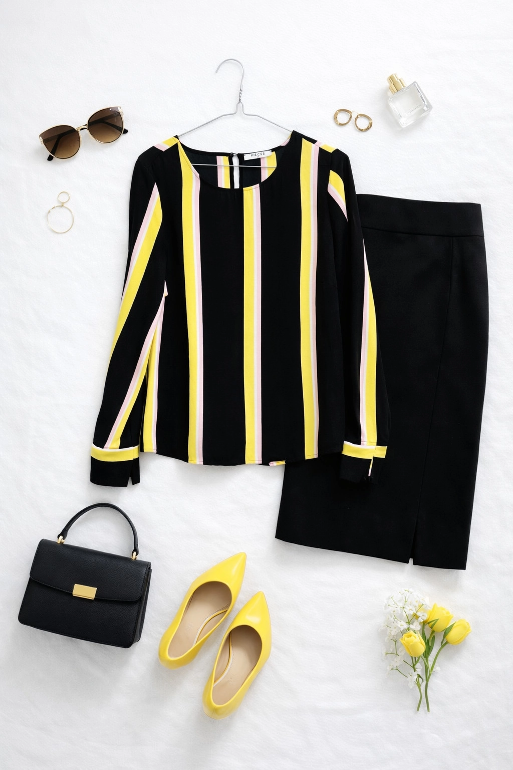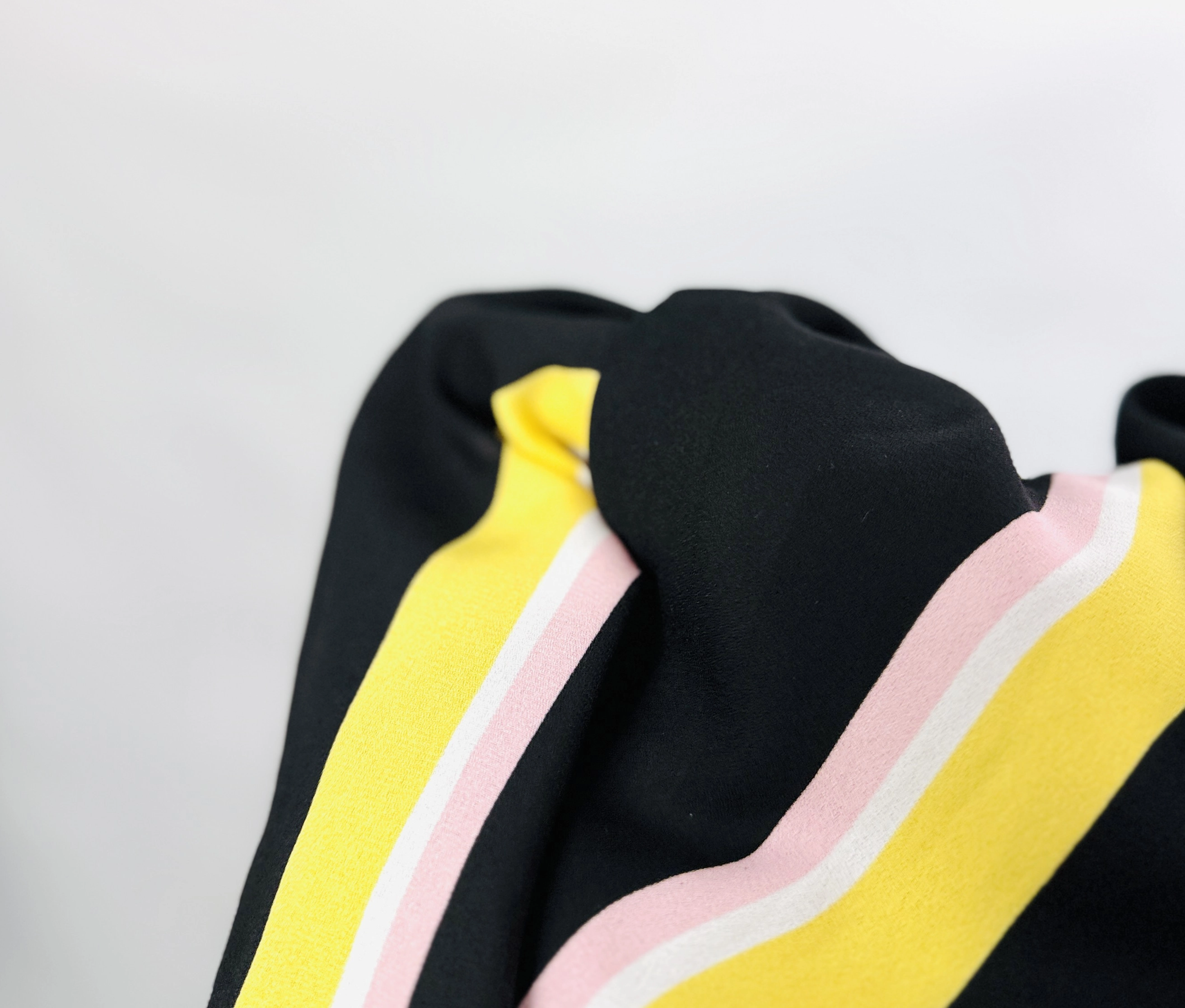 Ta czarna bluzka to wyraziste połączenie klasycznej bazy z nowoczesną dynamiką kolorów, które natychmiast przyciąga uwagę i dodaje stylizacji wyjątkowej energii. Na głębokim, czarnym tle rozmieszczono szerokie, pionowe pasy w nasyconym odcieniu żółtego, które subtelnie przeplatają się z cieńszymi liniami w kolorze pudrowego różu i czystej bieli. Taki układ wzoru optycznie wysmukla sylwetkę, nadając jej lekkości i nowoczesnego sznytu, a jednocześnie pozwala na odważne eksperymentowanie z modą, łącząc elegancję z odrobiną sportowego luzu.