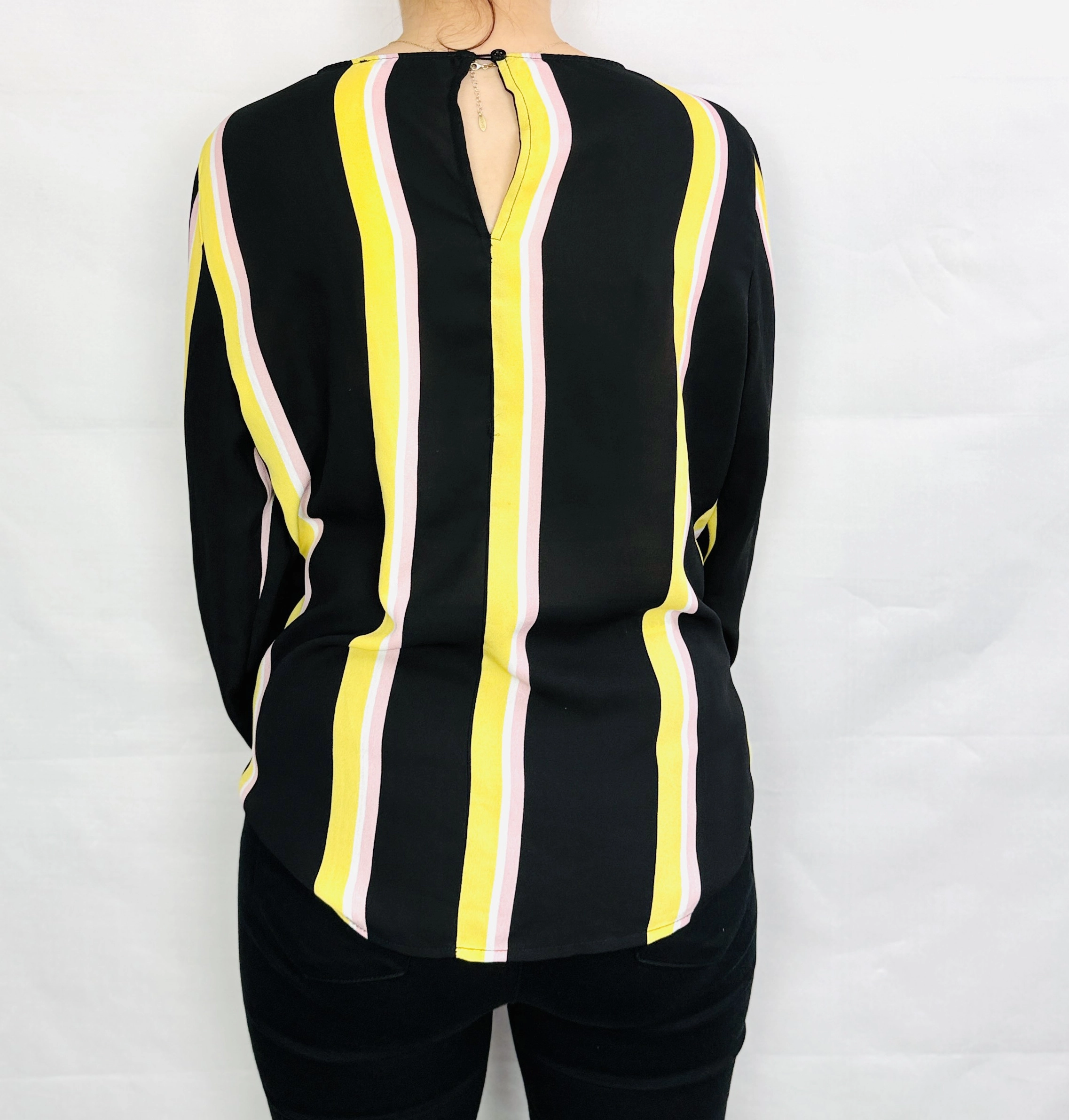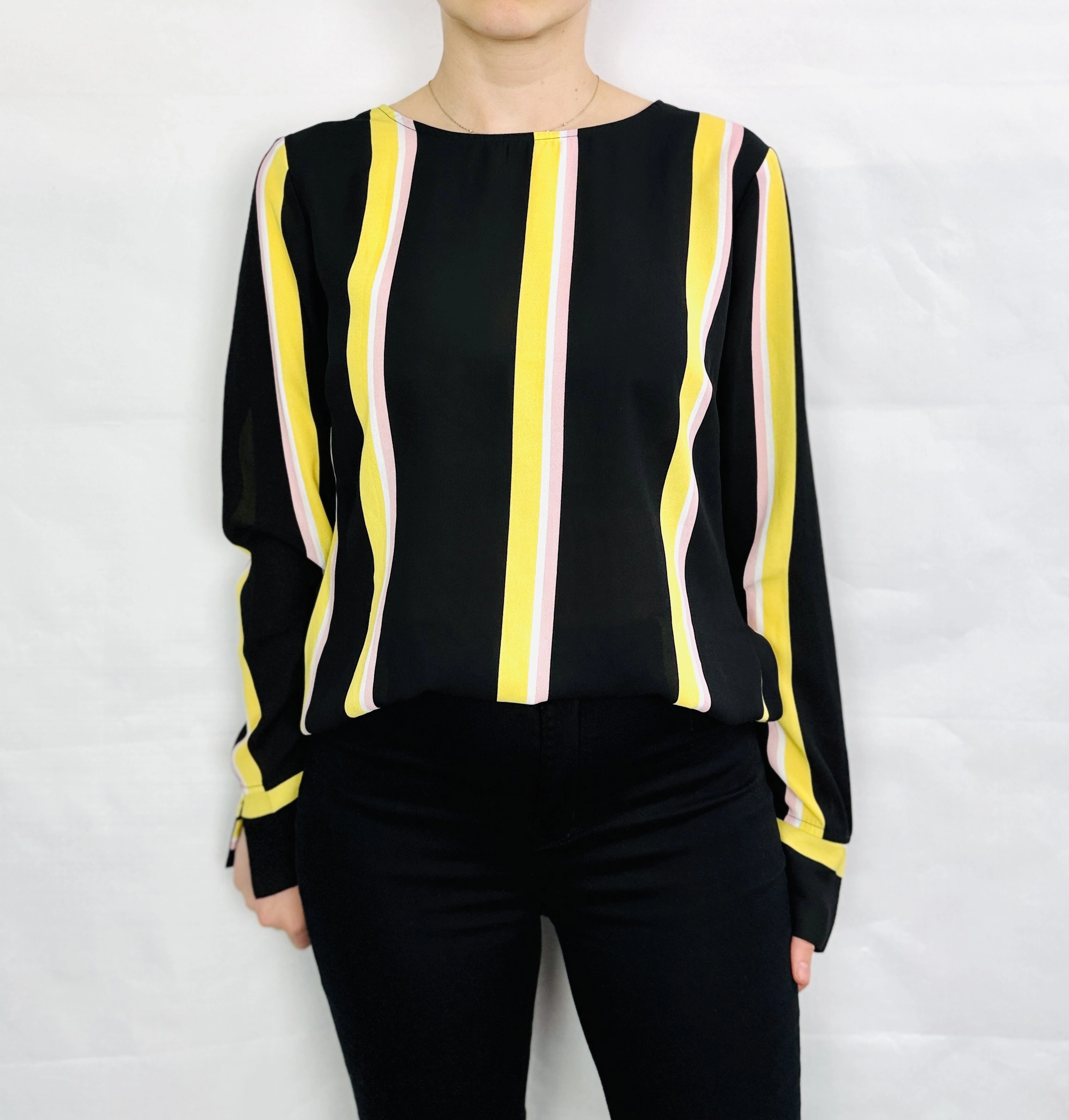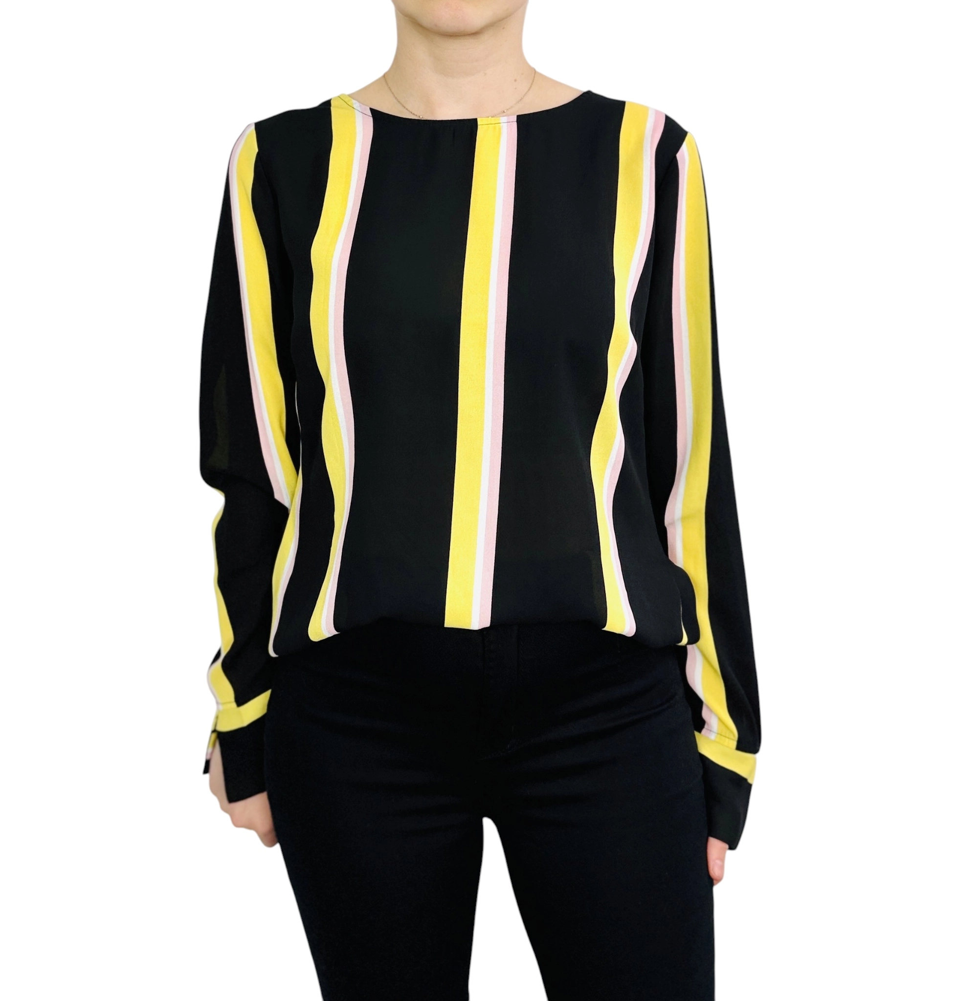 Czarna bluzka w żółte i różowe paski M 38