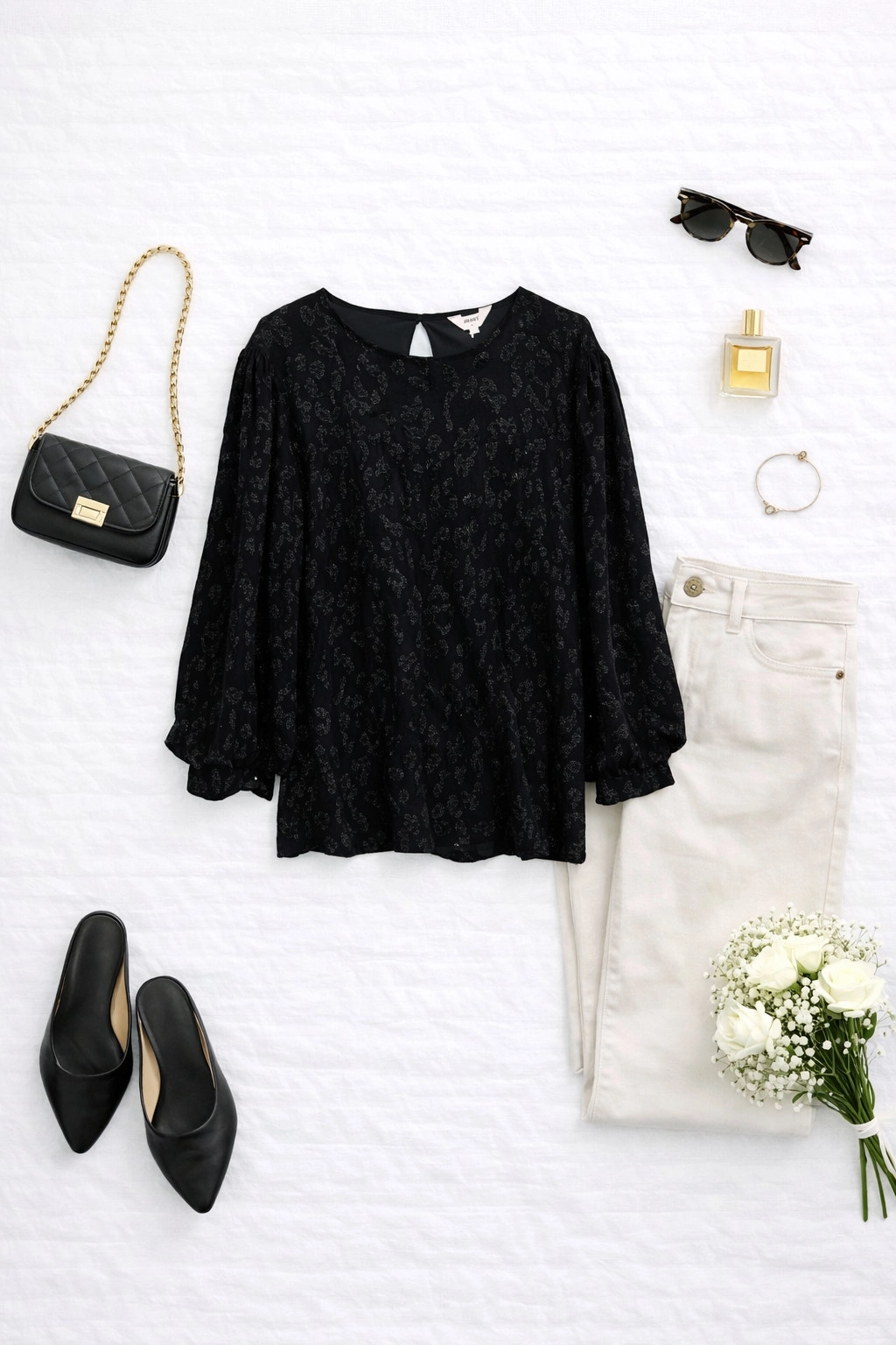 Fason bluzki jest lekko luźny, co zapewnia komfort i swobodę noszenia, a jednocześnie nie traci na elegancji. Dekolt jest okrągły, subtelnie eksponując szyję i nadając całości harmonijny wygląd. Rękawy o długości do nadgarstków mają delikatne bufki, które dodają sylwetce lekkości i finezji, tworząc efektowną grę objętości. Materiał ma miękko układającą się, lekko połyskującą fakturę, która pięknie odbija światło, podkreślając brokatowy wzór i nadając bluzce wyjątkowego blasku.