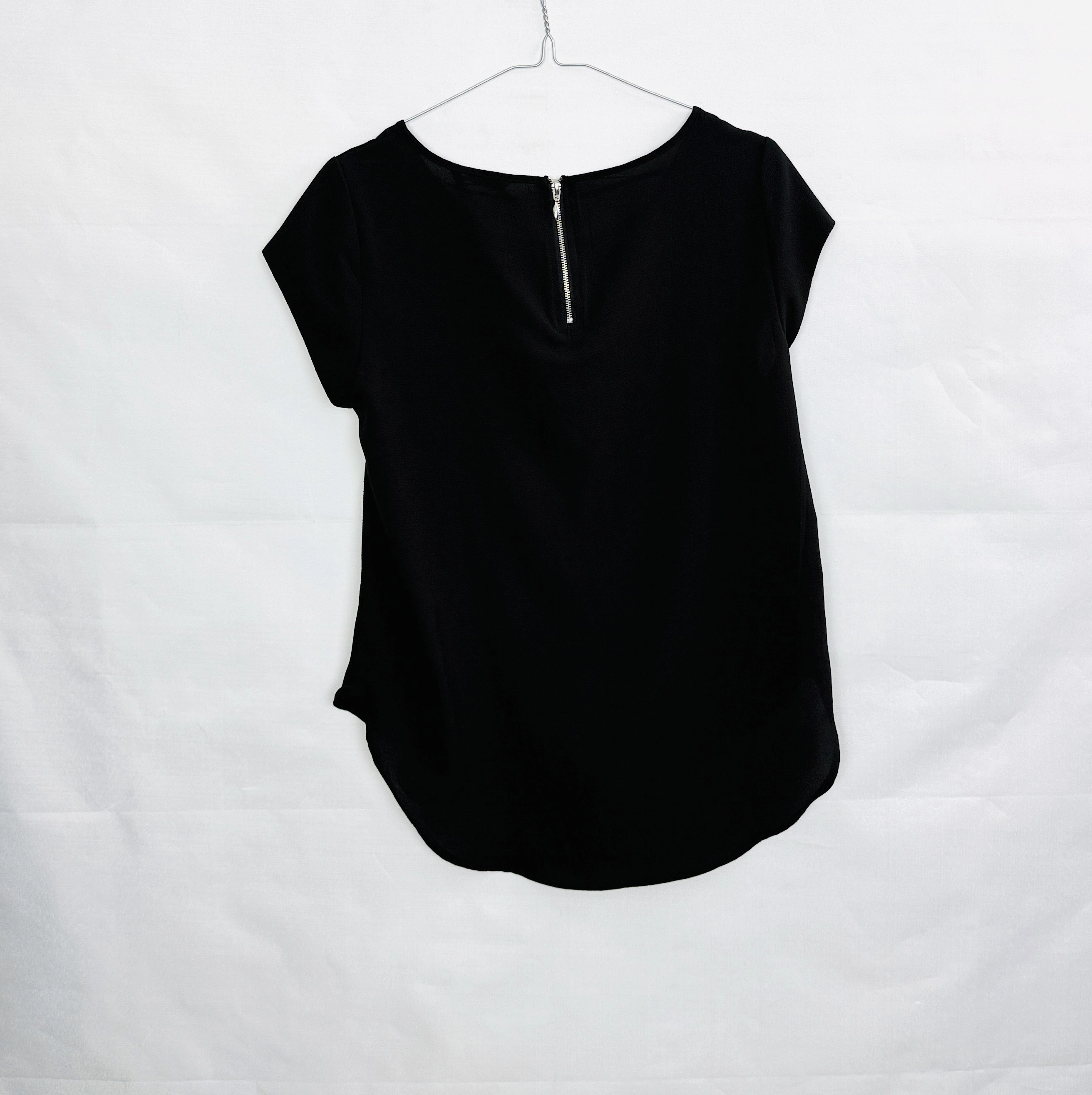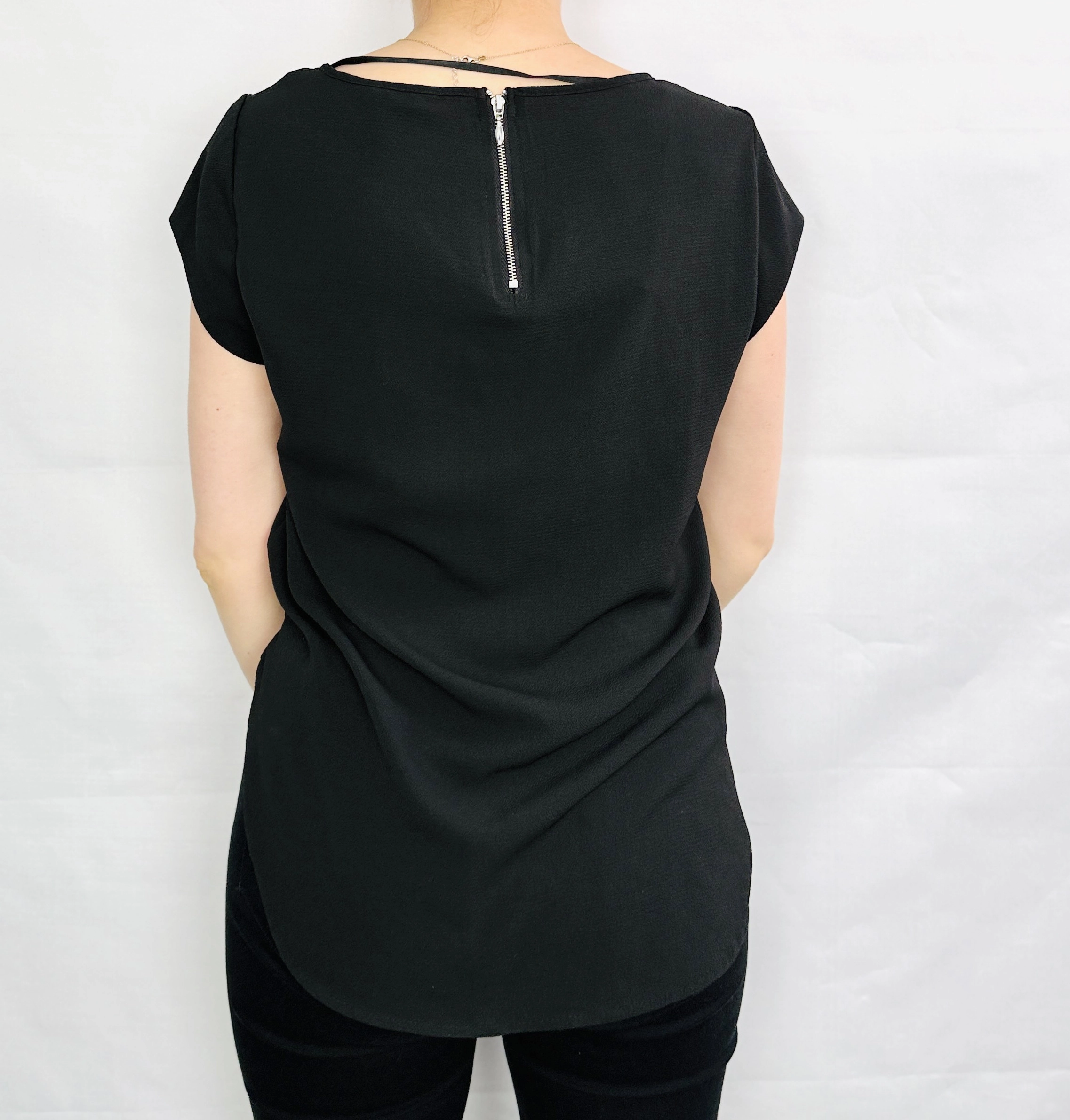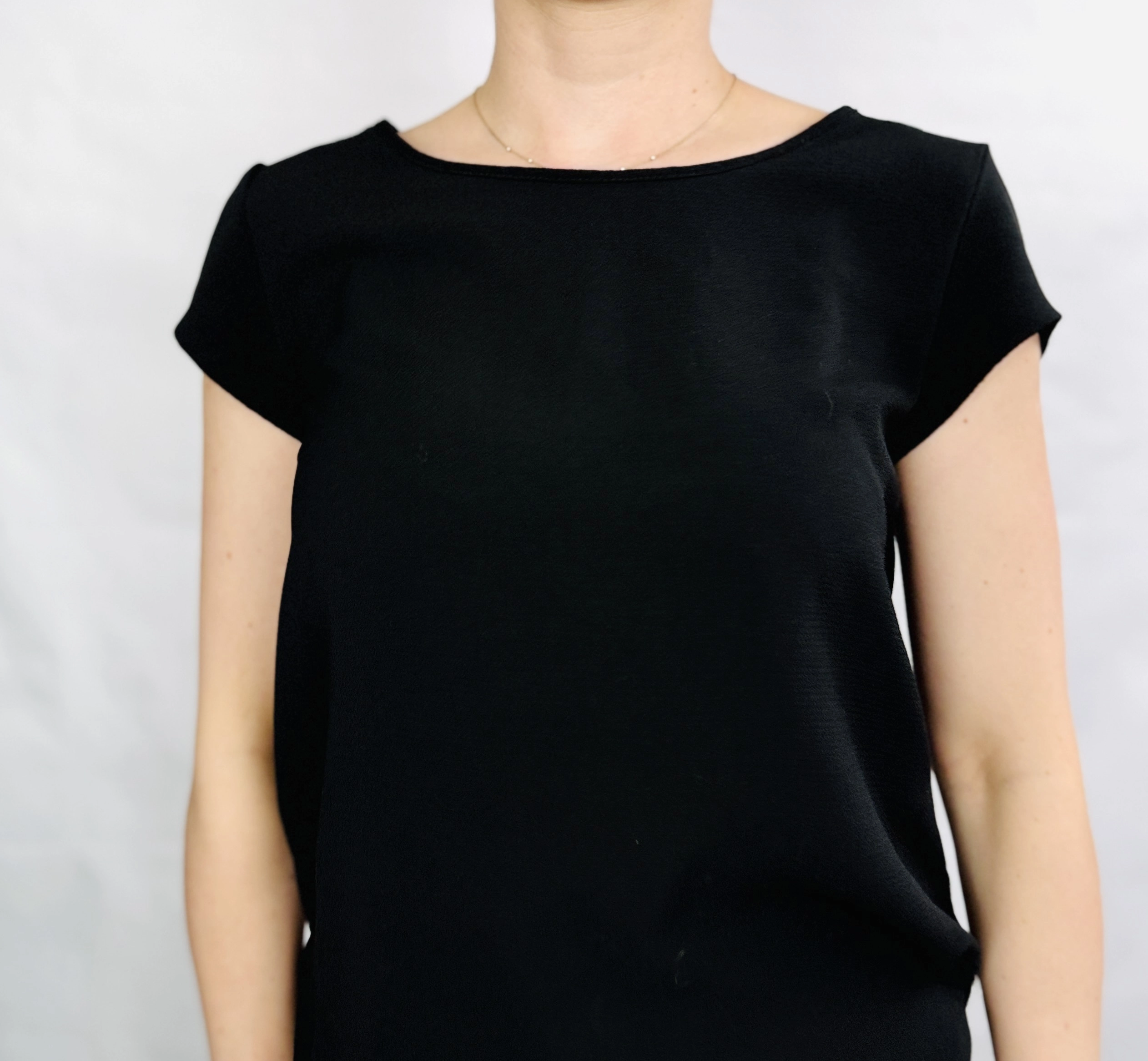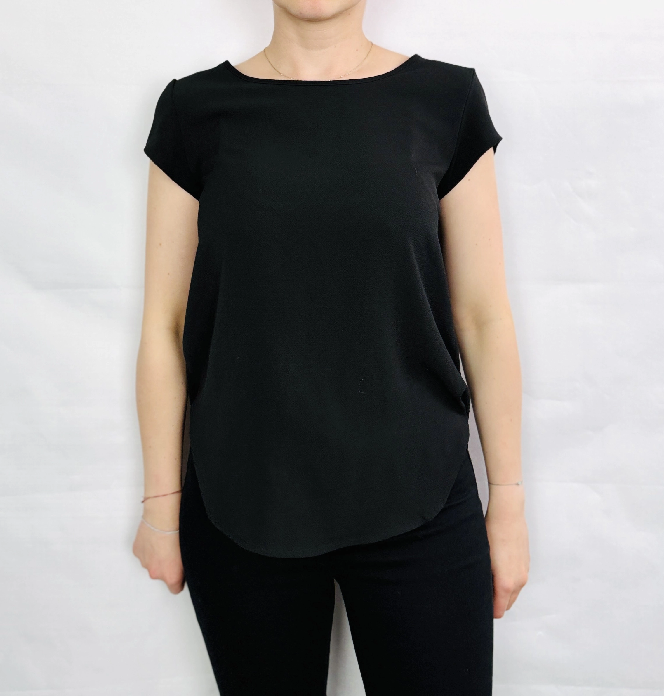 Ta czarna bluzka to ponadczasowa klasyka, która łączy w sobie prostotę z elegancją, tworząc uniwersalny element garderoby dla każdej kobiety. Głęboka czerń tkaniny nadaje stylizacji wyrafinowanego charakteru, a jednocześnie pozwala na łatwe łączenie z różnorodnymi dodatkami i innymi ubraniami, co czyni ją niezwykle praktycznym wyborem na wiele okazji. To ubranie, które emanuje minimalistycznym stylem i komfortem, idealne dla kobiet ceniących sobie funkcjonalność i modny wygląd.