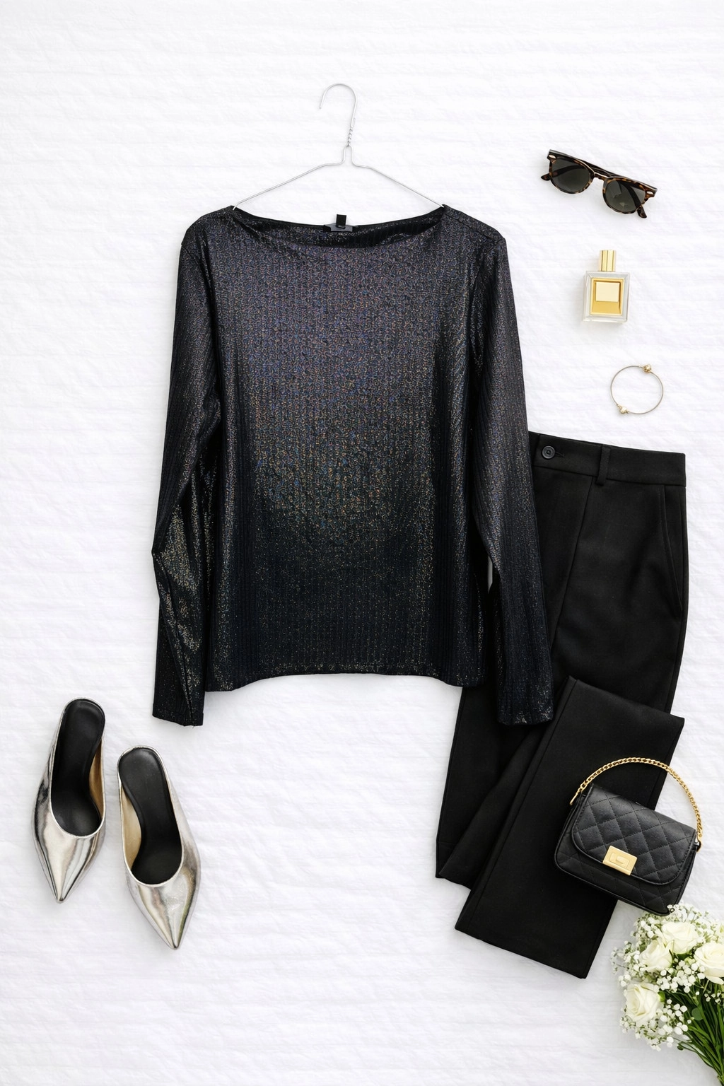 Długość bluzki sięga do bioder, co czyni ją niezwykle praktyczną i łatwą do stylizowania z różnorodnymi elementami garderoby. Doskonale komponuje się zarówno z klasycznymi czarnymi spodniami, jak i eleganckimi spódnicami czy jeansami, tworząc stylizacje na wiele okazji – od wieczornych wyjść, przez spotkania w pracy, aż po bardziej formalne wydarzenia. Czarna barwa z brokatowym połyskiem świetnie współgra z neutralnymi kolorami, takimi jak srebro, złoto, biel czy granat, co pozwala na tworzenie różnorodnych, efektownych zestawów.