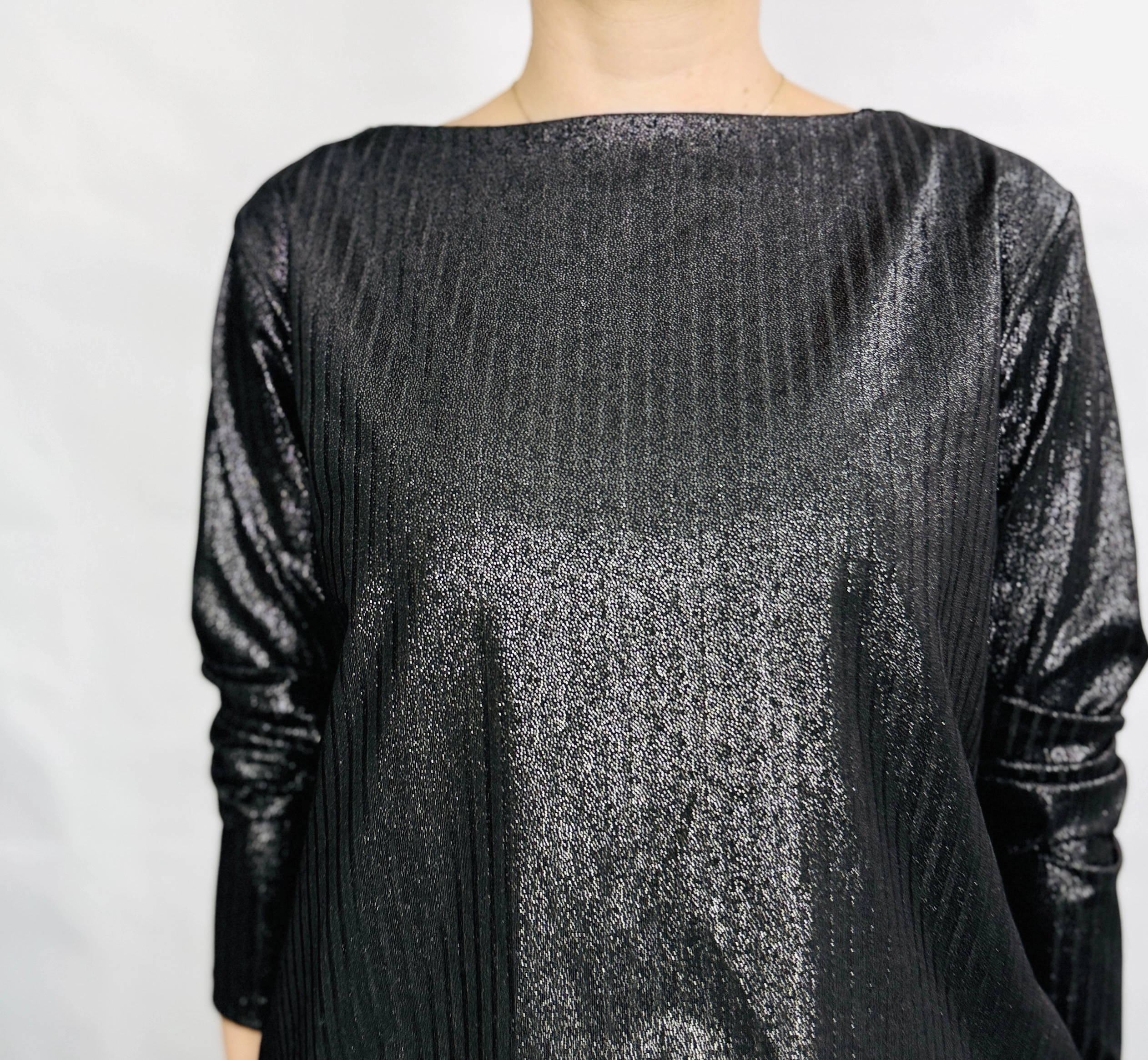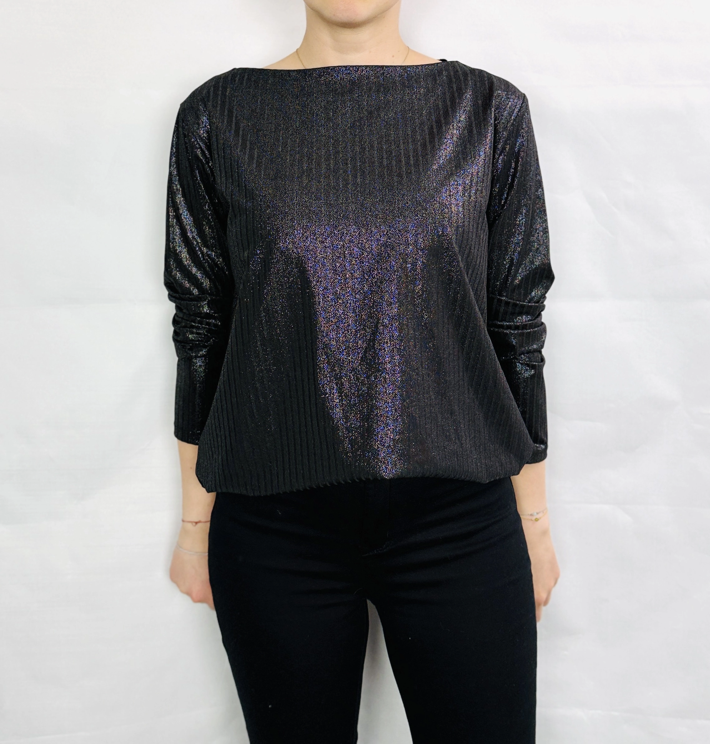 Fason bluzki jest lekko luźny, co zapewnia komfort i swobodę ruchów, a jednocześnie pozwala na efektowne układanie się materiału na sylwetce. Dekolt ma kształt łódki, który subtelnie eksponuje linię szyi i obojczyków, dodając całości delikatnej lekkości i kobiecego wdzięku. Rękawy o długości do nadgarstków są lekko marszczone, co wprowadza ciekawy detal i nadaje sylwetce finezji oraz modowego sznytu. Materiał ma miękko połyskującą, lekko fakturowaną powierzchnię, która pięknie odbija światło, podkreślając brokatowy efekt i nadając bluzce wyjątkowego blasku.