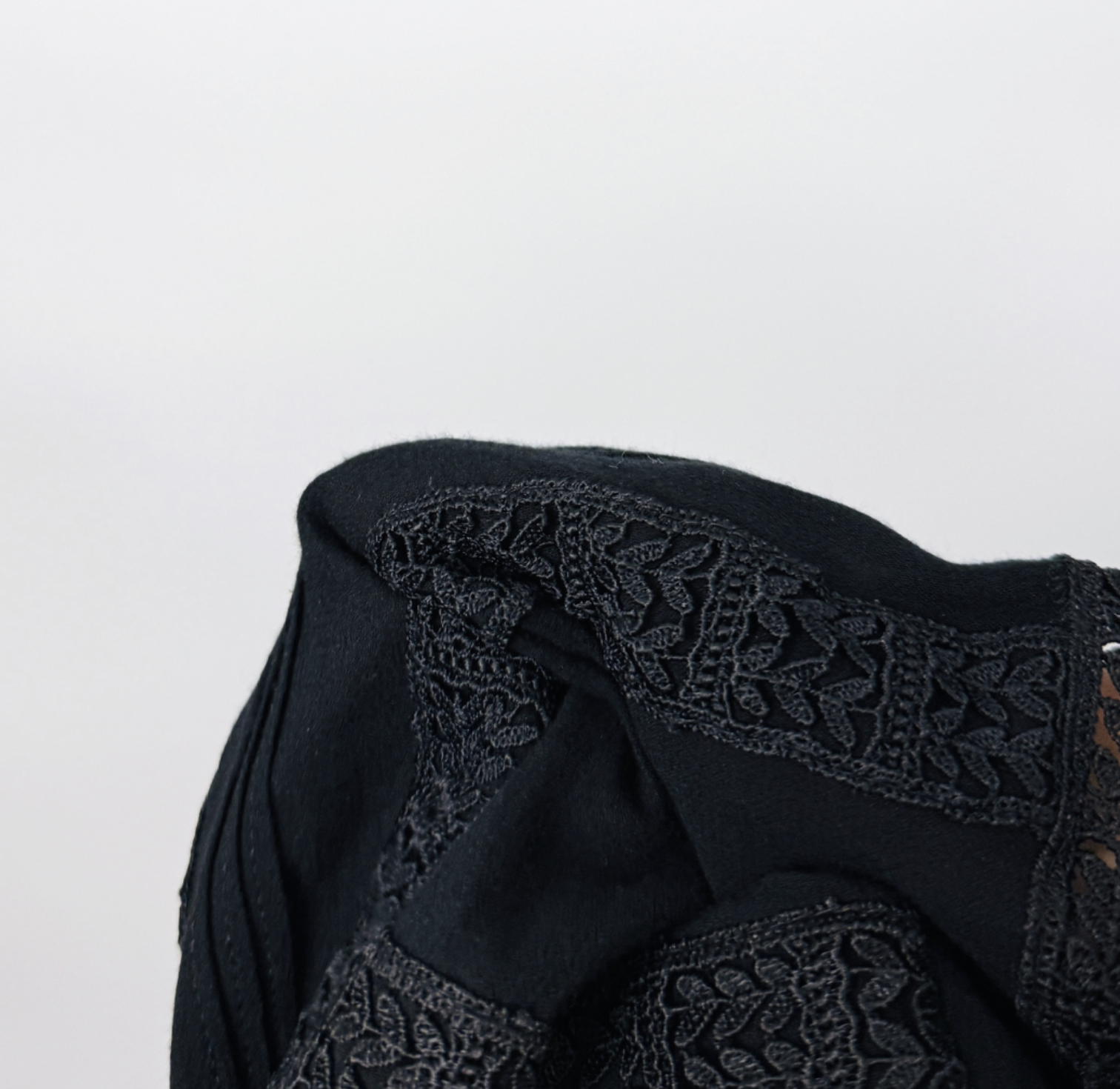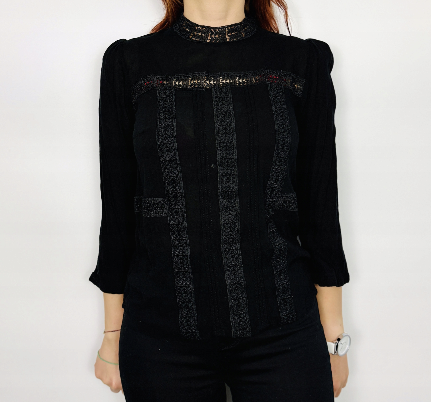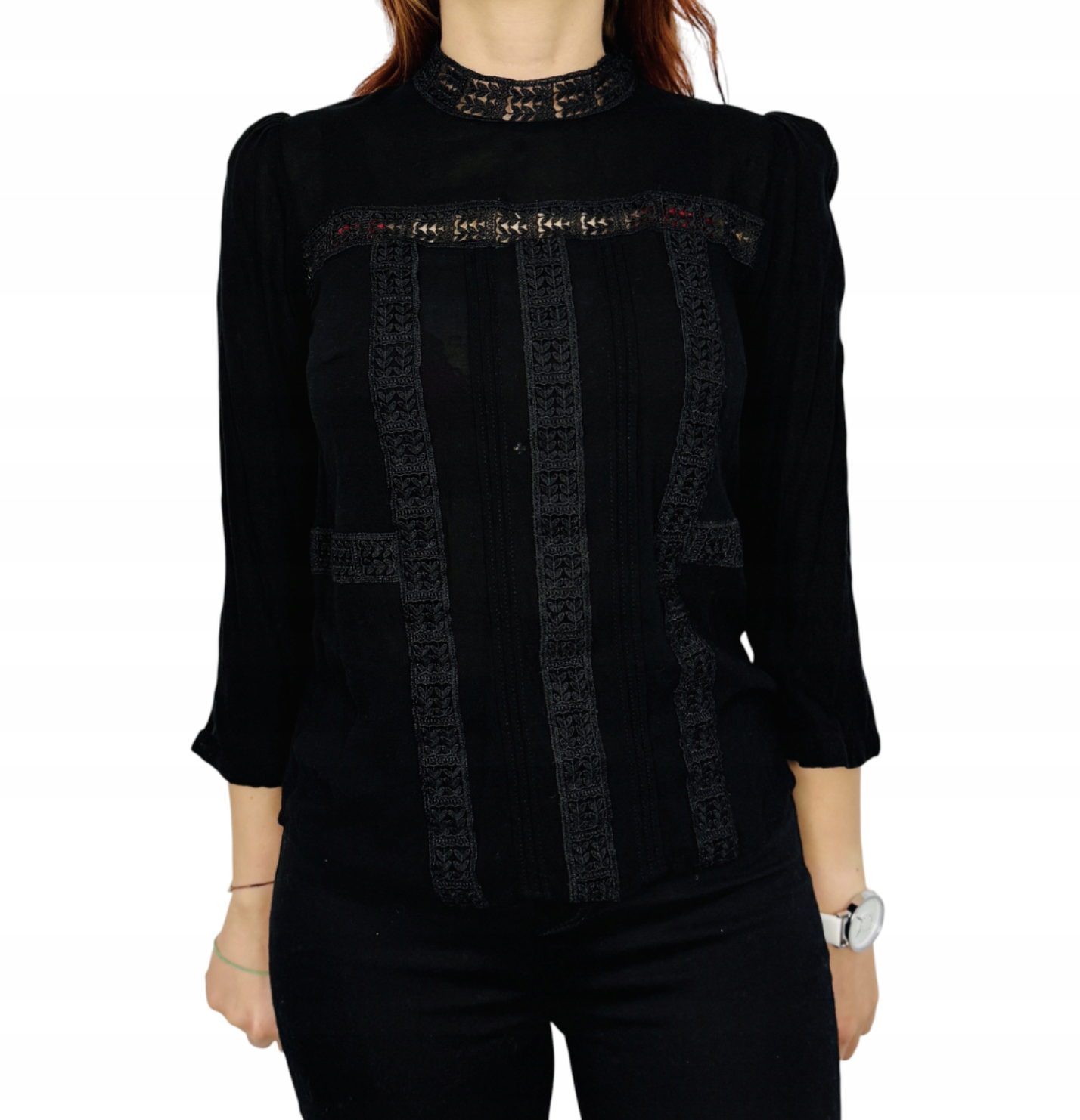 Na przodzie bluzki uwagę przyciągają dekoracyjne pasy z koronki, które układają się w prostokątny wzór, nadając całości struktury i oryginalnego wykończenia. Dzięki nim bluzka nie jest jednolicie czarna, lecz zyskuje głębię i wyraźny akcent dekoracyjny. To rozwiązanie sprawia również, że sylwetka wygląda smuklej, ponieważ pionowe linie optycznie ją wysmuklają.