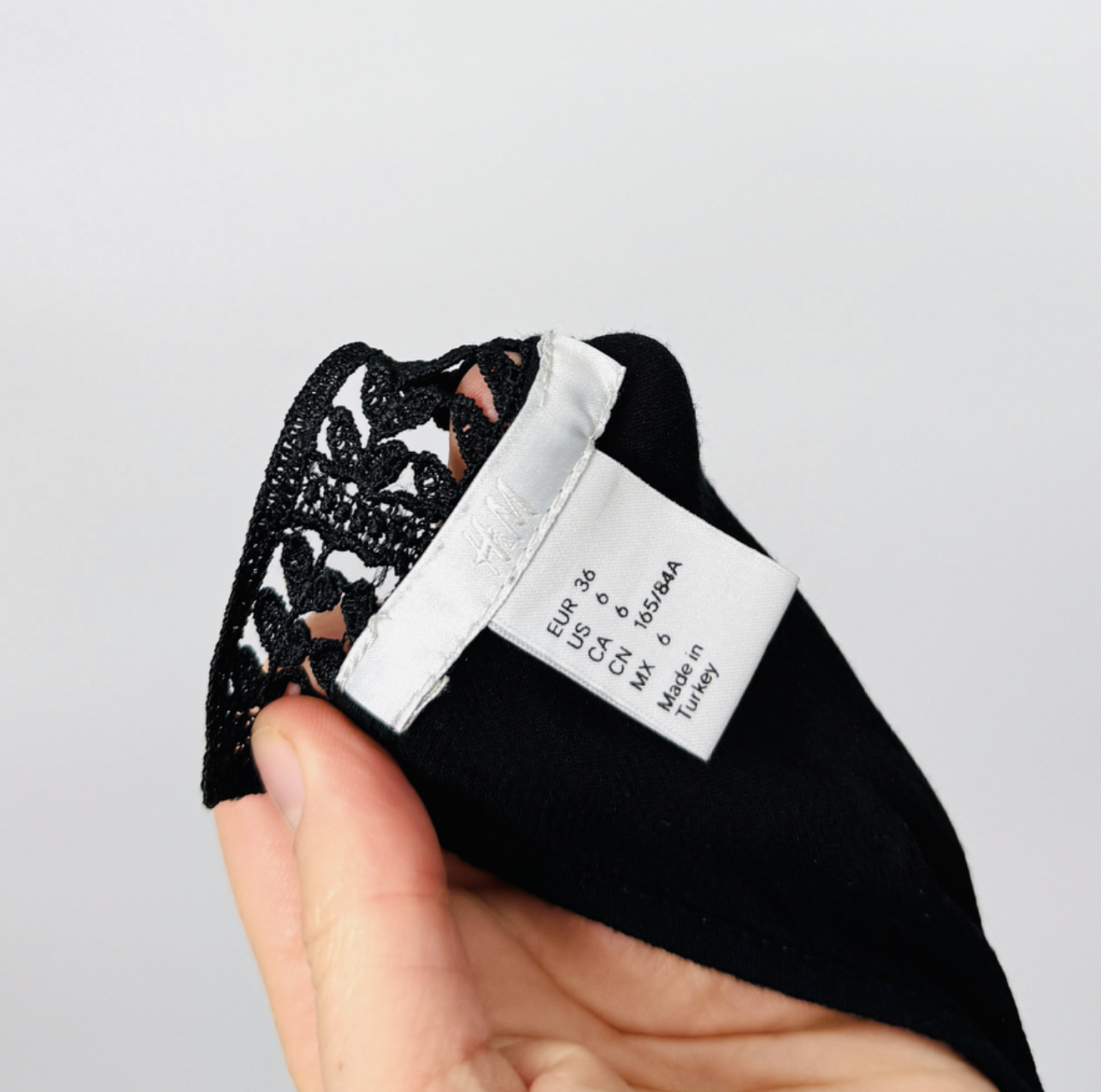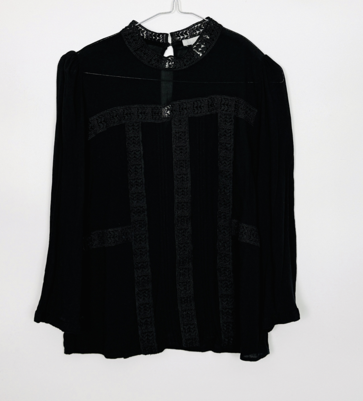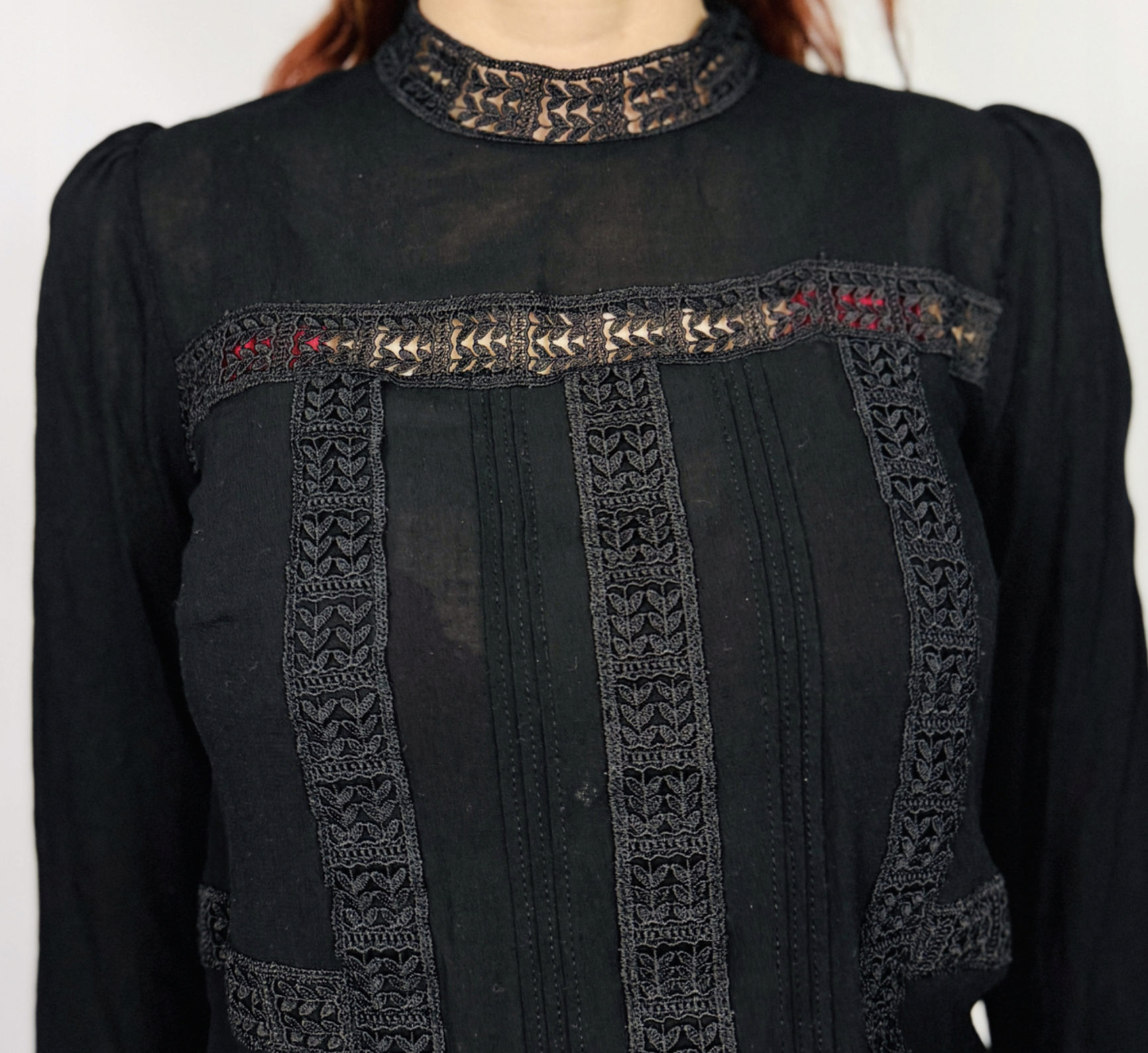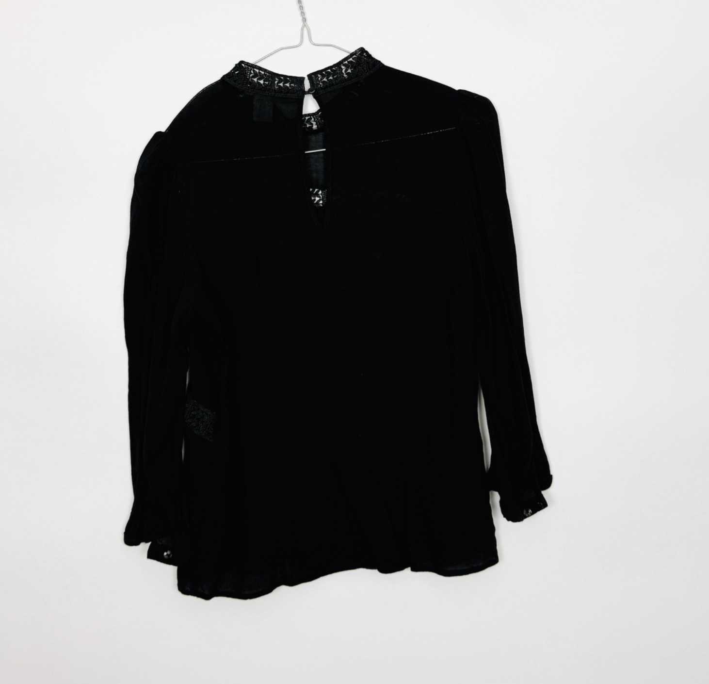 Na przodzie bluzki uwagę przyciągają dekoracyjne pasy z koronki, które układają się w prostokątny wzór, nadając całości struktury i oryginalnego wykończenia. Dzięki nim bluzka nie jest jednolicie czarna, lecz zyskuje głębię i wyraźny akcent dekoracyjny. To rozwiązanie sprawia również, że sylwetka wygląda smuklej, ponieważ pionowe linie optycznie ją wysmuklają.