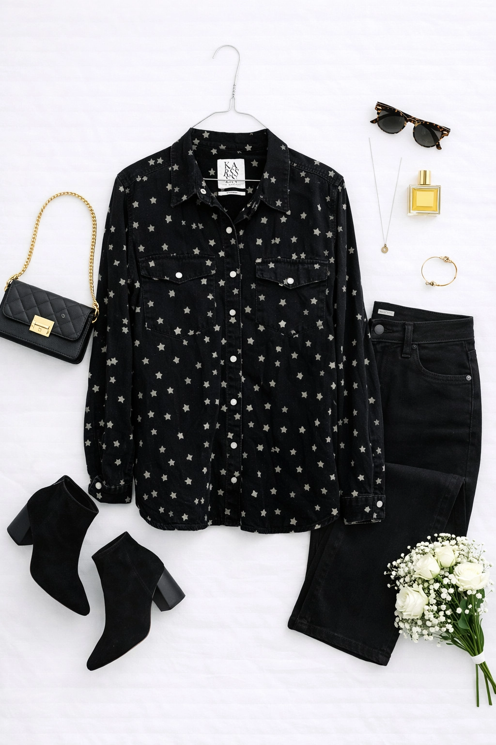 Ta czarna koszula w gwiazdki to połączenie klasycznej elegancji z nutą nowoczesnego, nieco rockowego stylu, który doskonale sprawdzi się w codziennych i wieczorowych stylizacjach. Głęboka czerń tkaniny stanowi idealne tło dla subtelnych, srebrzystych gwiazdek rozsianych równomiernie na całej powierzchni, co nadaje całości wyjątkowego charakteru i lekkości. To ubranie, które łączy w sobie ponadczasowy fason z modnym wzorem, idealne dla kobiet ceniących indywidualność i wyrazistość.