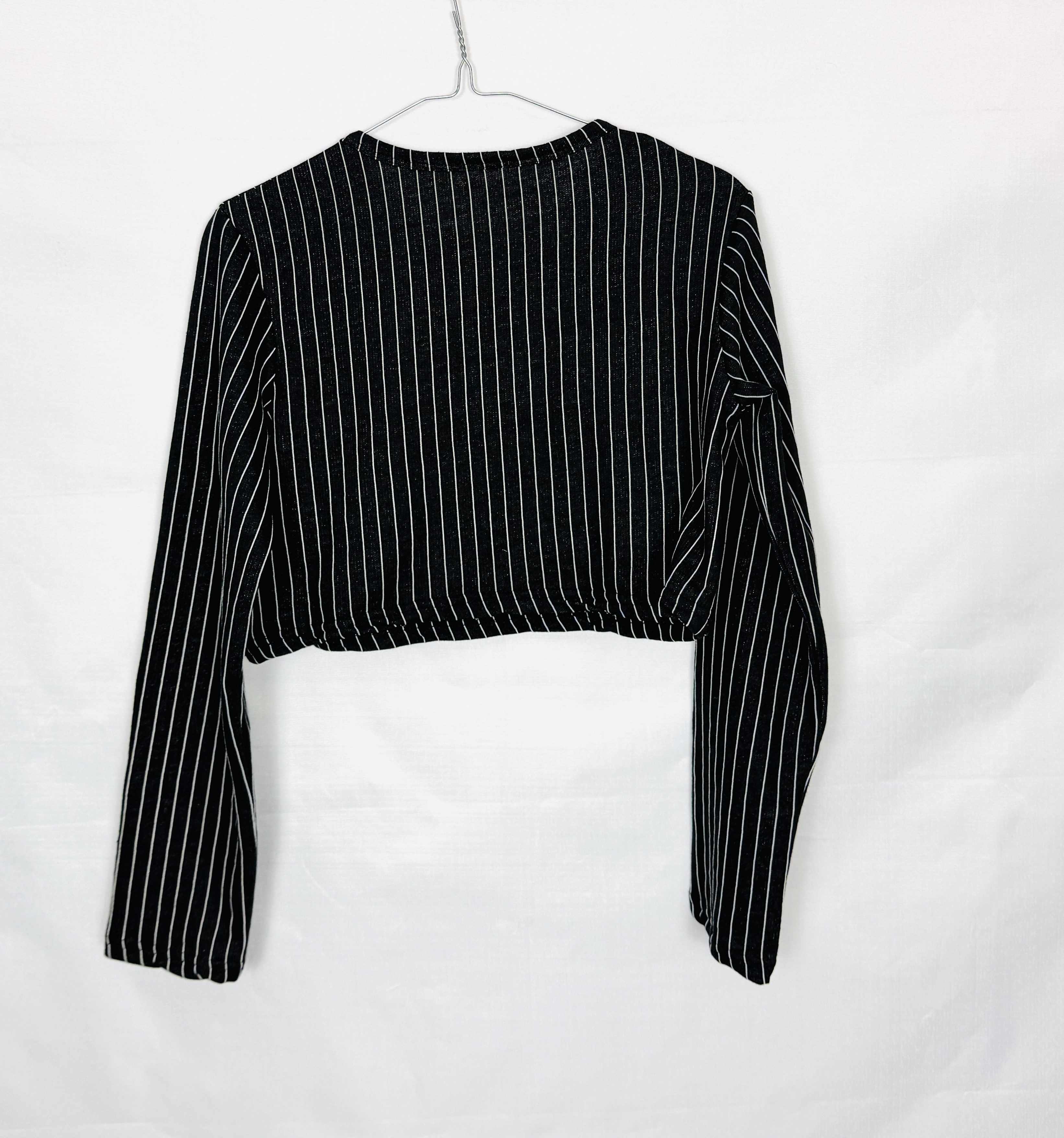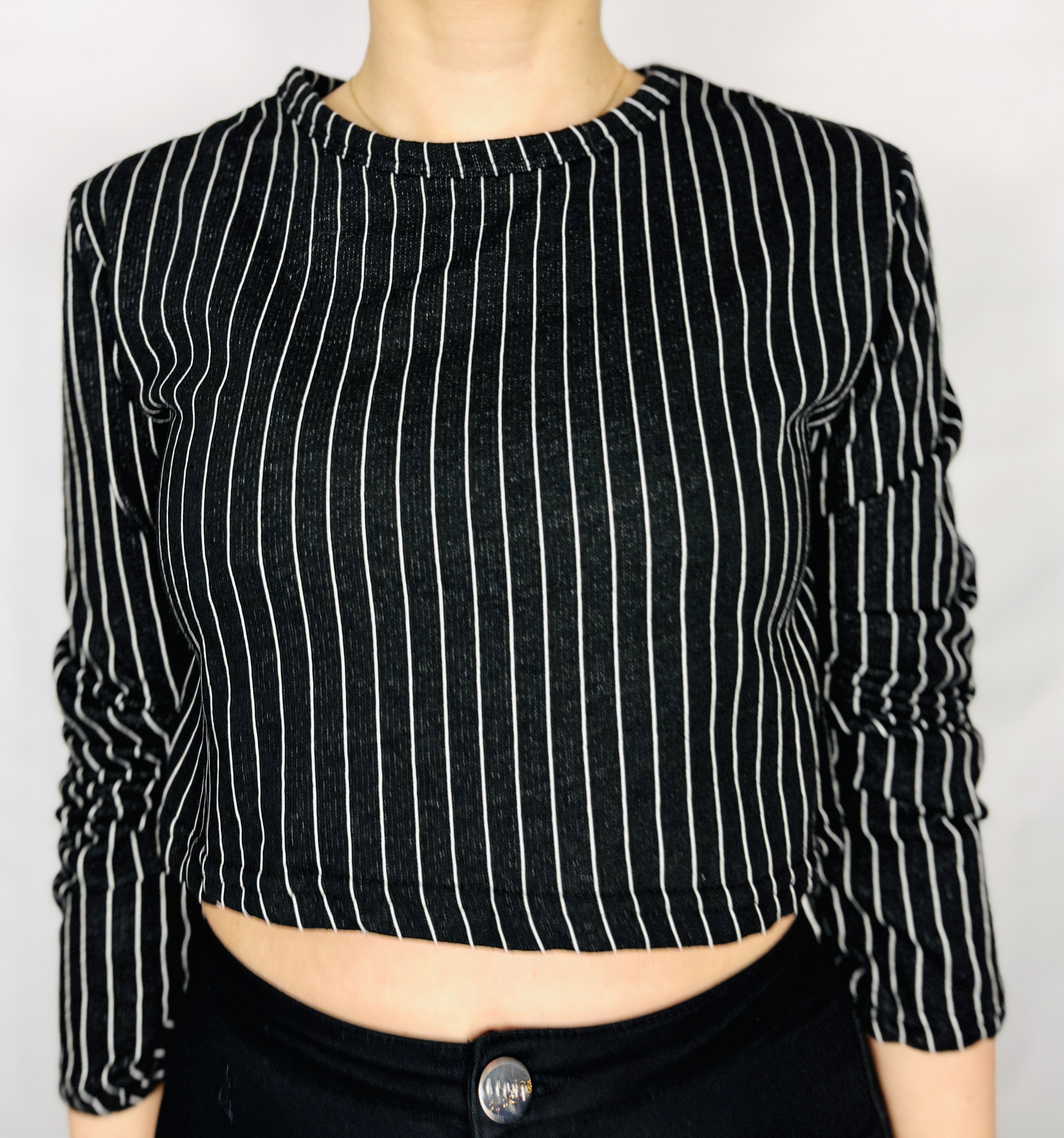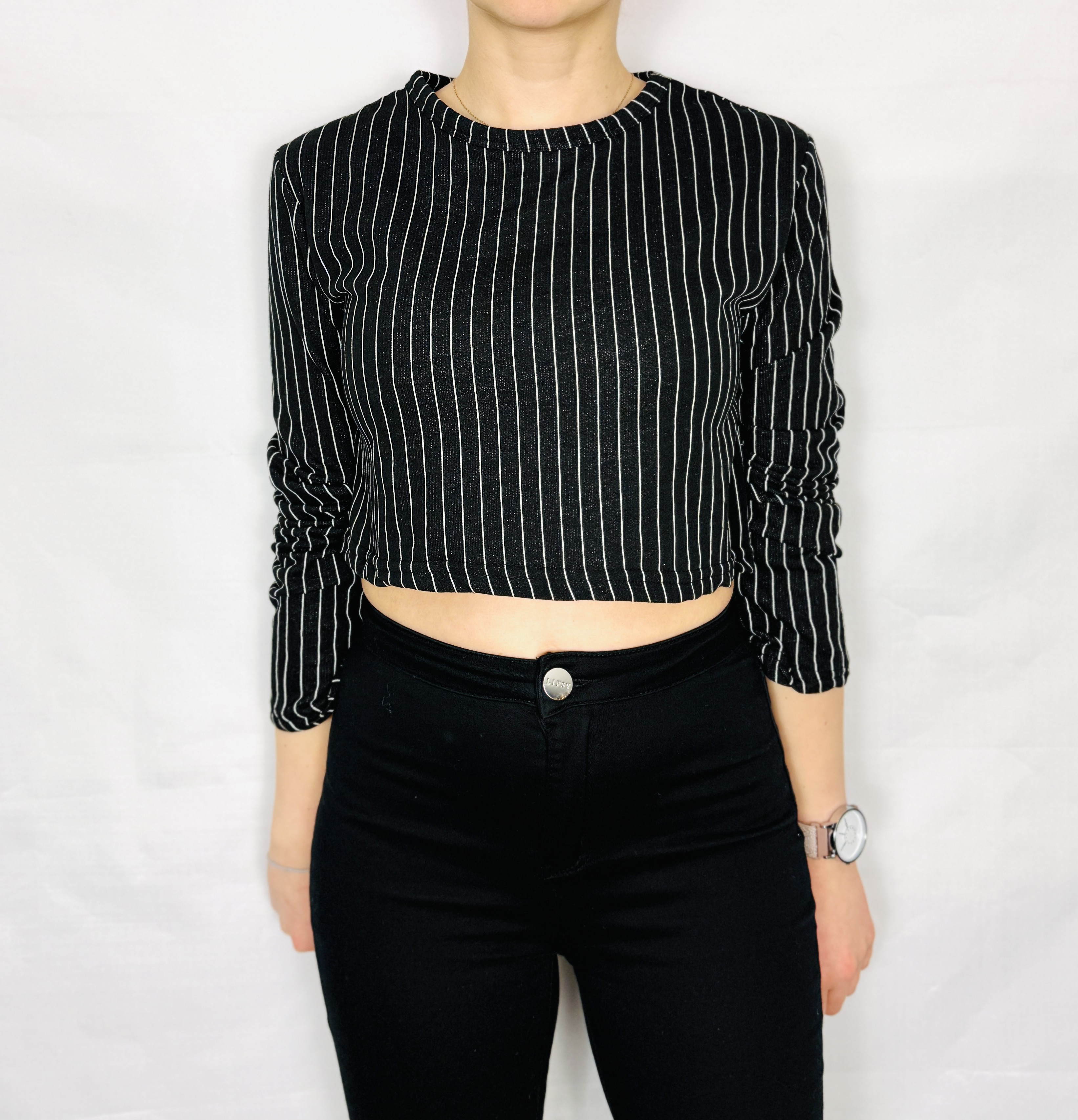 Ta bluza łączy w sobie miejski luz z uporządkowaną, graficzną elegancją — czarne tło przełamane cienkimi, pionowymi białymi paskami nadaje całości świeżego, nowoczesnego charakteru. Krótki fason dodaje lekkości i zdecydowanego wyrazu, dzięki czemu projekt sprawia wrażenie energicznego, kobiecego akcentu w codziennej garderobie. To propozycja dla osób, które lubią prostotę z subtelnym designem — minimalizm spotyka tu odrobinę drapieżności.