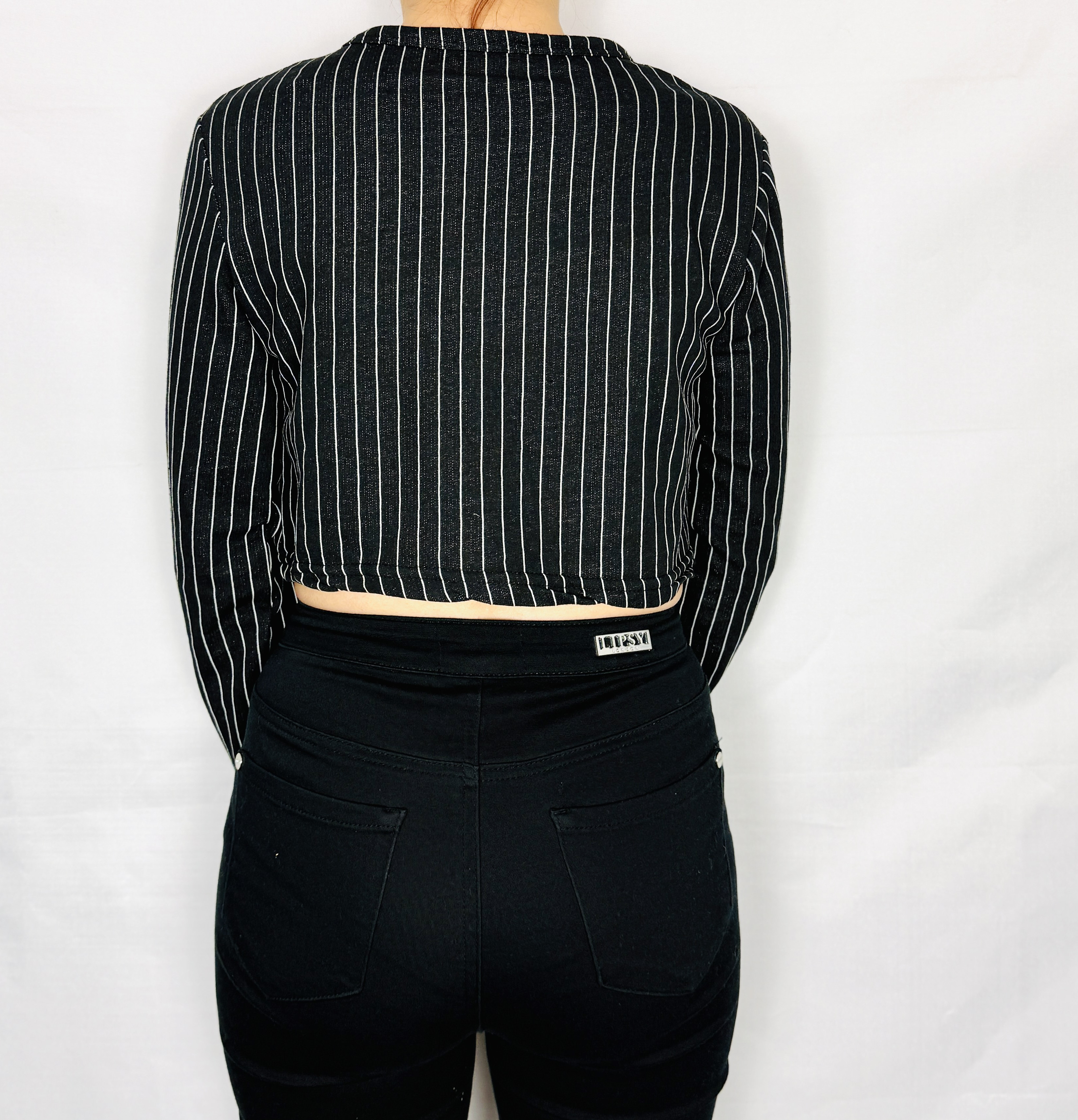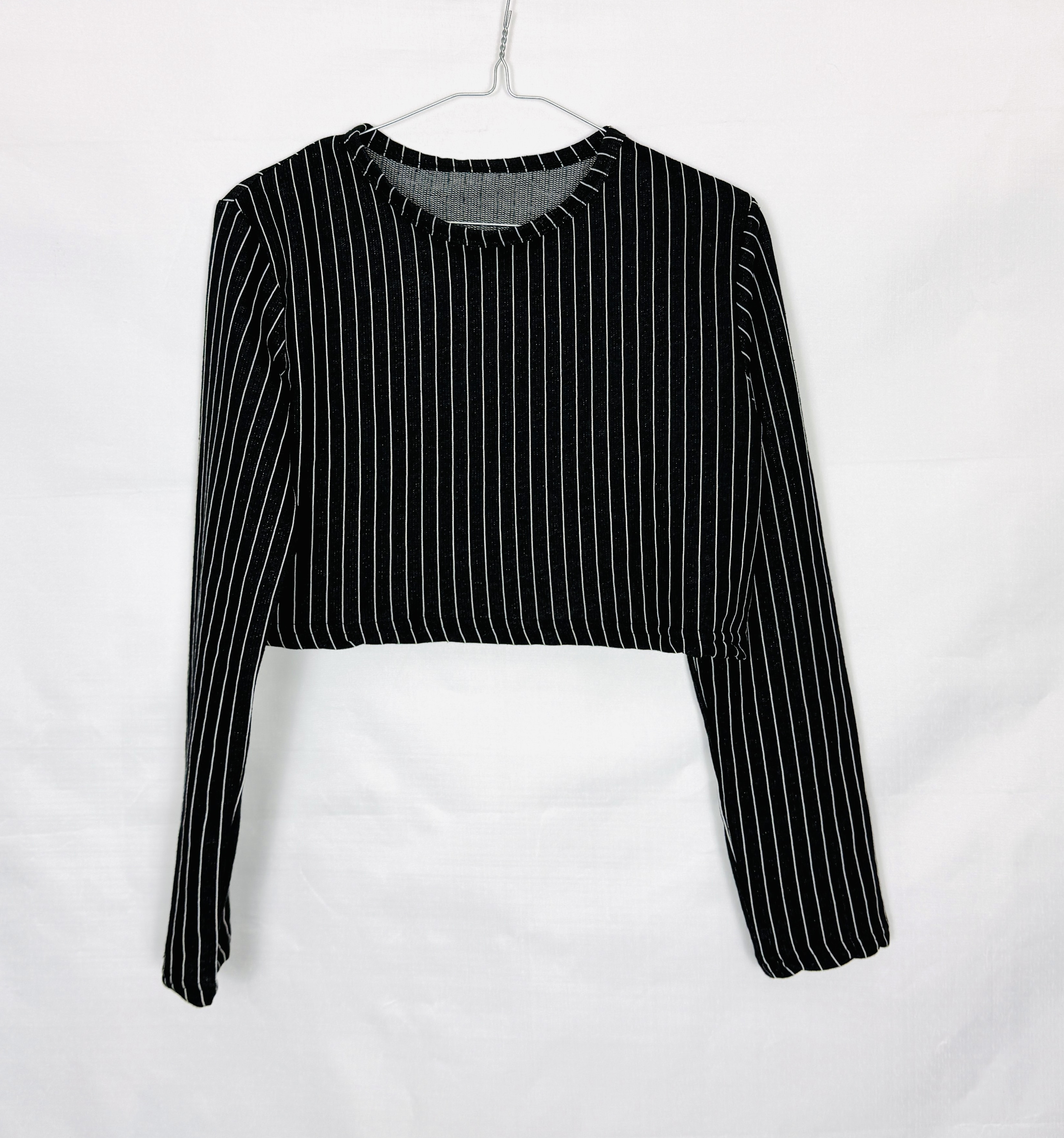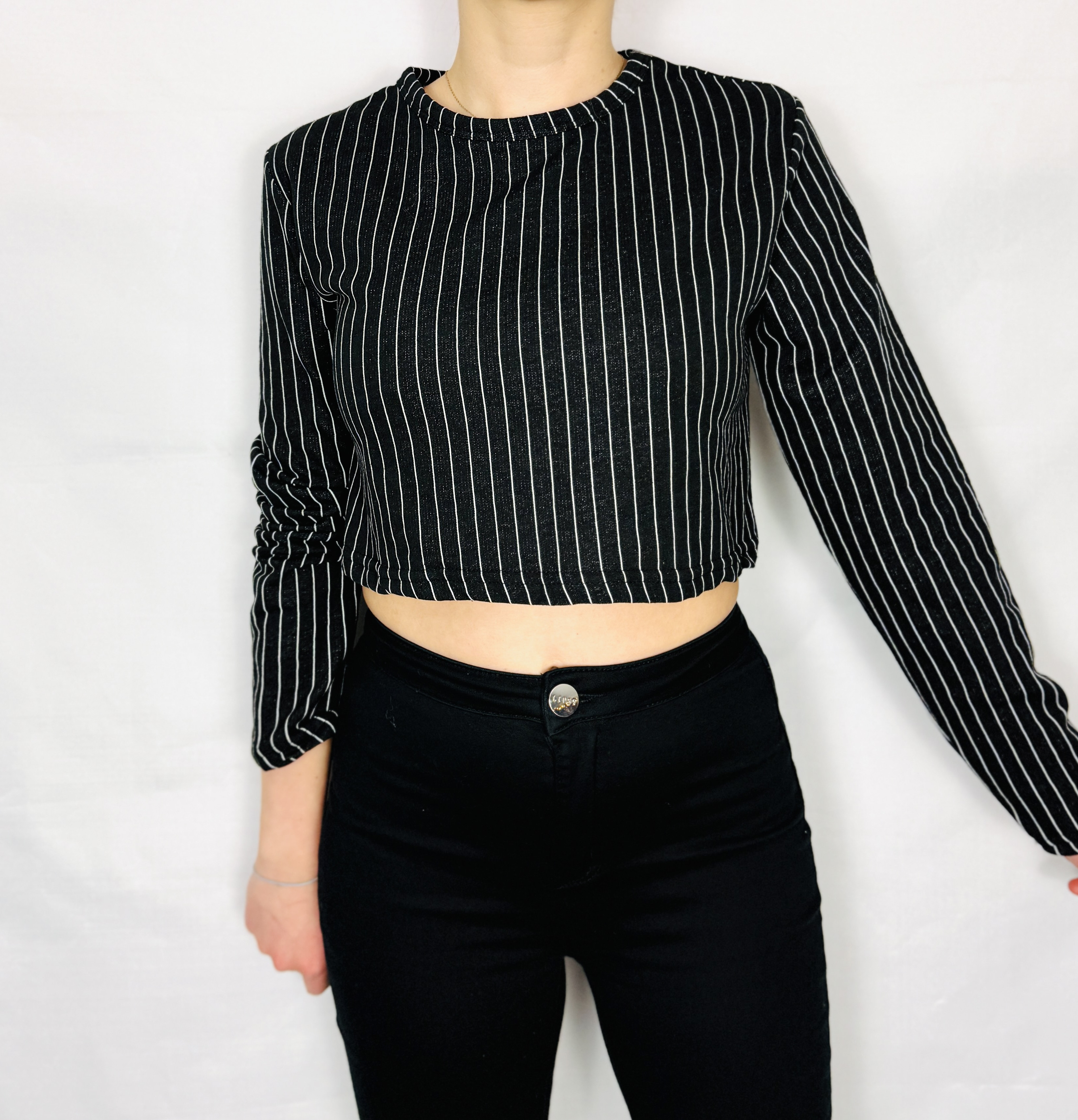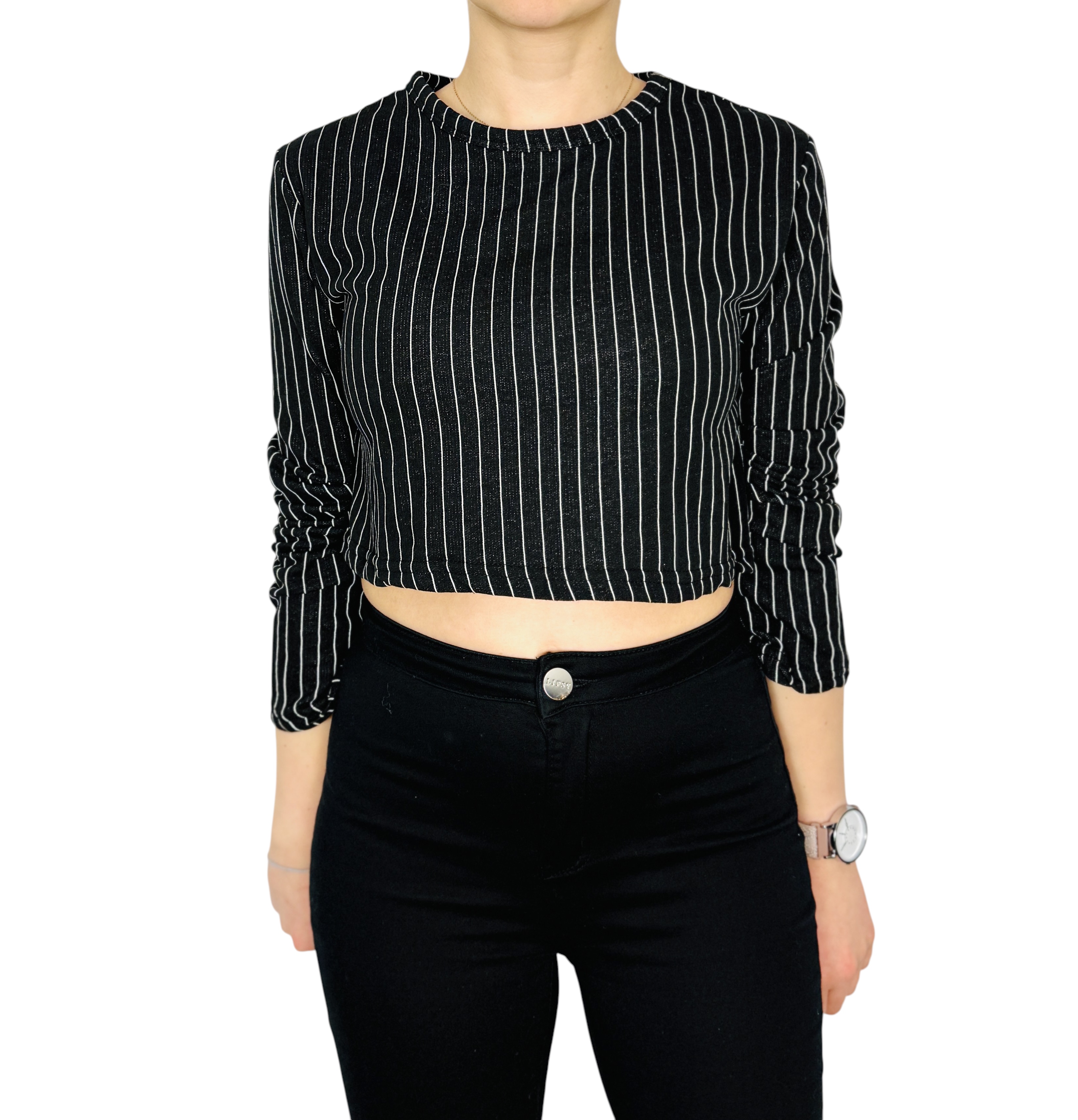 Dekolt ma klasyczną, okrągłą linię z delikatnym prążkowanym wykończeniem, które ładnie ramuje szyję i nadaje górze schludnego rysu. Rękawy są długie i prowadzone w prostej, lekko dopasowanej linii; ich gładkie, jednolite prowadzenie równoważy rytm pionowych pasków i dodaje sylwetce wyrafinowanej harmonii. Fason tułowia jest wyraźnie skrócony — bluza kończy się tuż nad talią, eksponując fragment brzucha i tworząc świeży, młodzieńczy efekt.