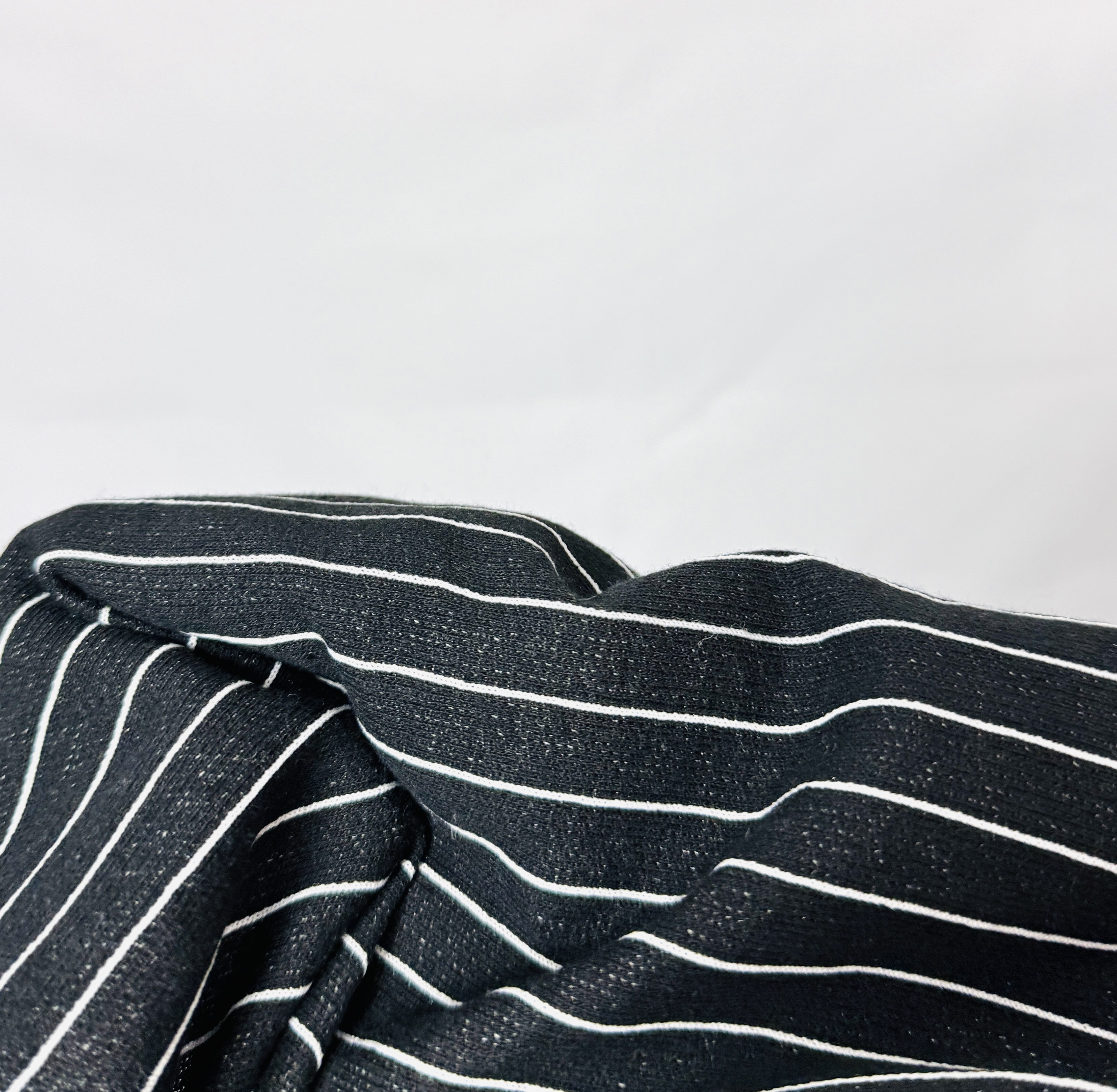 Wzór to regularne, cienkie paski w kontrastowym zestawieniu czerni i bieli, które optycznie wydłużają sylwetkę i nadają smukłości. Kreska pasków jest równomierna i geometryczna, co wzmacnia minimalistyczny, nieprzesadzony charakter ubrania. Materiał prezentuje się jako gładka, nieco strukturalna tkanina o matowym wykończeniu — wygląda na przyjemną w dotyku i lekko układającą się, co sprzyja zarówno noszeniu solo, jak i pod lekką warstwą.