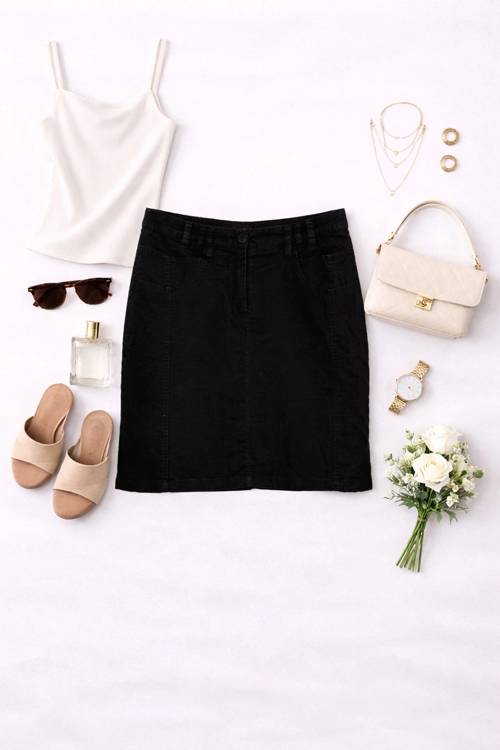 W kwestii stylizacji czarna lniana spódnica to niezwykle wszechstronny element, który odnajdzie się w wielu zestawach. Na co dzień stworzy idealny duet z prostym, białym t-shirtem lub dopasowanym body oraz skórzanymi klapkami, tworząc look pełen miejskiego luzu. Do pracy, w stylu smart casual, świetnie zaprezentuje się w połączeniu z błękitną koszulą wpuszczoną do środka i klasycznymi loafersami, co podkreśli profesjonalny, a zarazem letni wizerunek. Czerń spódnicy przepięknie komponuje się z bielą, beżem, szarością oraz wszelkimi odcieniami złota i srebra. Na wieczorne wyjście wystarczy dodać jedwabny top na ramiączkach i sandałki na szpilce, by uzyskać stylizację pełną klasy i kobiecego wdzięku w bardzo eleganckim wydaniu.